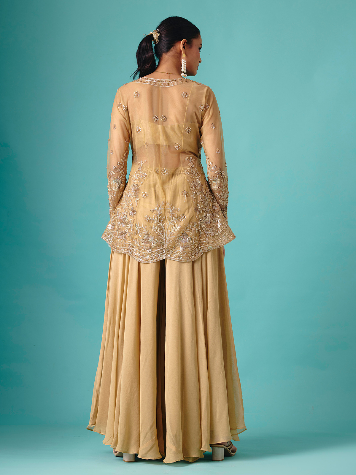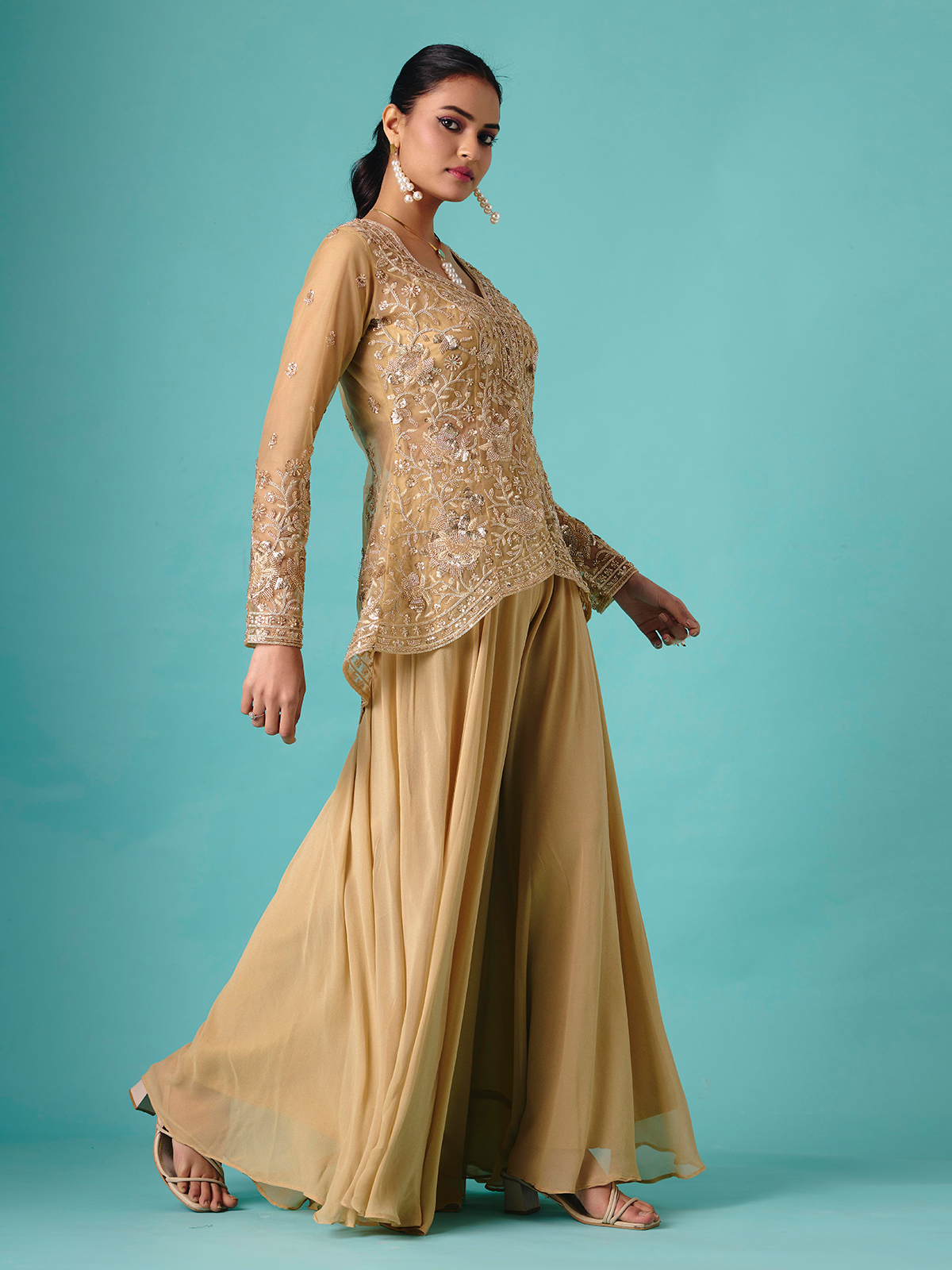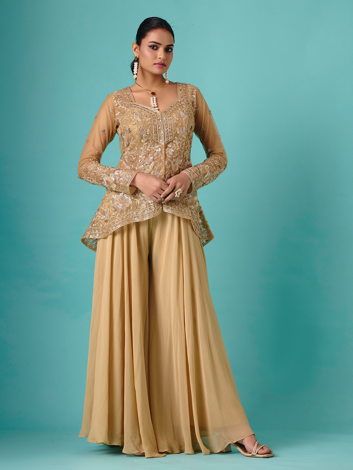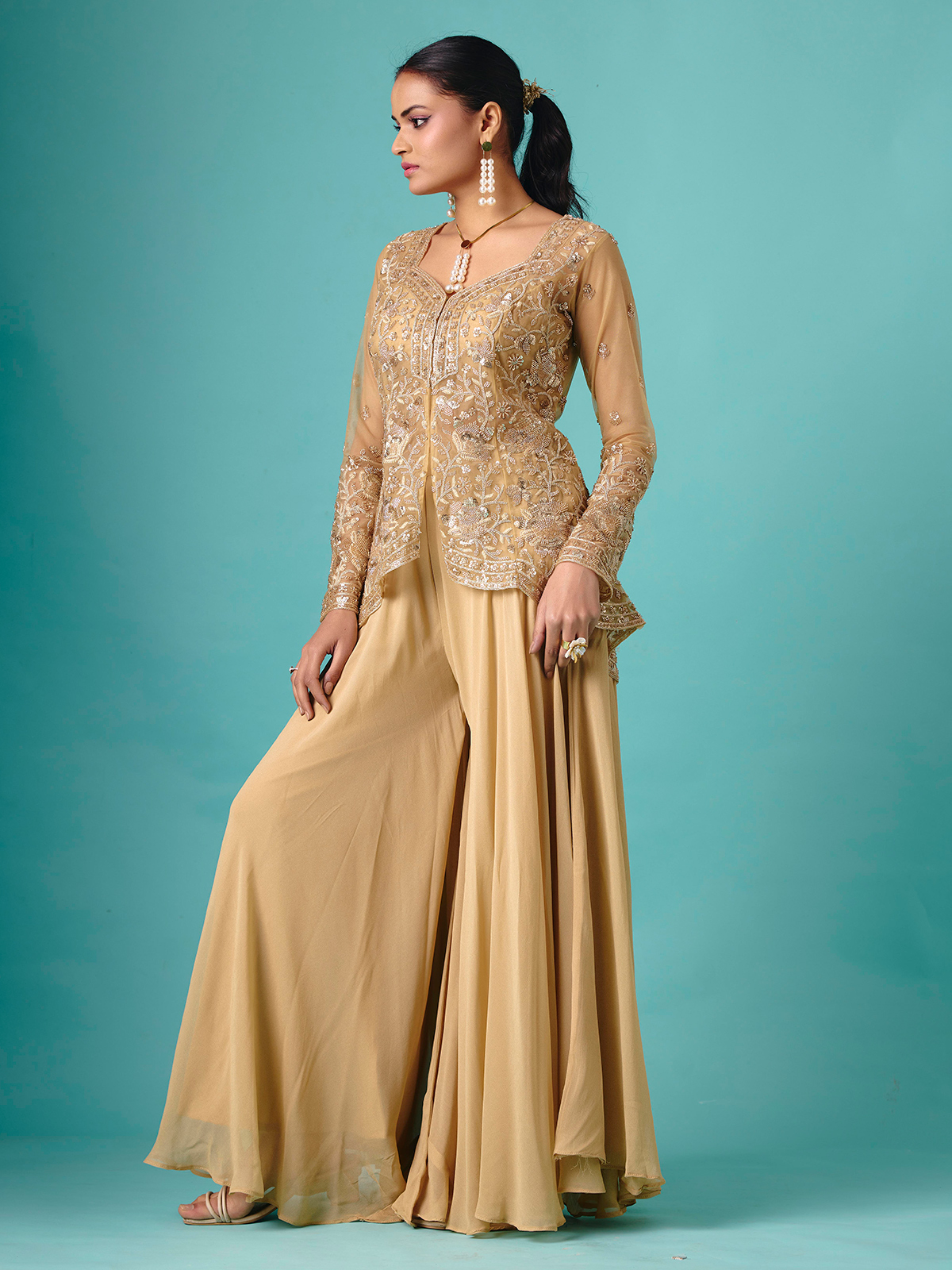 Beige Net Silk Sweetheart Neck Palazzo Suit