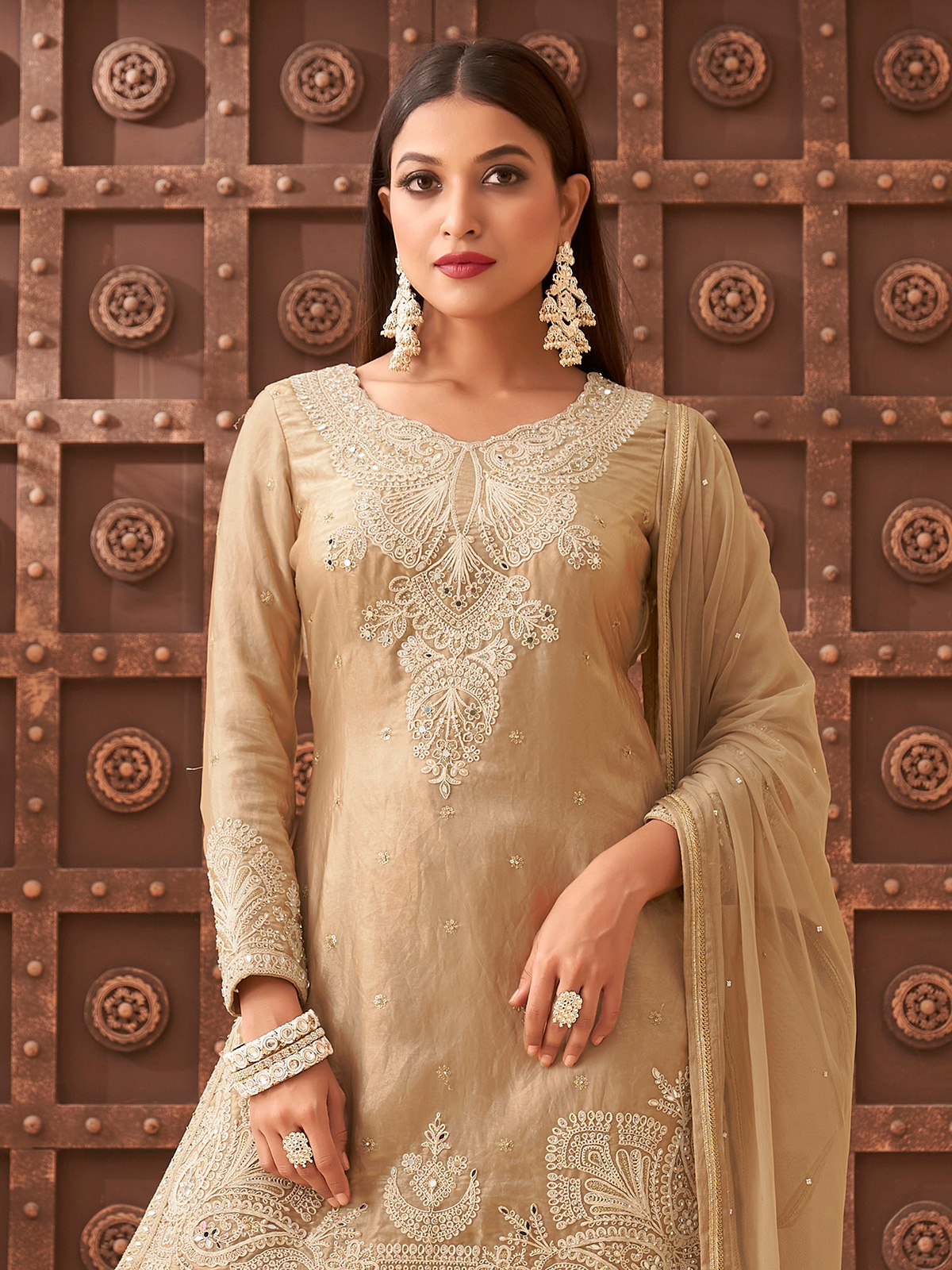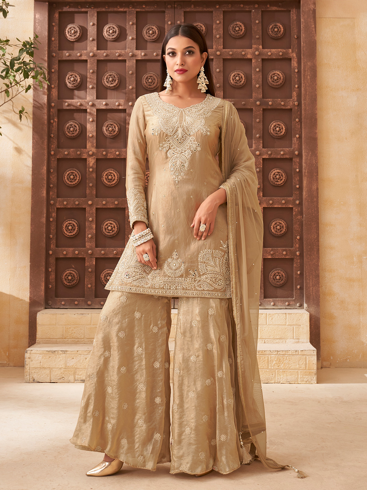 This beige palazzo suit in delicate tissue organza radiates sophistication. Embroidered with thread, mirrors, and sequins, it’s ideal for wedding occasions. The flowy palazzo pants and Pakistani-style dupatta pair beautifully with the U-neck top, offering elegance and comfort to women with a taste for luxurious ethnic wear.