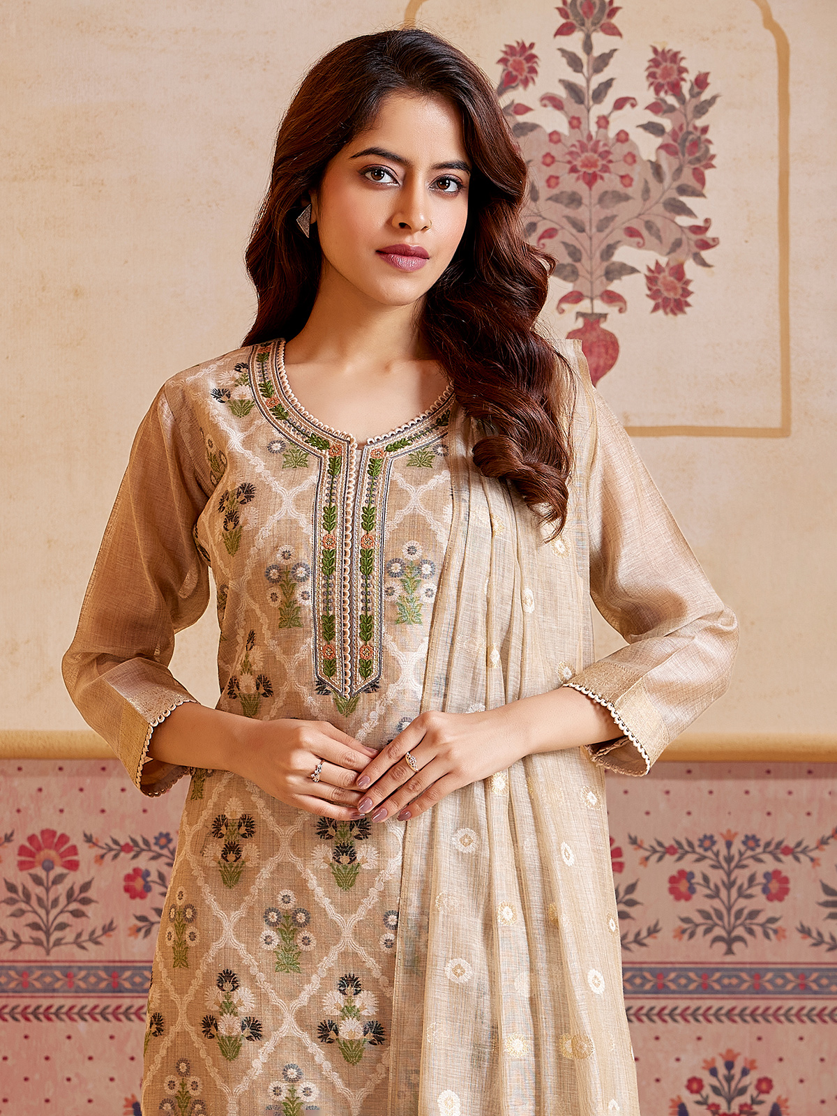A beige cotton silk suit showcases artistic prints and subtle embroidery, forming a graceful blend of tradition and modern style. Featuring a round neckline and quarter sleeves, it comes with pant and dupatta, offering an effortlessly elegant choice for celebratory moments.