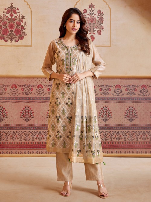 Beige Printed Cotton Silk Festive Salwar Suit