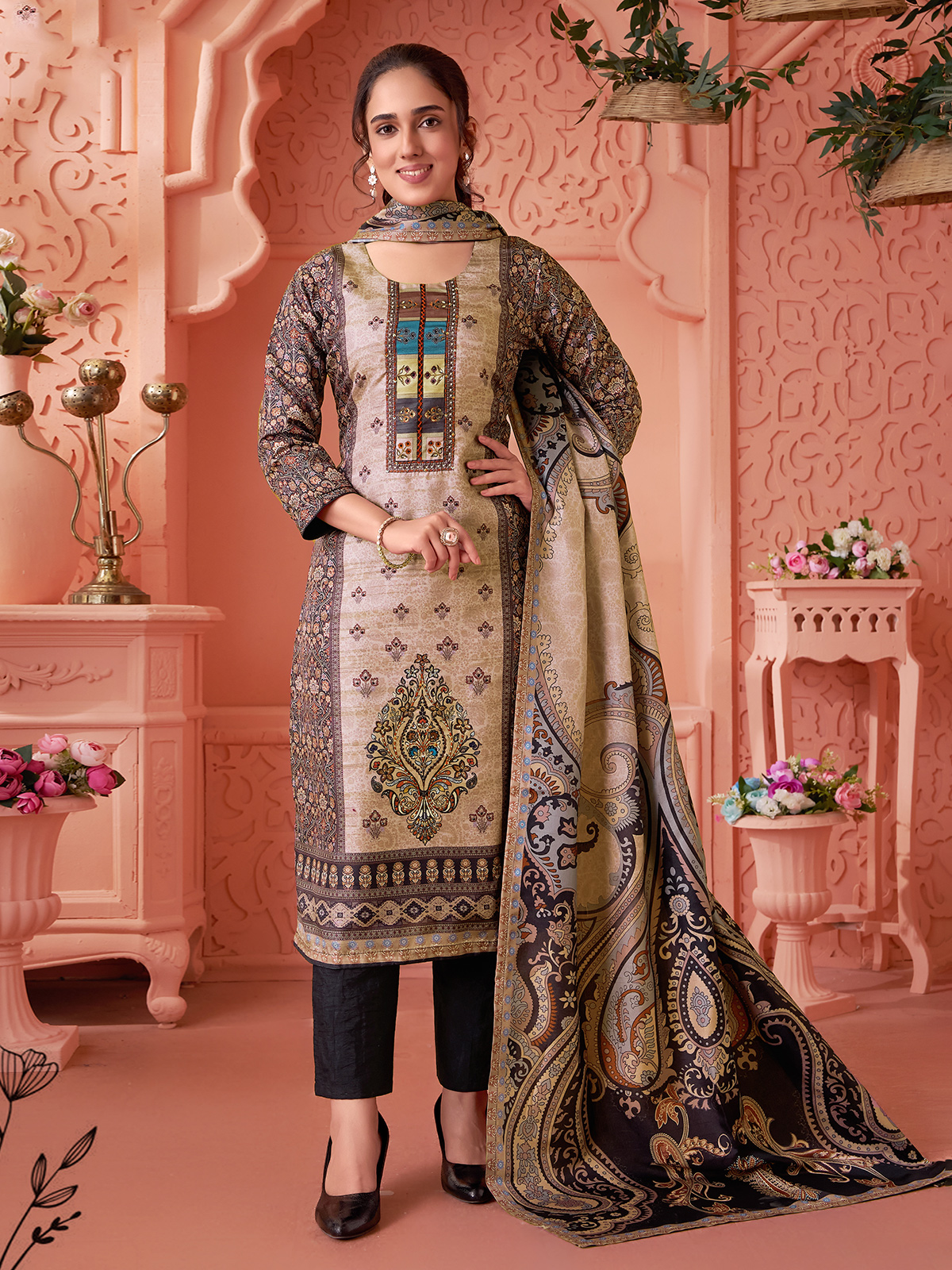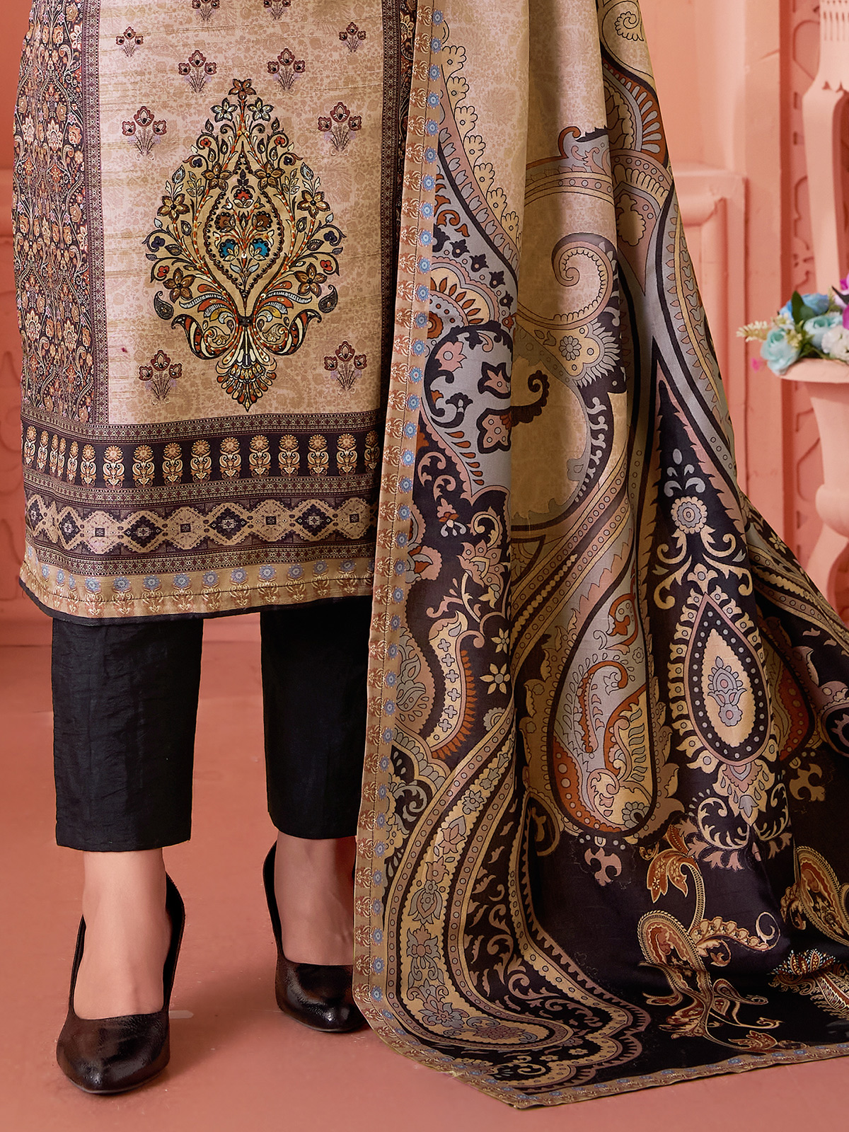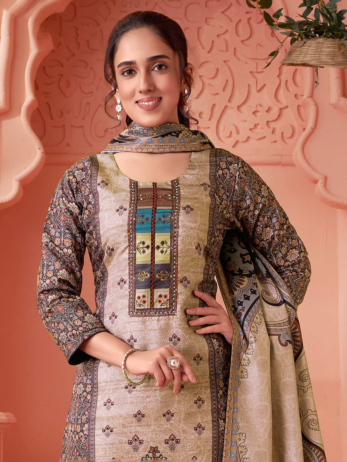 Beige Printed Silk Straight Cut Festive Wear Salwar Suit