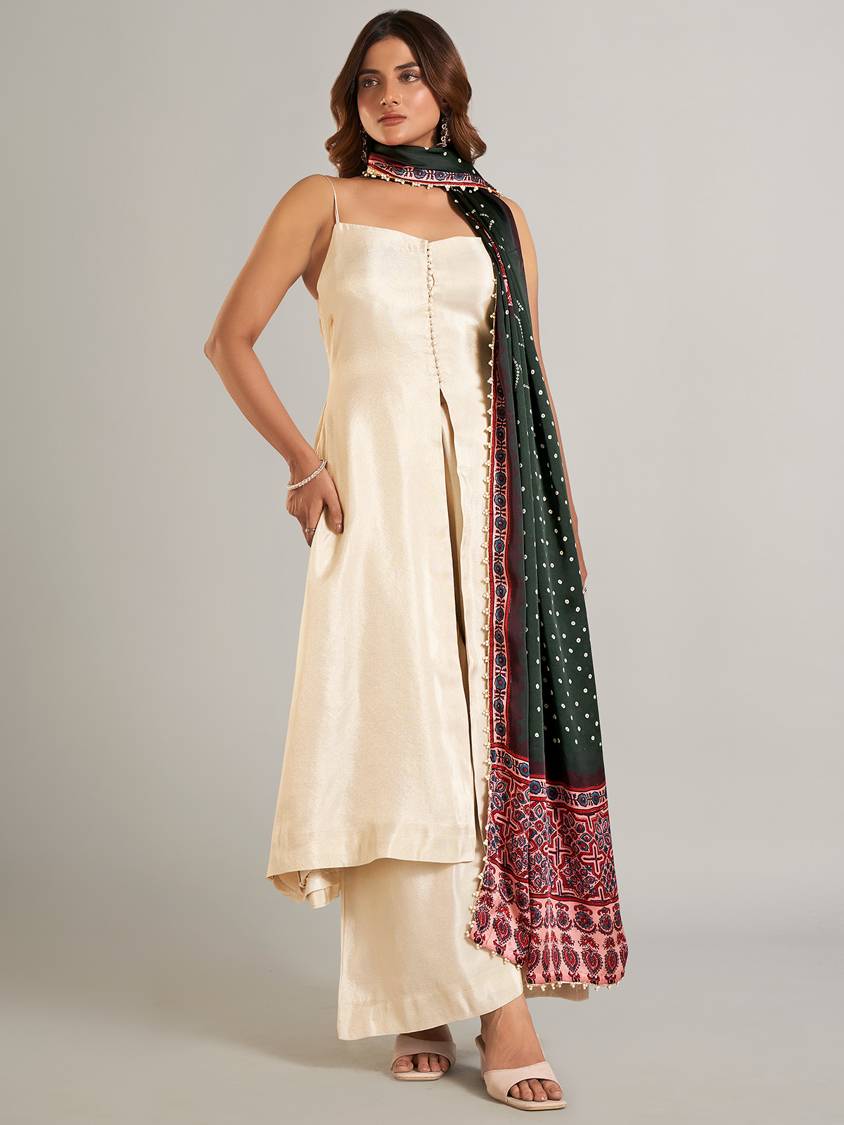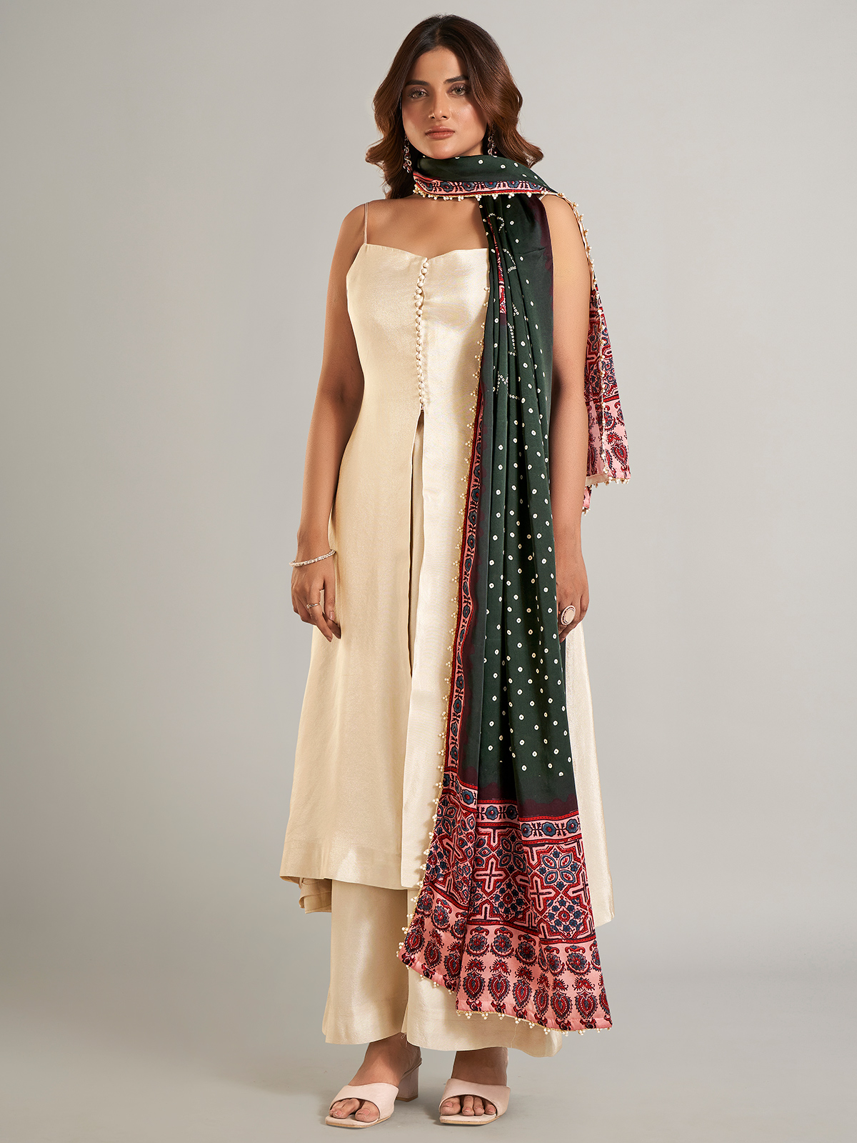 Elegance unfolds in this beige silk palazzo suit, featuring a modern sleeveless kurta paired with soft, wide-leg palazzos. The gently printed dupatta adds a graceful touch, creating a look that feels festive yet easy to wear perfect for Diwali gatherings, family celebrations, and joyful evenings.