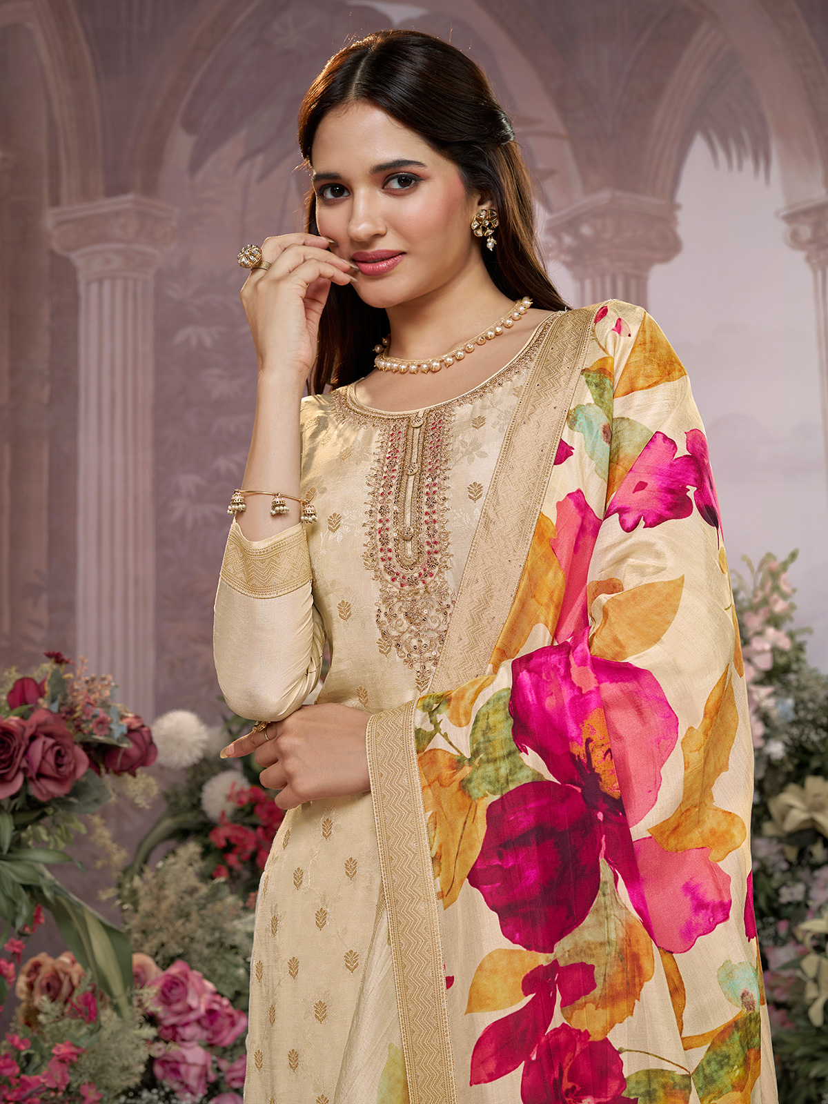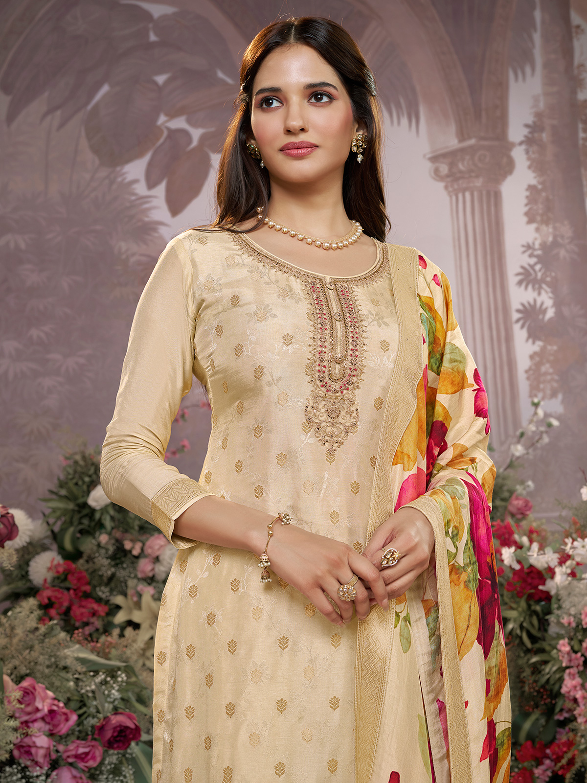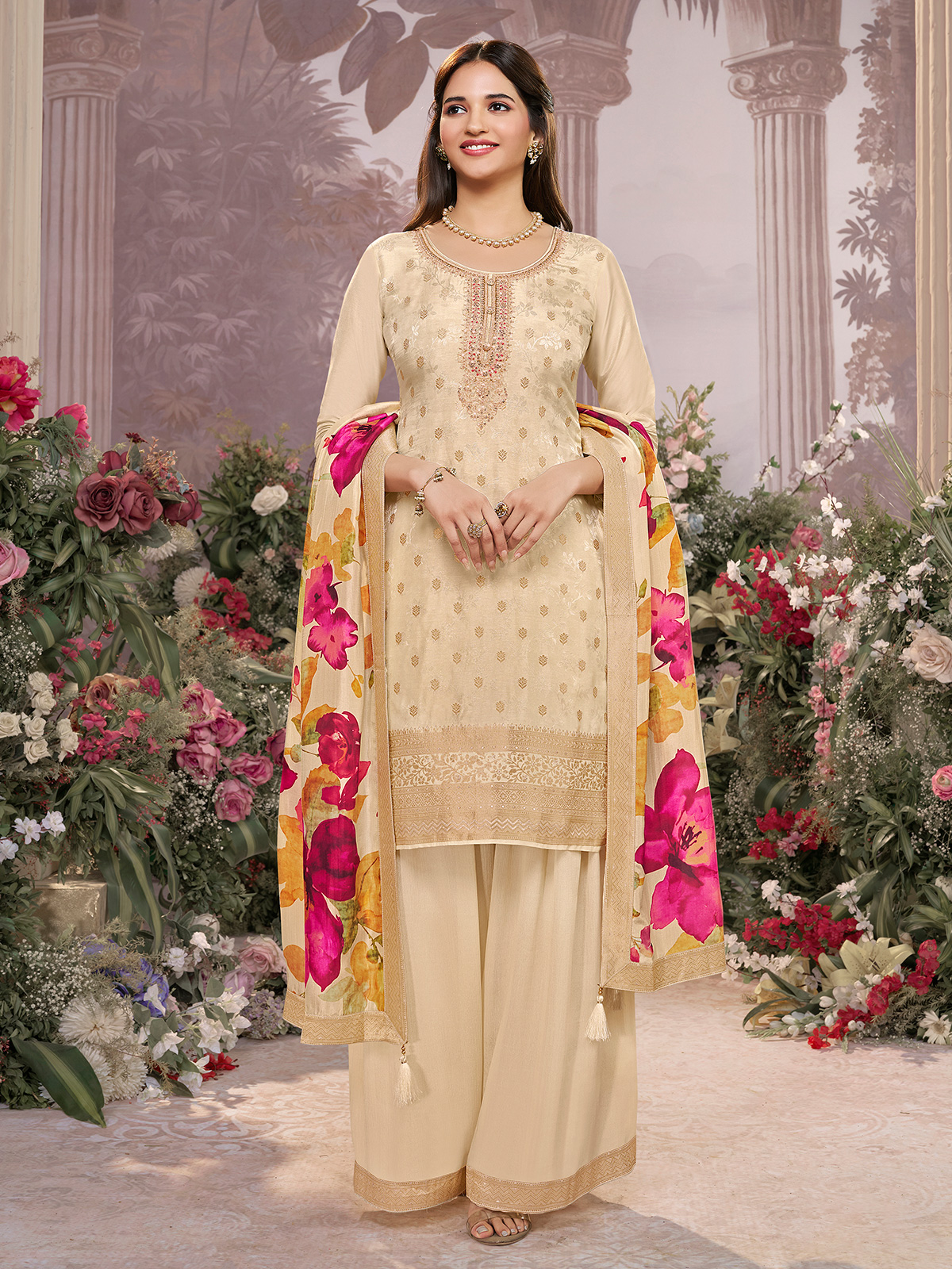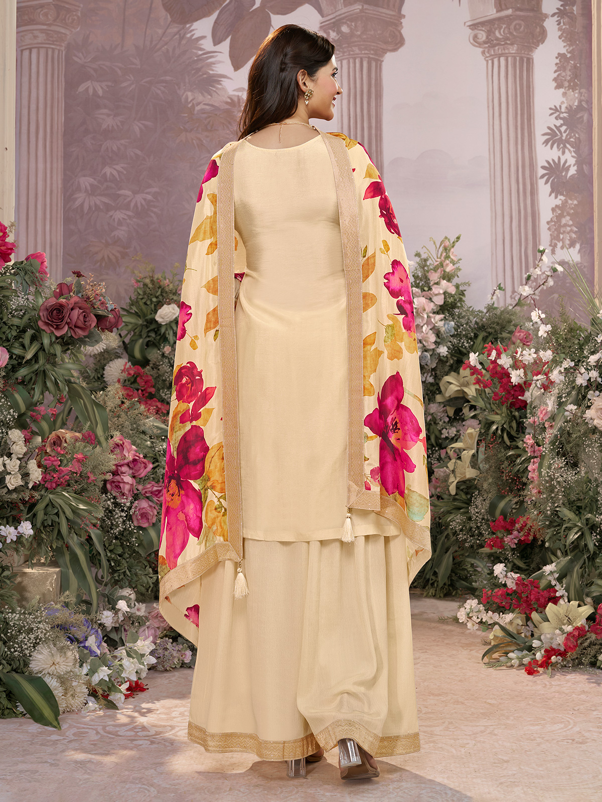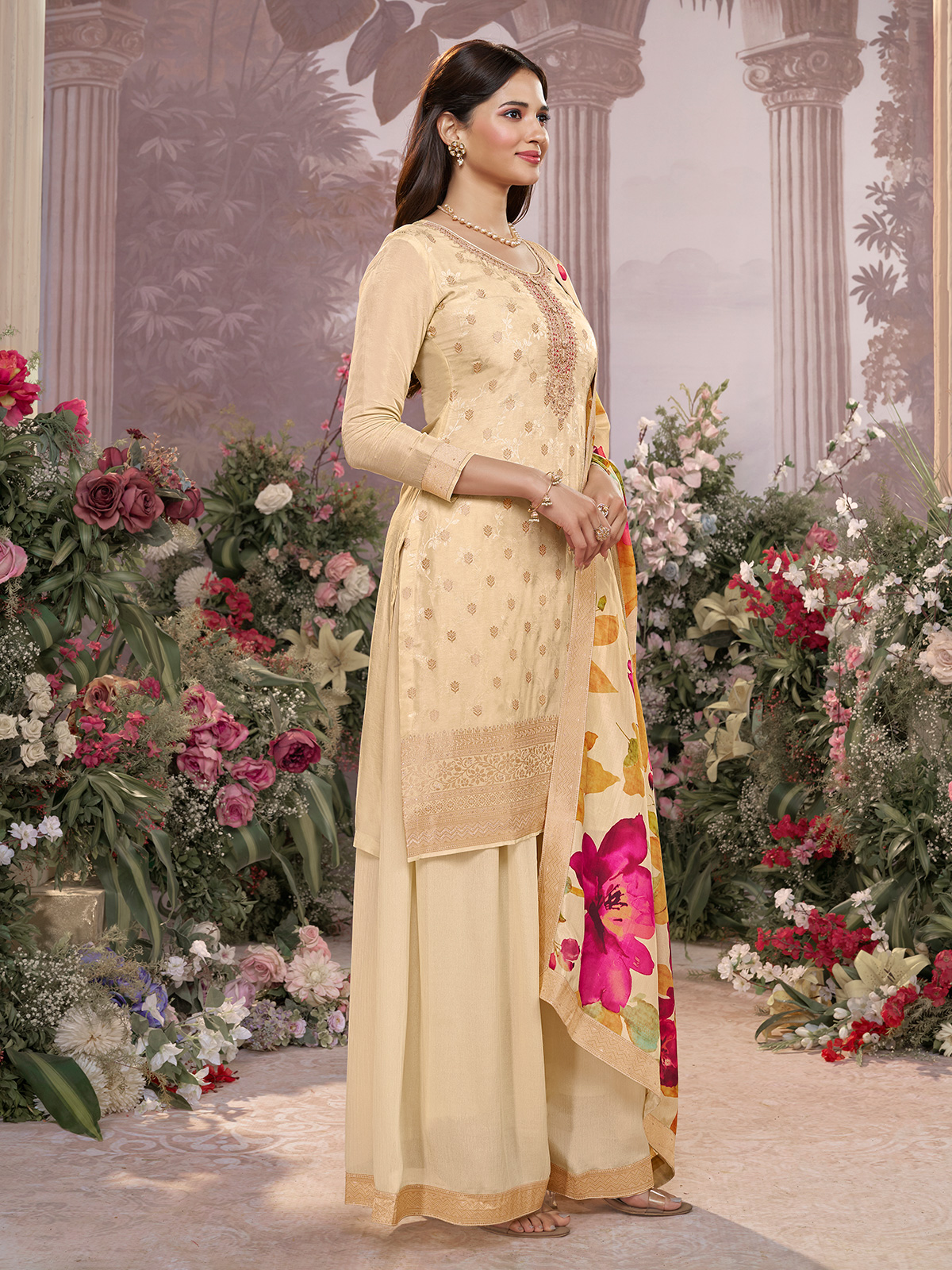 Beige silk exudes graceful elegance, adorned with resham, zari, cutdana, and sequins glowing like subtle treasures. A round neckline with quarter sleeves enhances its charm, complemented by palazzo and dupatta. A festive ensemble that reflects timeless artistry and refined tradition, ideal for celebrations filled with charm.