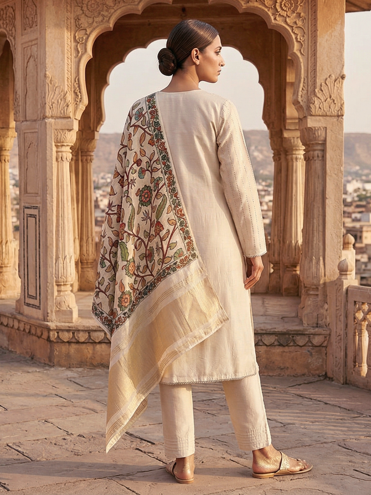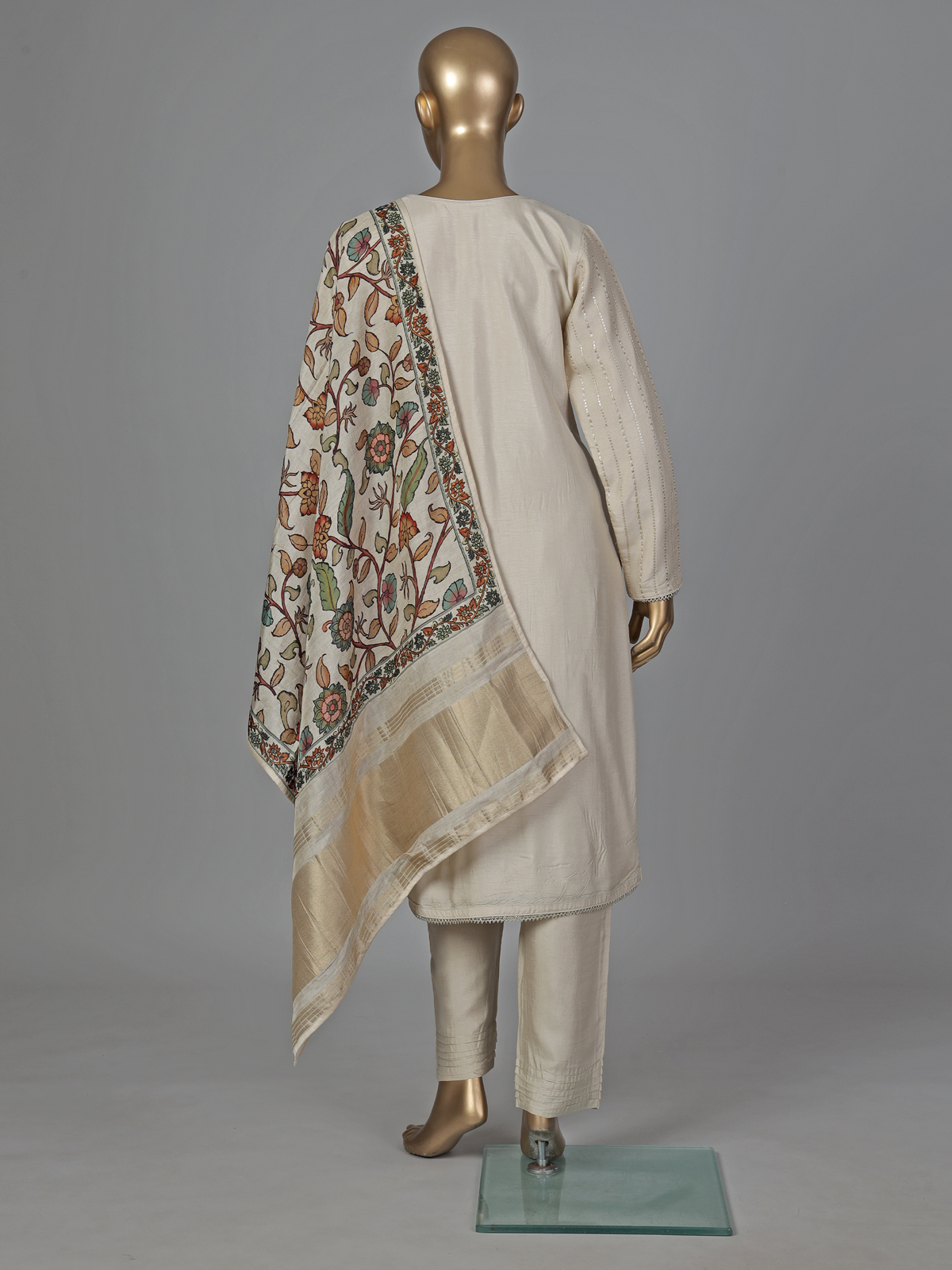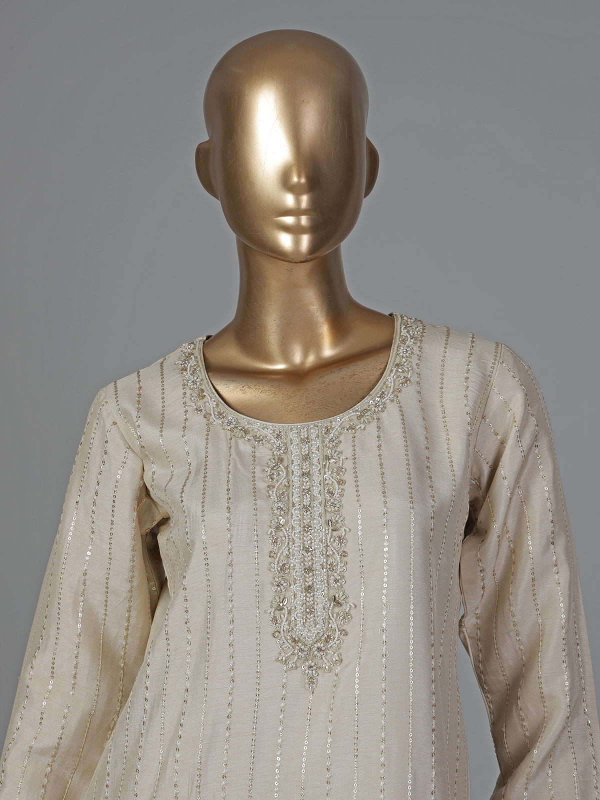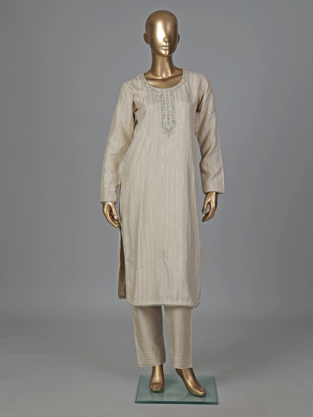 Elegant beige tones highlight the richness of this silk salwar suit. Beautifully adorned with cutdana, sequins, beads, diamond and pearl detailing. Featuring a round neckline and full sleeves. It is paired with a graceful dupatta. Perfect for weddings and festive celebrations. This ensemble exudes refined and timeless sophistication.