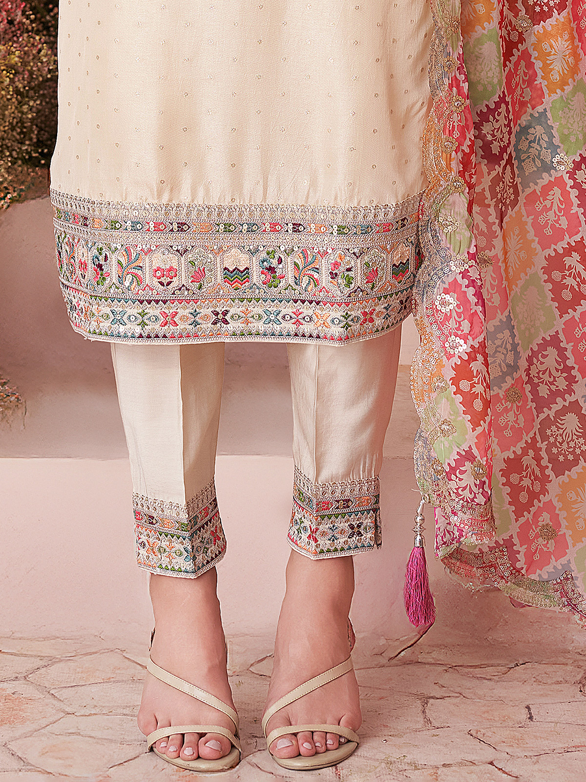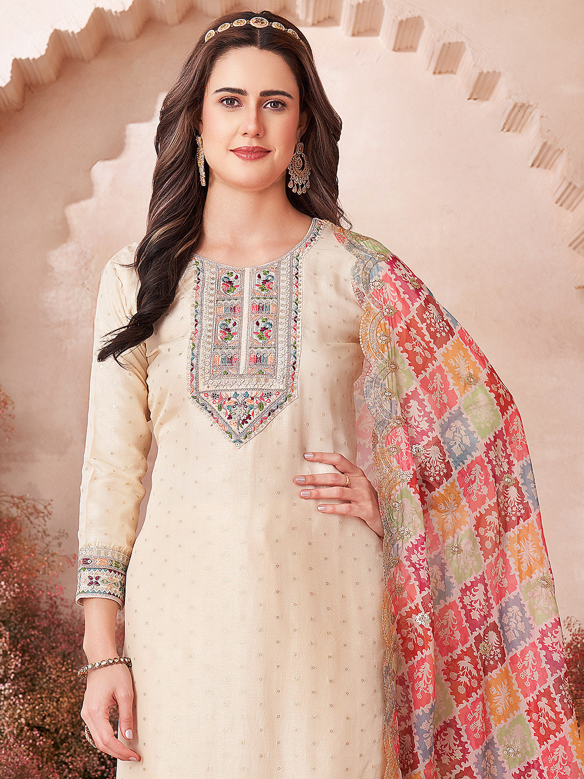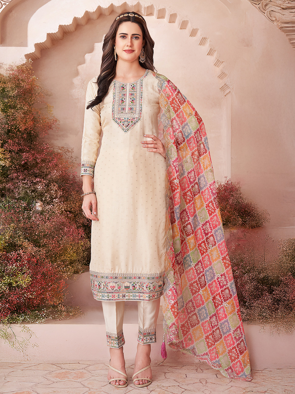 Beige Silk Salwar Suit With Multicolor Dupatta Accent