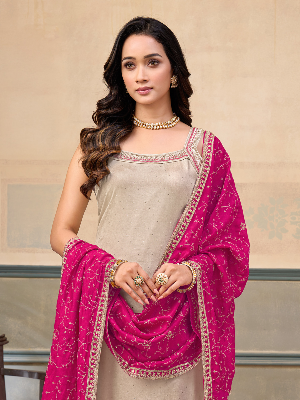 Elegant beige tones enhance the charm of this silk straight cut salwar suit crafted for festive wear. The kurti features a stylish square neckline with a sleeveless silhouette. Adorned with embroidery and sequin detailing that adds subtle sparkle. Styled with pants and a contrast magenta dupatta. The ensemble creates a graceful and modern festive statement.