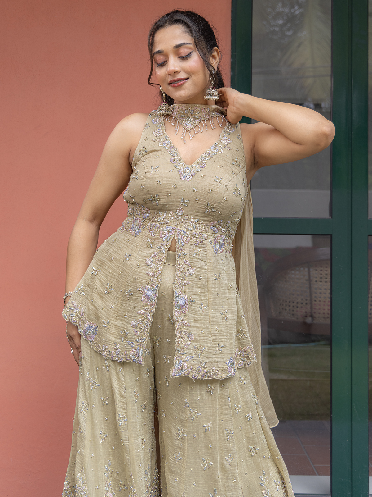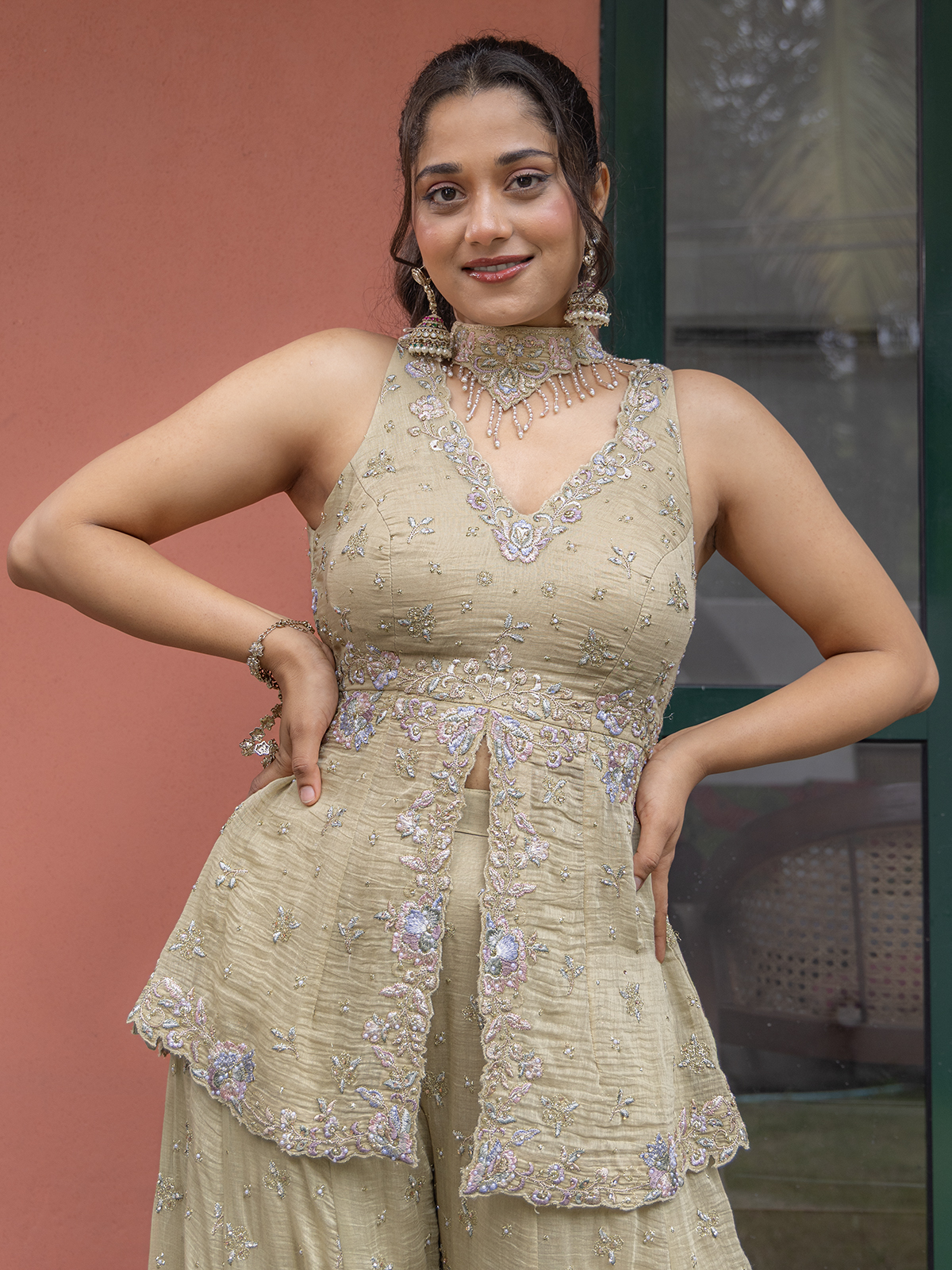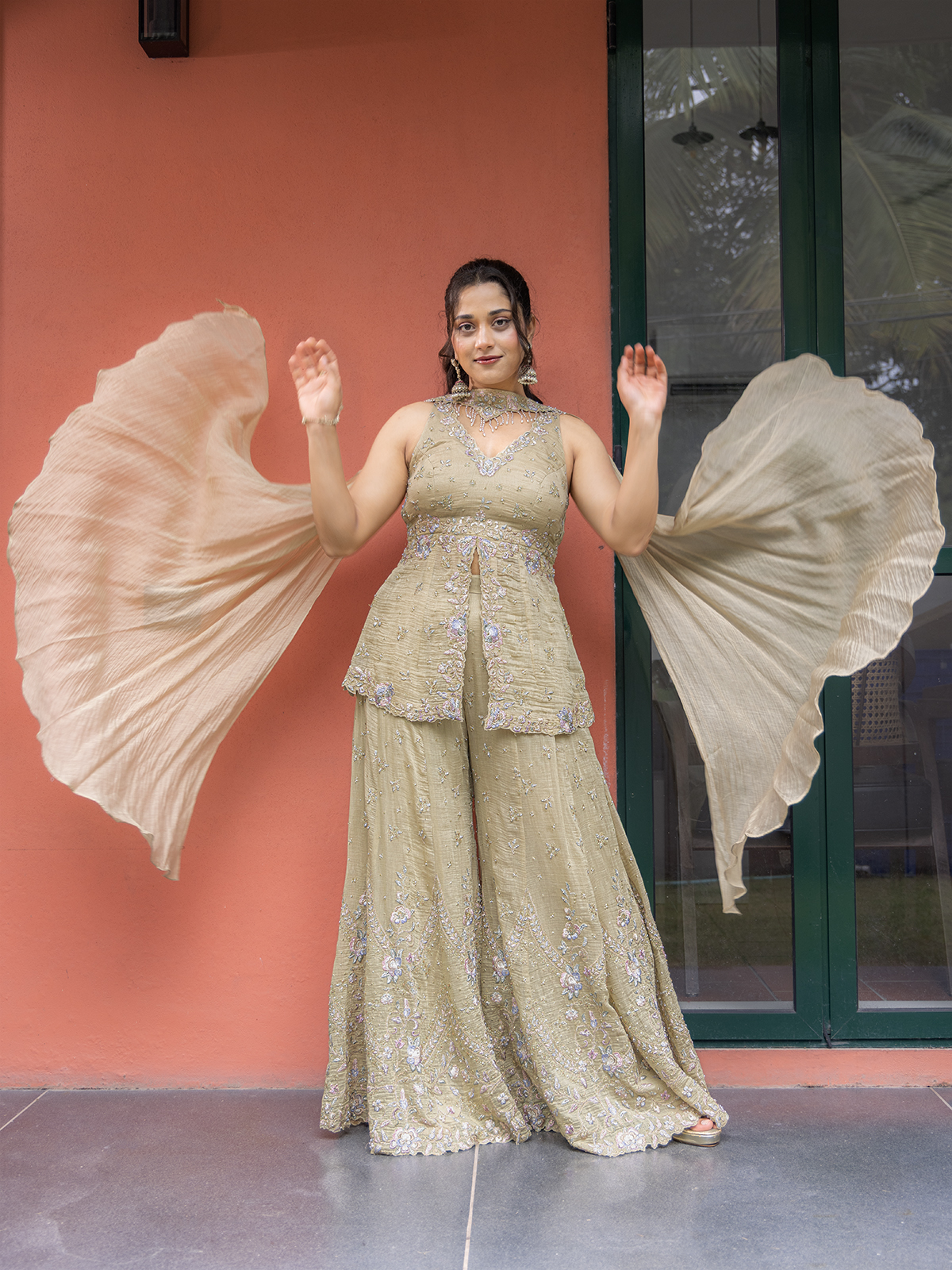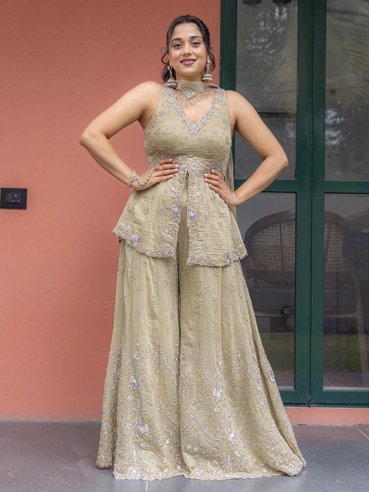 Bring a regal touch to your festivities with the palazzo suit, showcasing intricate cutdana, sequins, zari and beads work. The V neckline and sleeveless lend timeless elegance, while the dupatta adds a striking finish with palazzo.