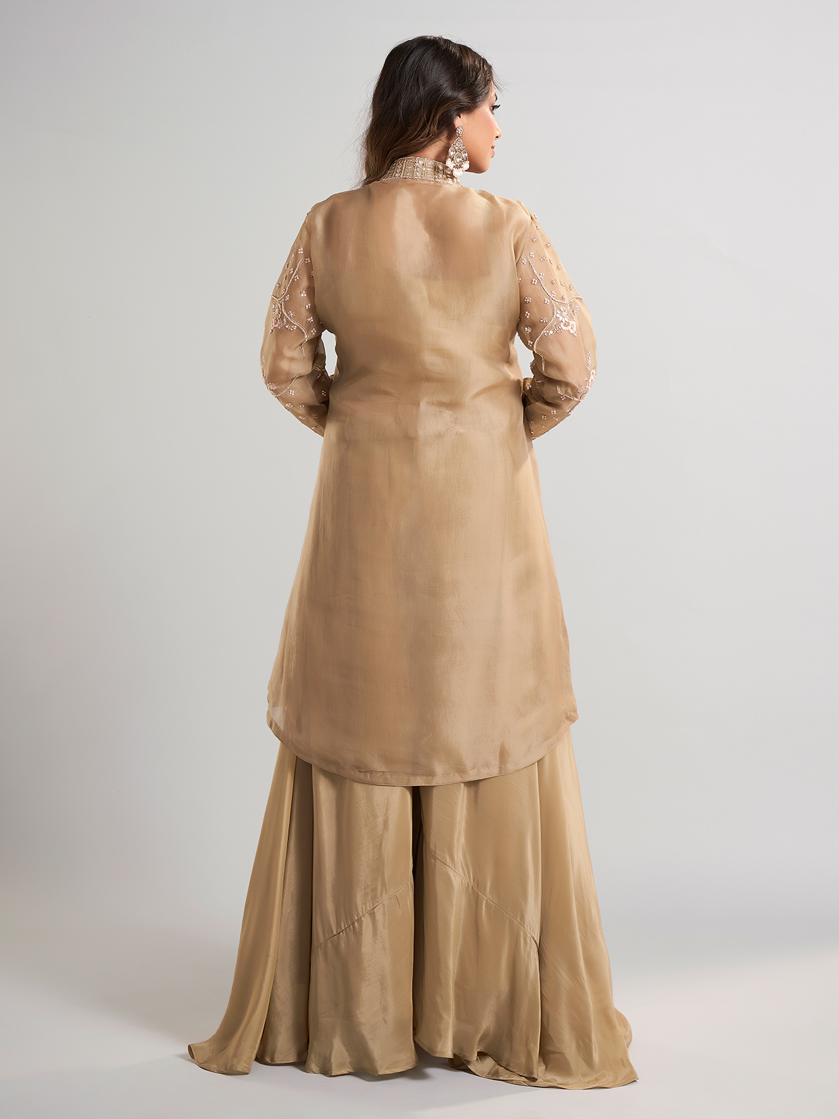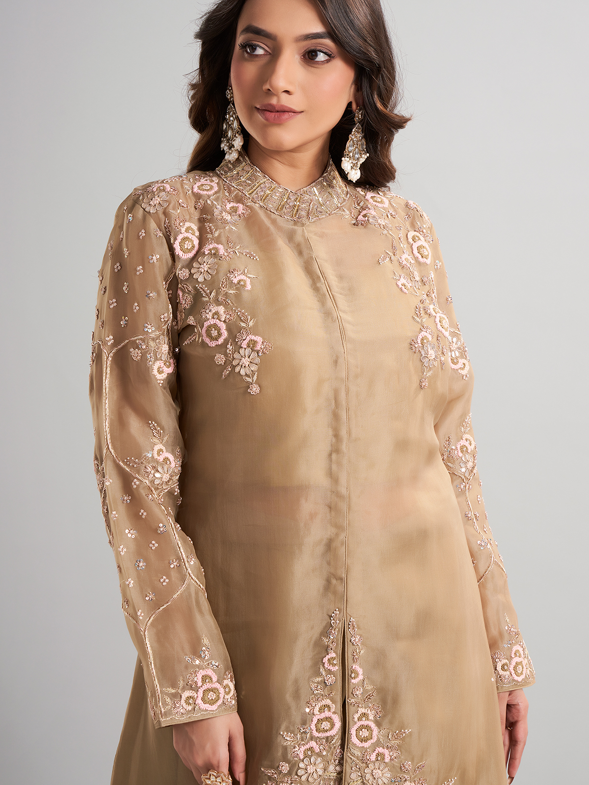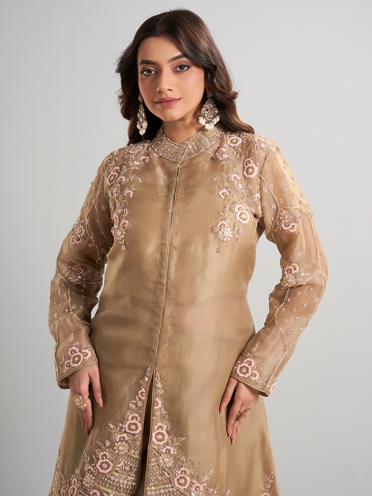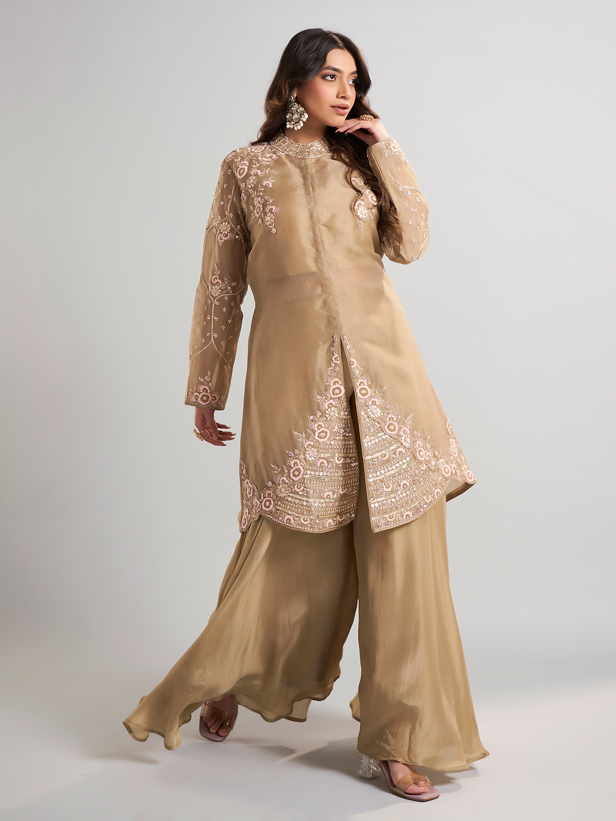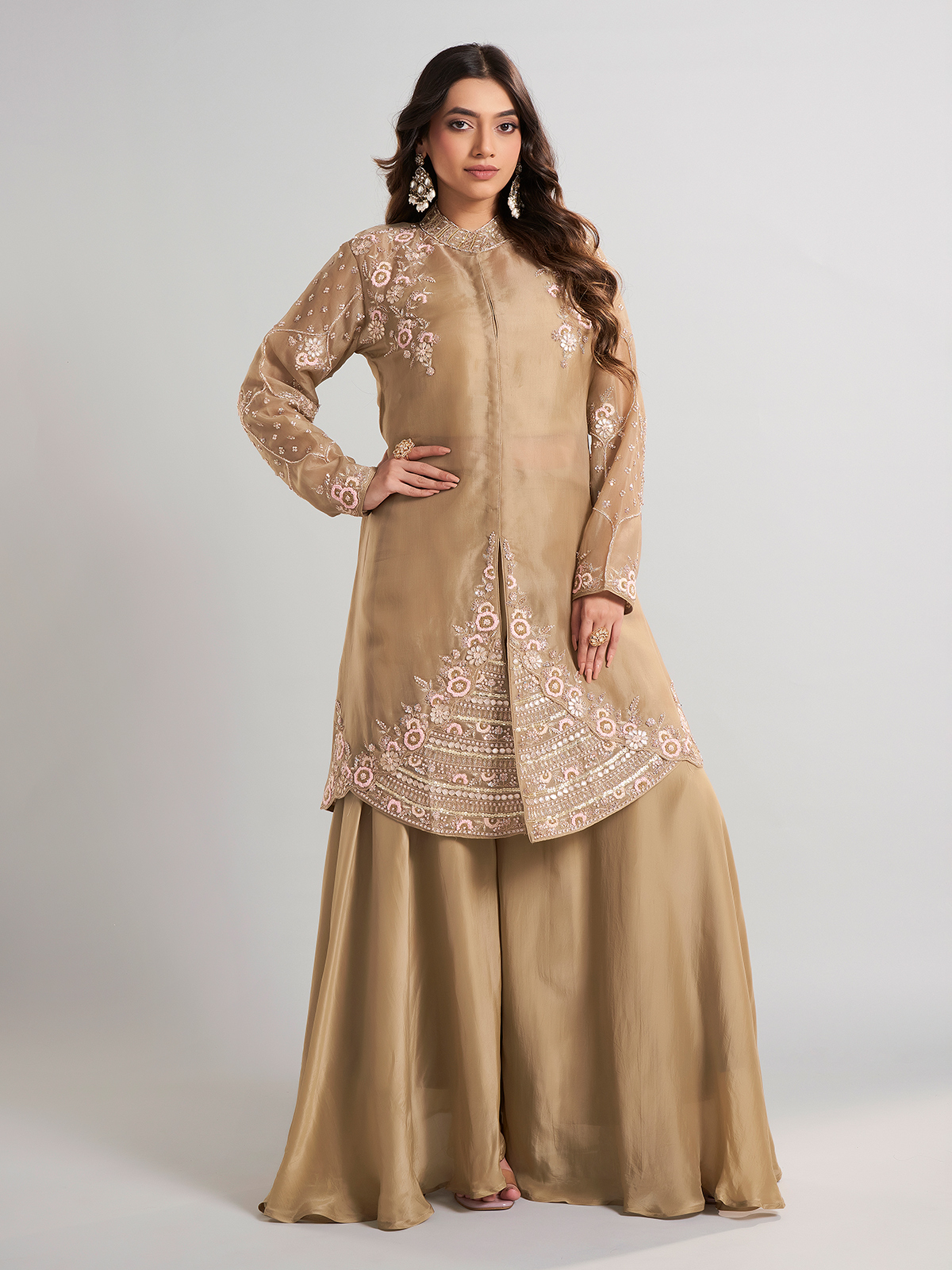 Exude grace in this beige tissue and satin silk Pakistani palazzo suit, styled with stand collar and full sleeves. Enhanced with resham, thread, sequins, beads, zardosi, and gota work, it’s an impeccable wedding and festive choice for timeless sophistication.