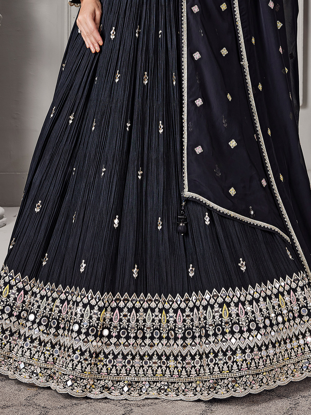 Designed in classic black silk, this Pakistani-style Anarkali suit features rich embroidery enhanced with sequins, mirror, cutdana and stone accents. Styled with a V neckline and full sleeves, it is paired with a dupatta, offering bold elegance for wedding and reception wear.