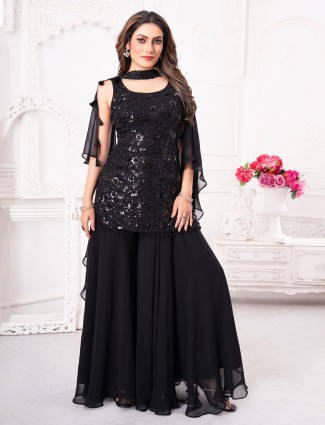 This black georgette palazzo suit impresses with embroidery, sequins and cutdana work. The sleeveless round neck cut adds a modern ethnic charm. Comes with a dupatta.