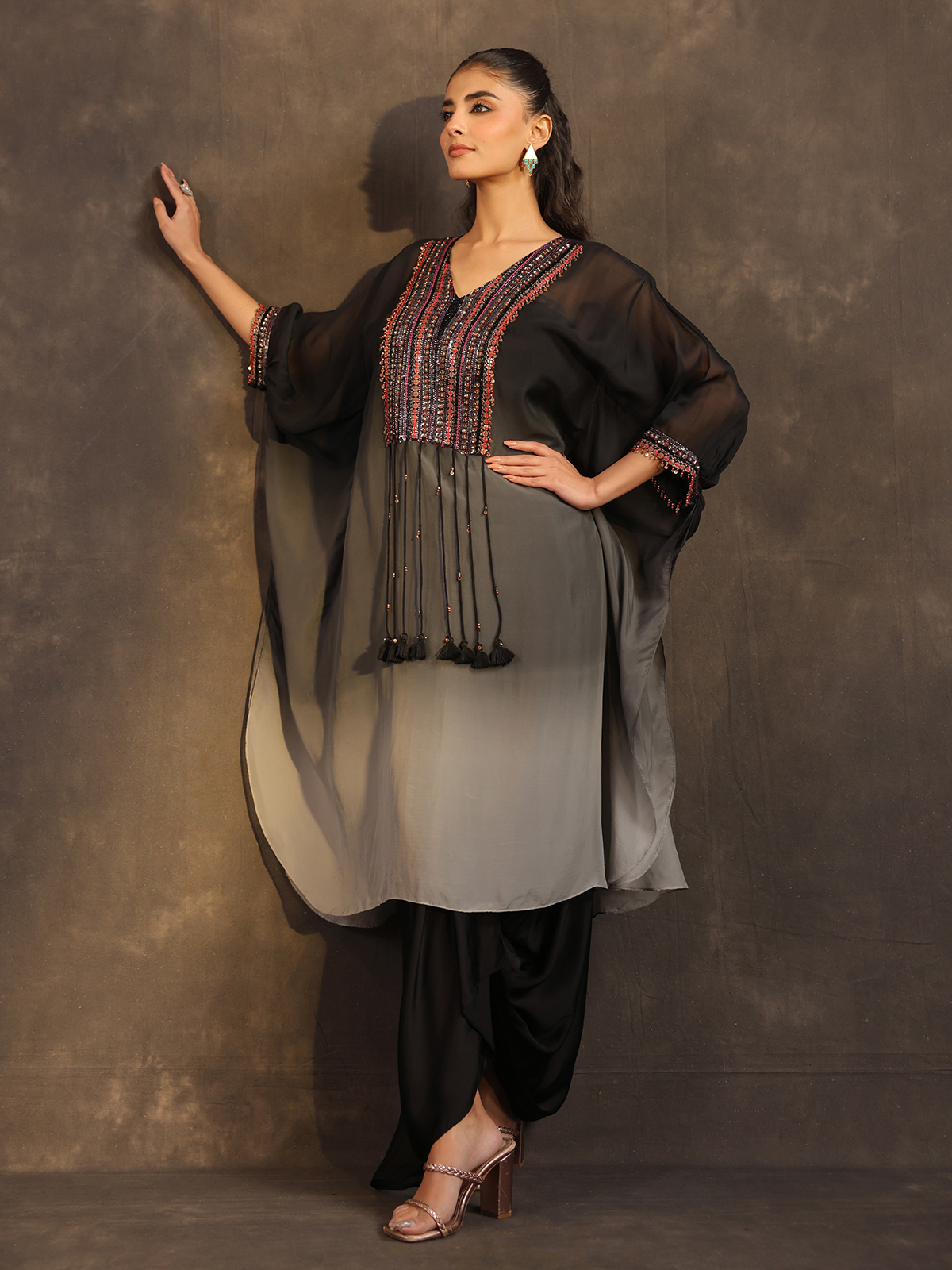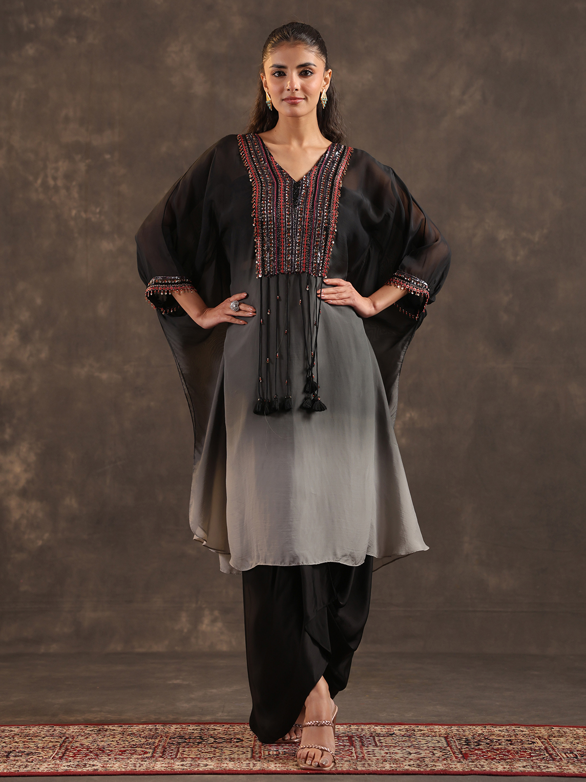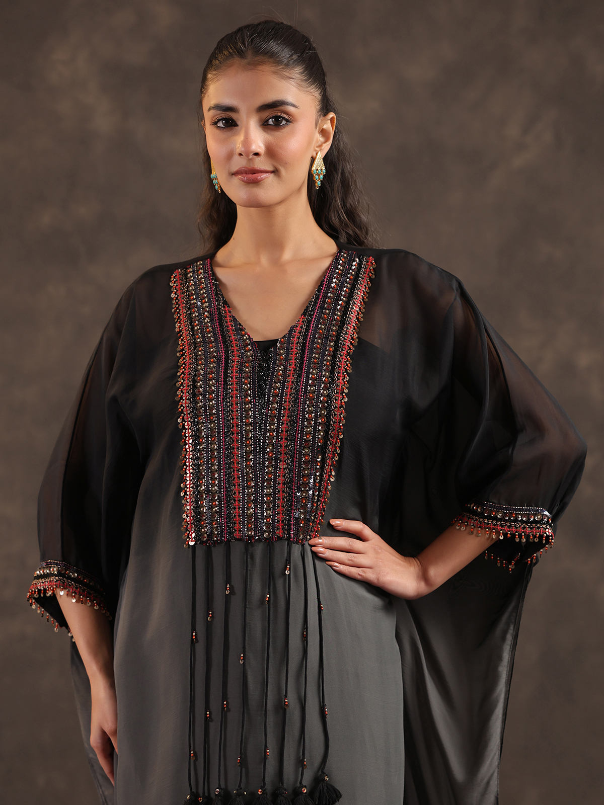 Modern and graceful black organza kaftan suit brings refined charm to festive fashion. Designed with a flattering V neckline, the silhouette features shimmering cutdana, beads and sequin embellishments that highlight its festive beauty. Paired with coordinated bottoms, the ensemble creates a sophisticated flowing look perfect for celebrations and elegant party occasions.