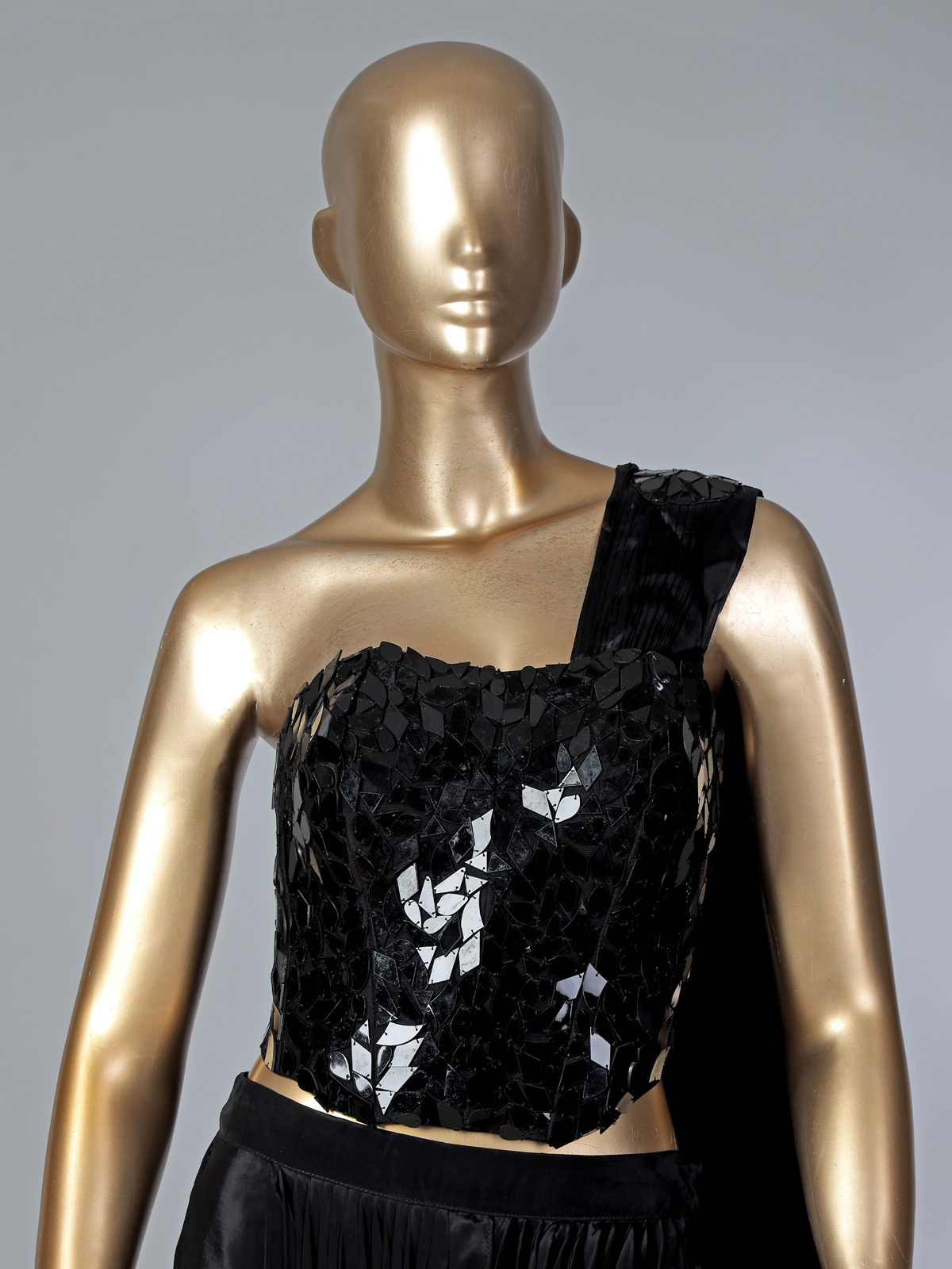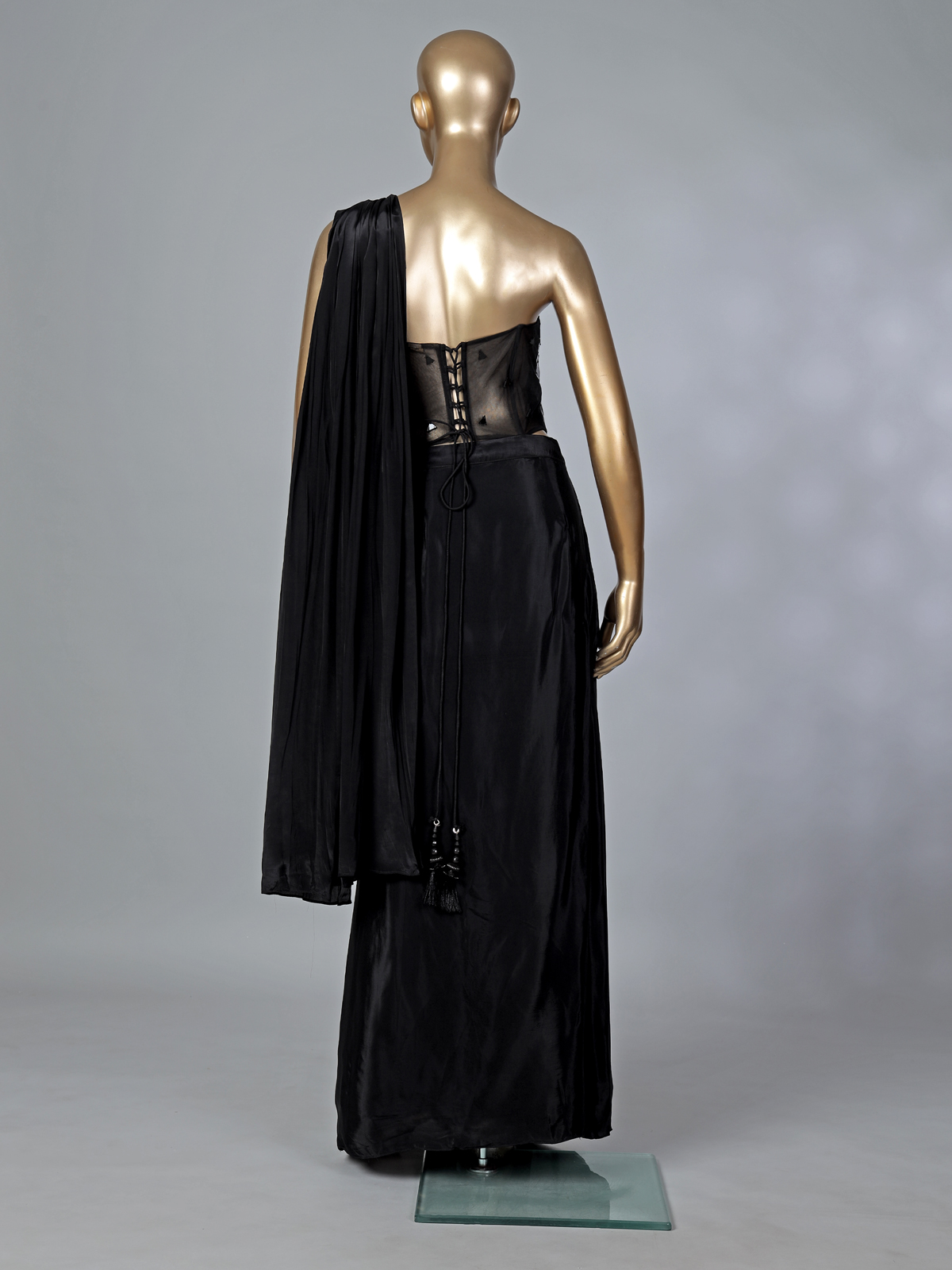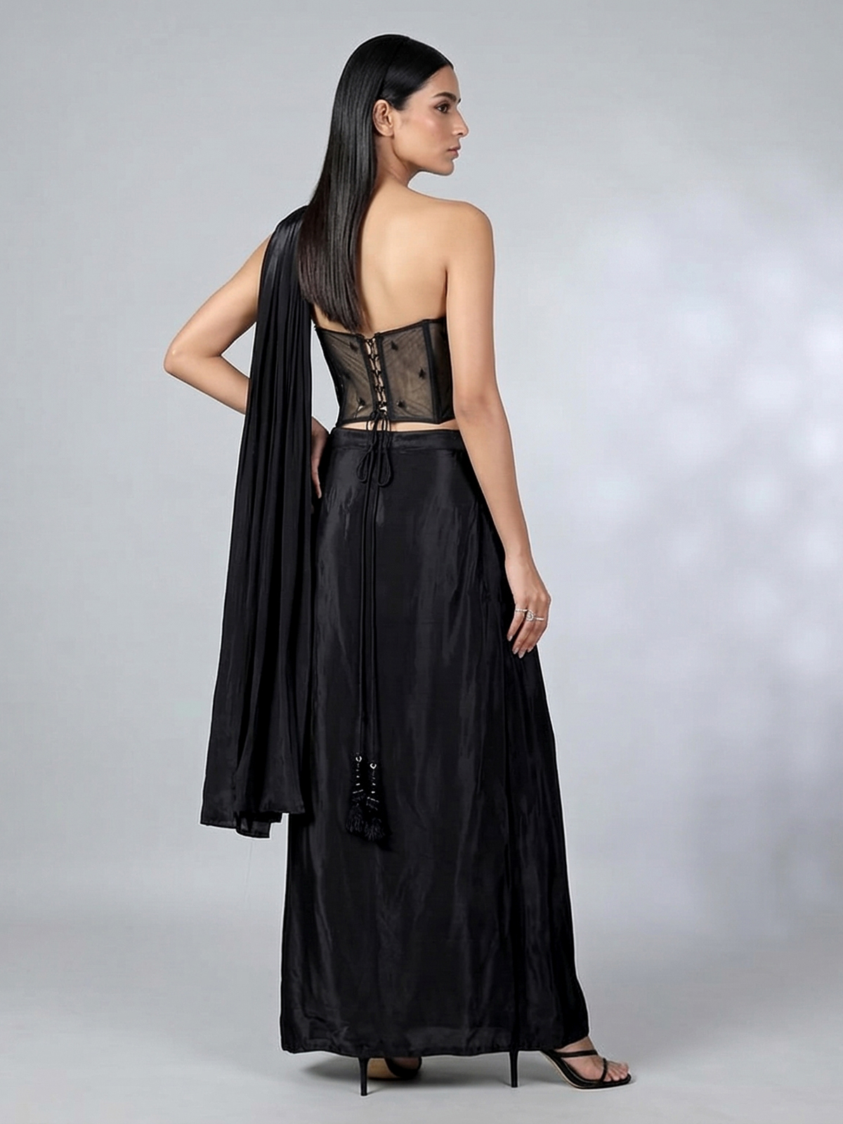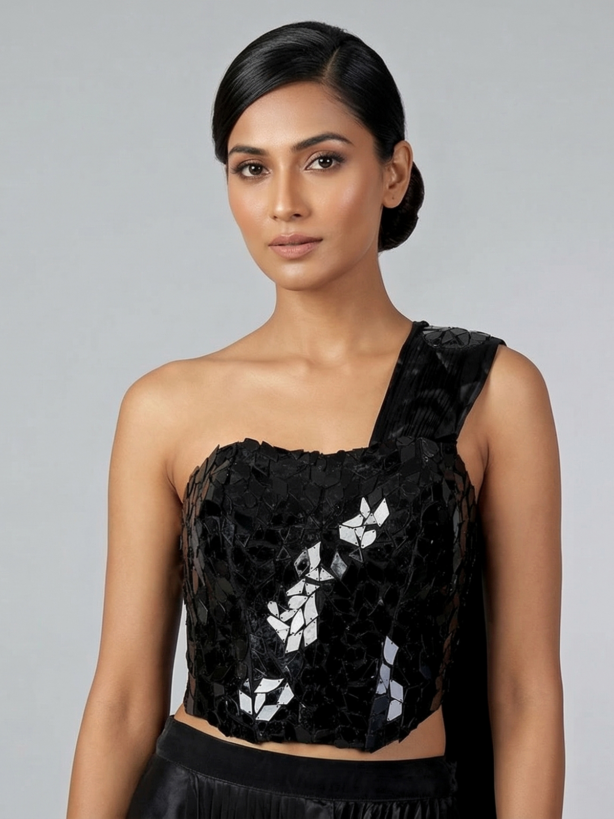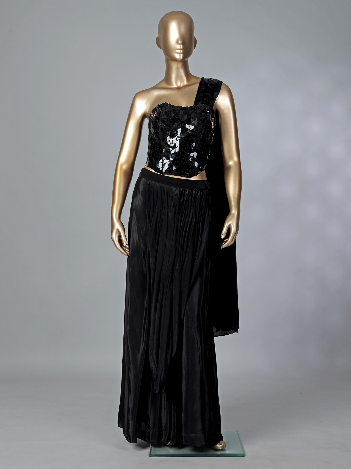 Sleek black satin silk lends dramatic elegance to this designer suit, adorned with shimmering mirror work that reflects light beautifully. The attached dupatta enhances its fluid silhouette, making it a striking choice for weddings, receptions, sangeet nights and glamorous party occasions.