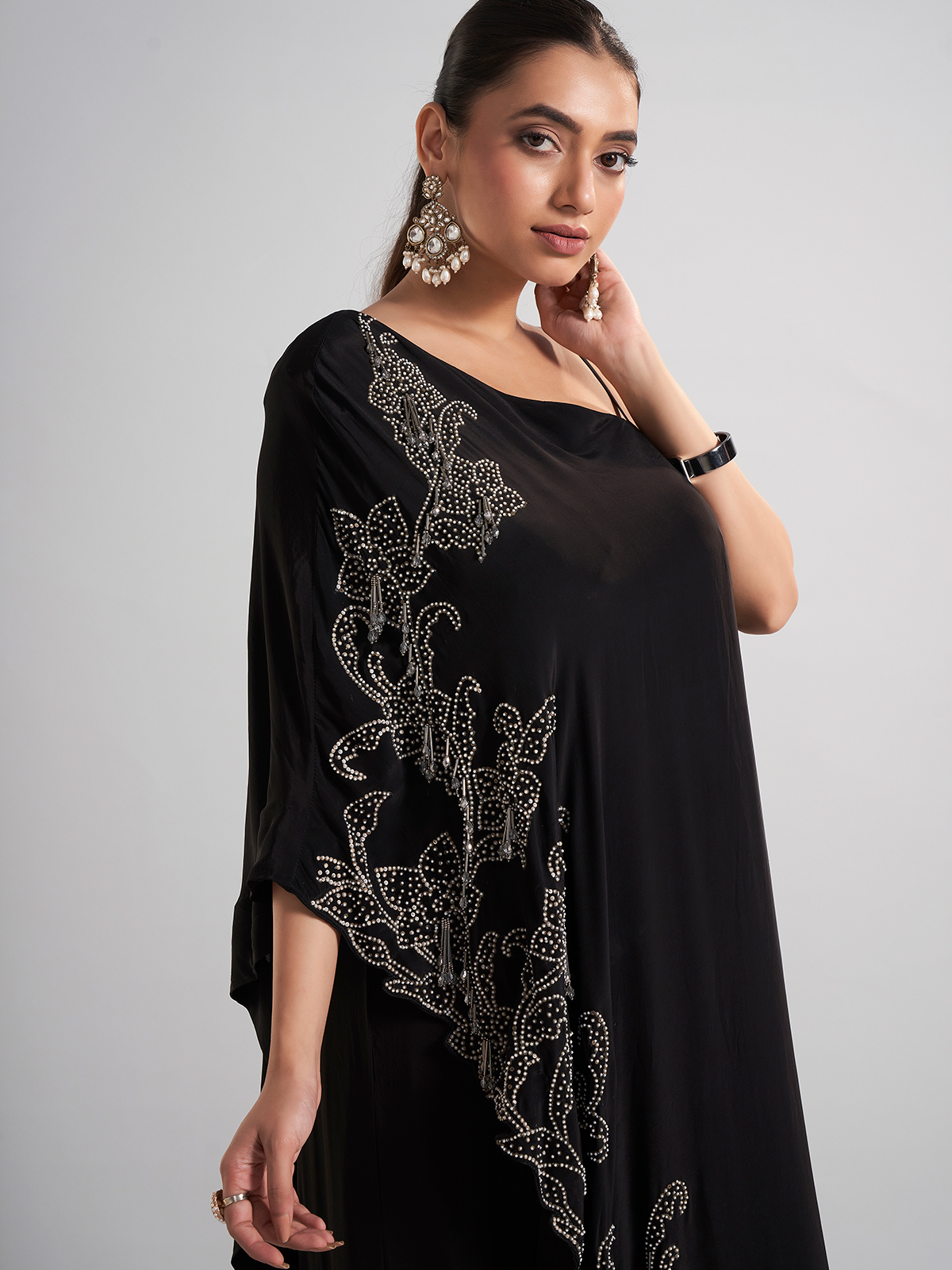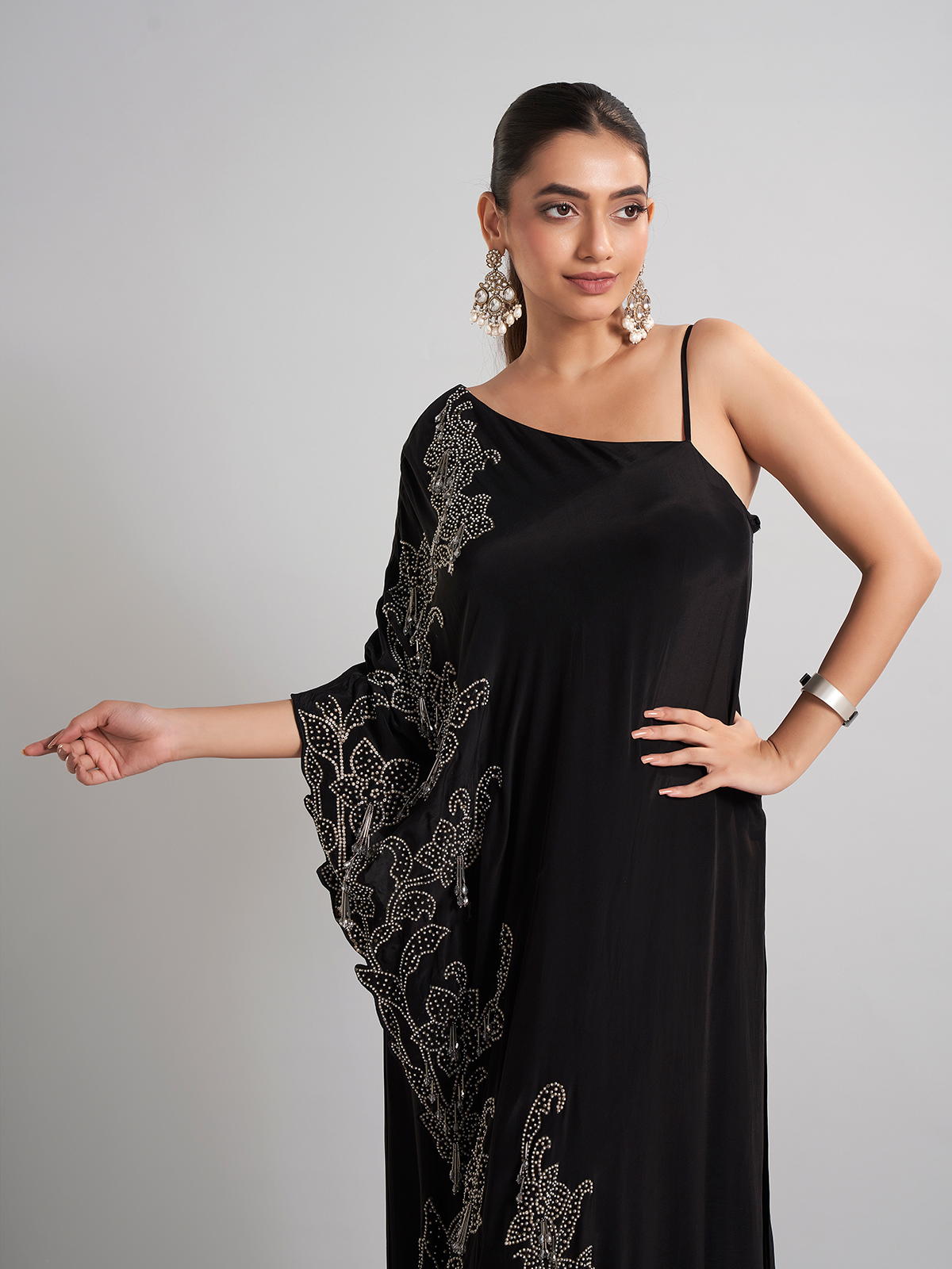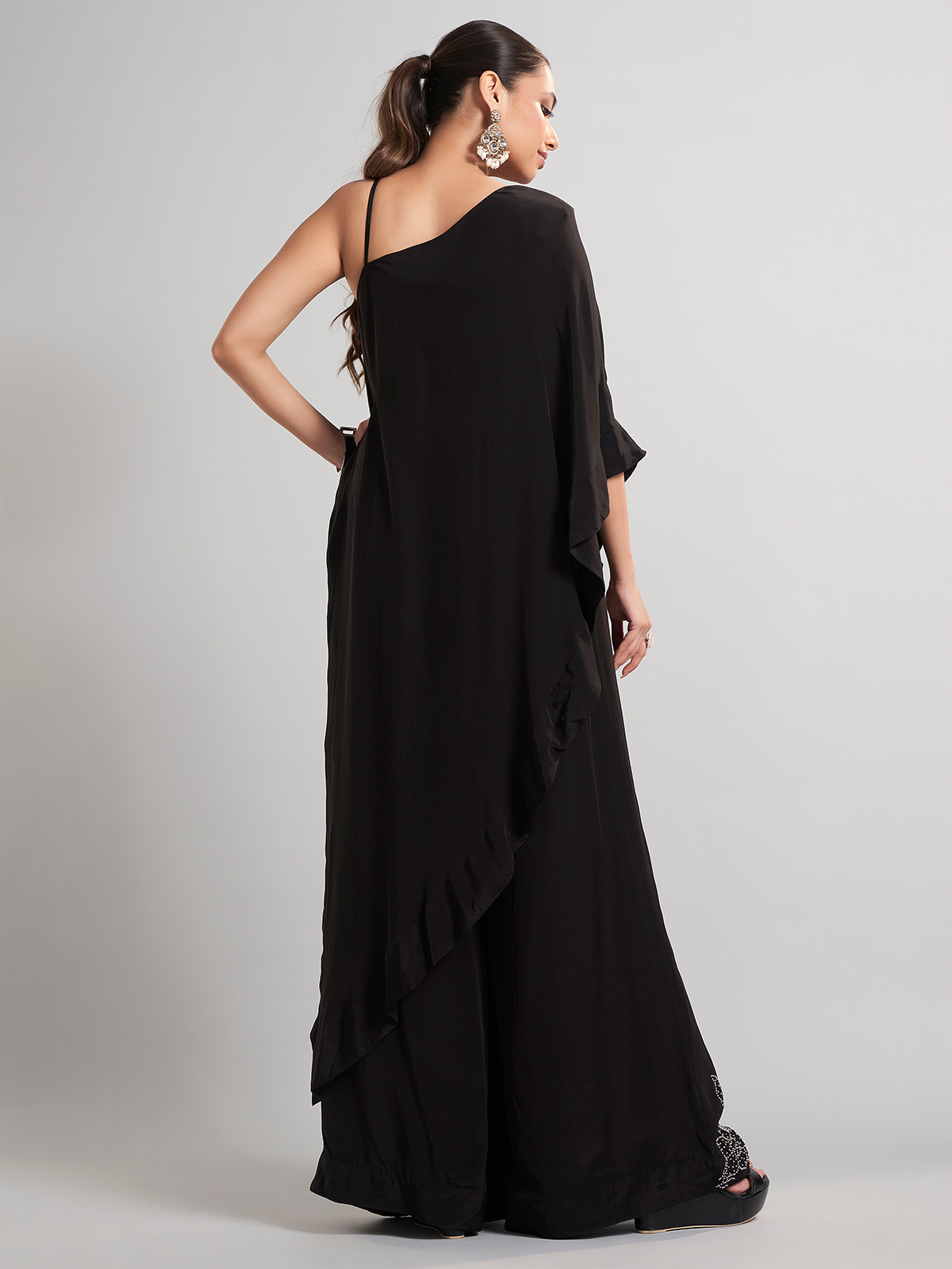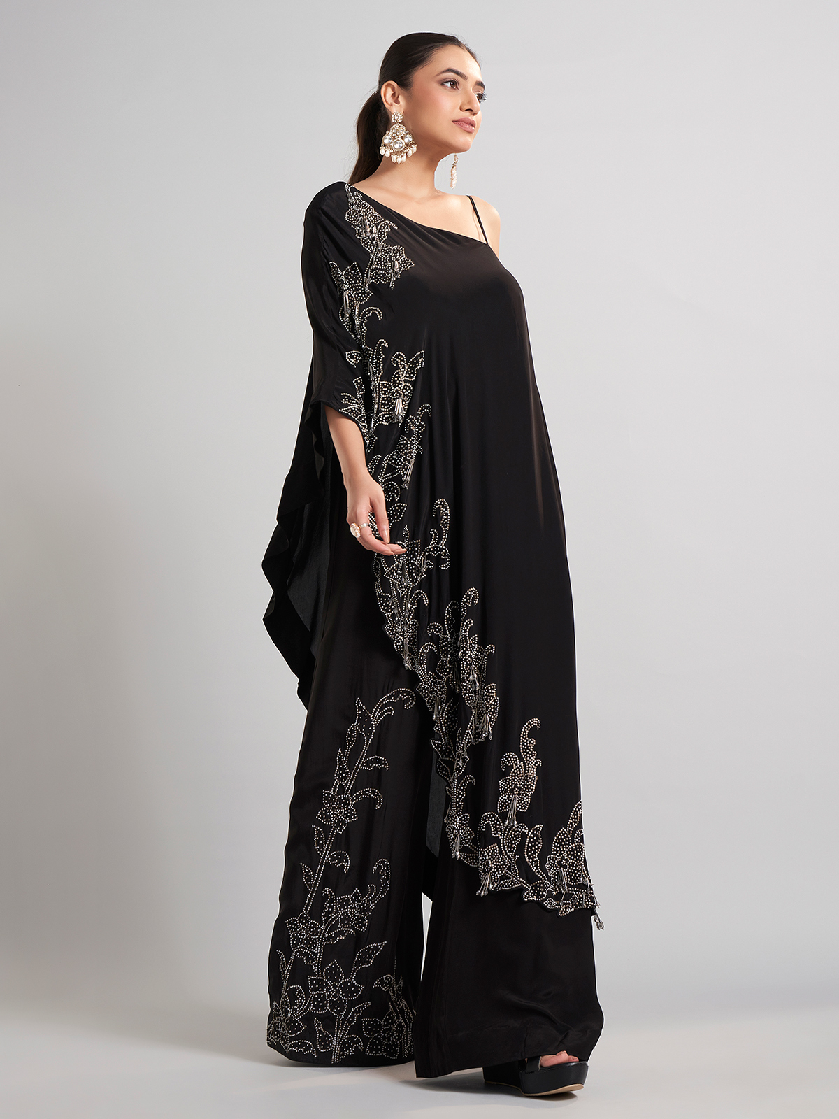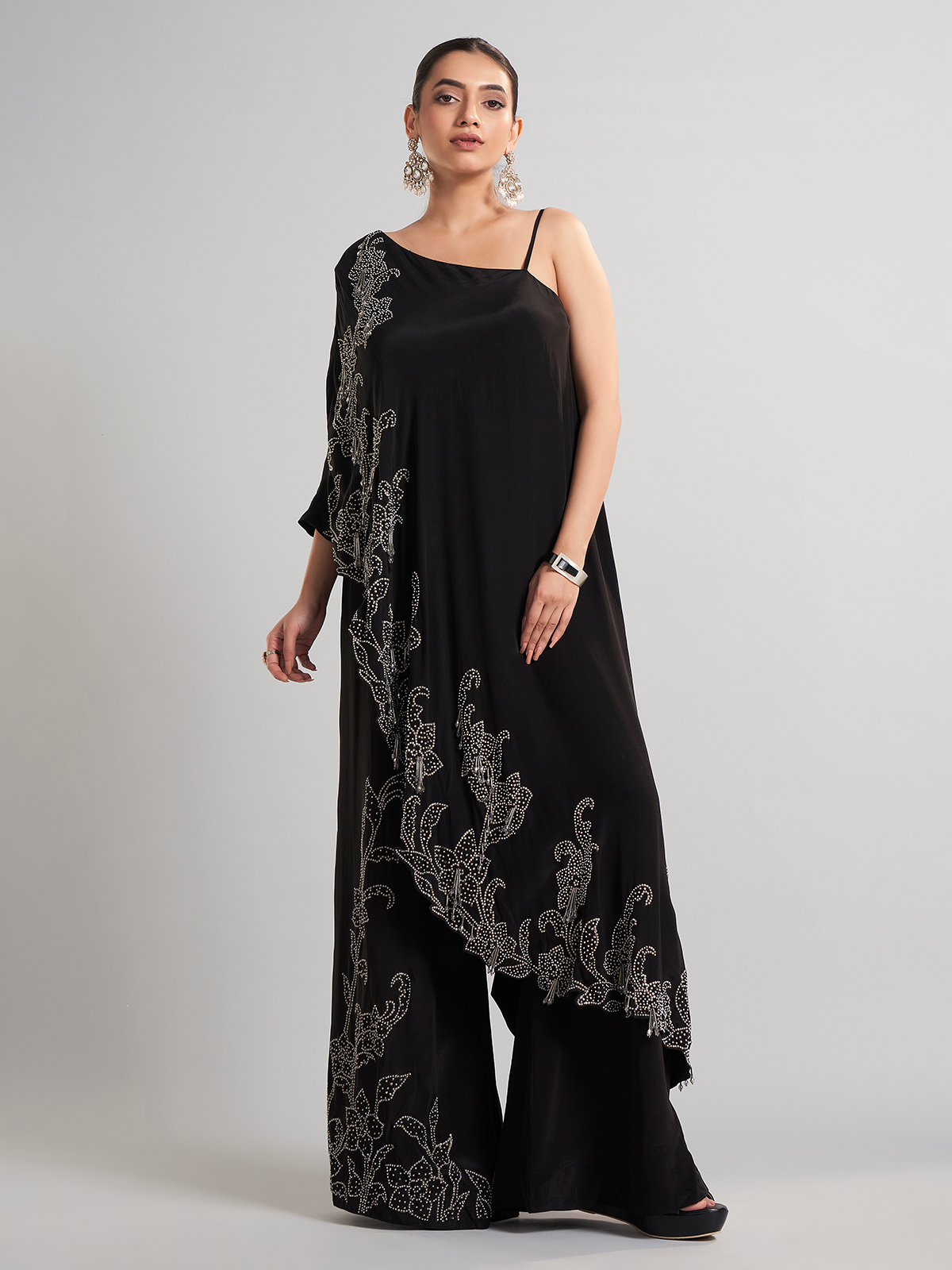 Designed in black satin silk, this palazzo suit is enriched with sequins, beads, and cutdana. Perfect for parties and receptions, its flowing drape and elegant finish exude festive sophistication.