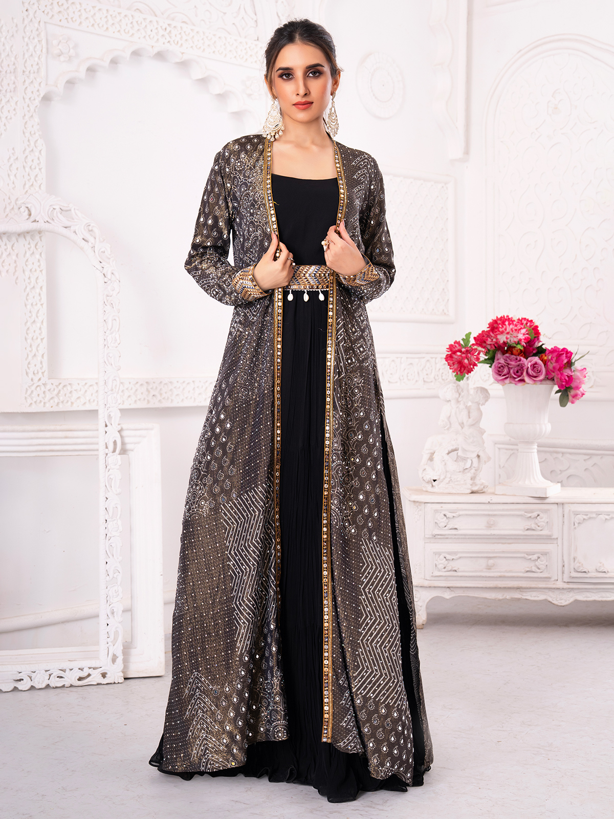 Make a bold statement in this black silk anarkali jacket-style suit embellished with embroidery, aabla, sequins, mirror, stone and cowrie shells. A striking choice for weddings and high-end parties.