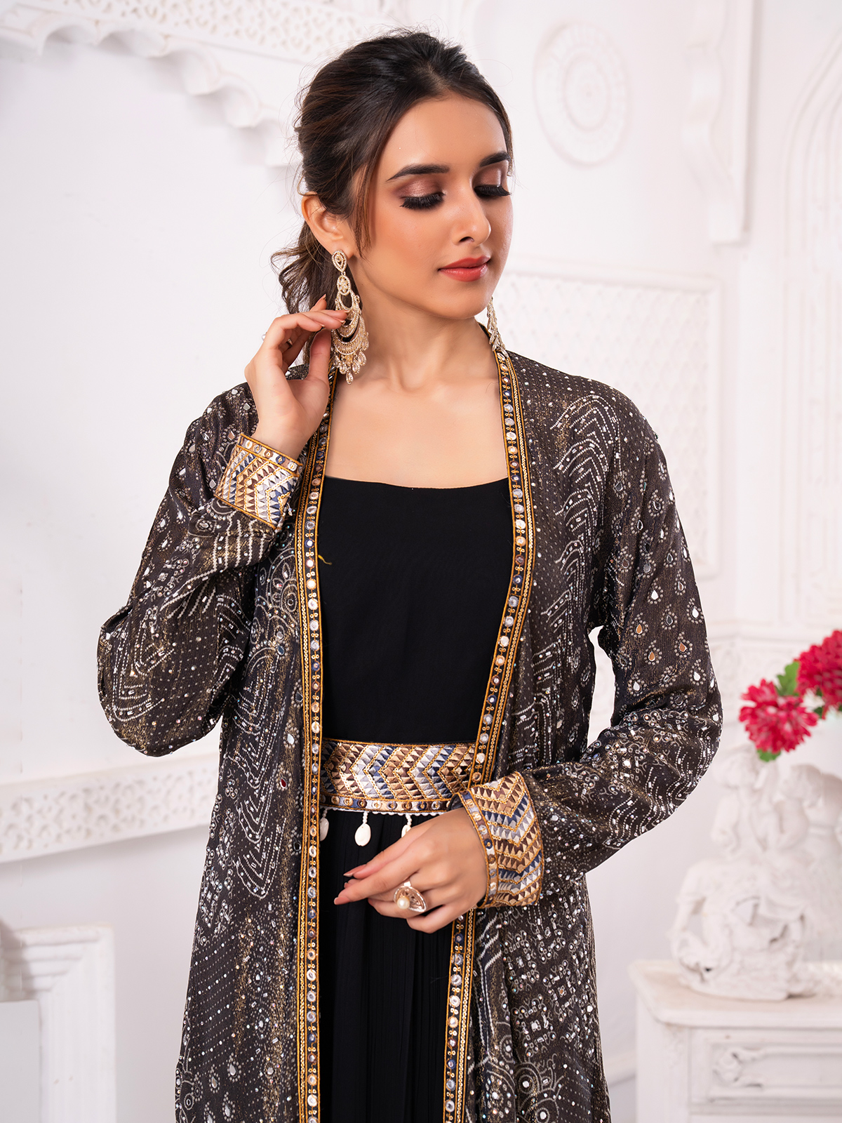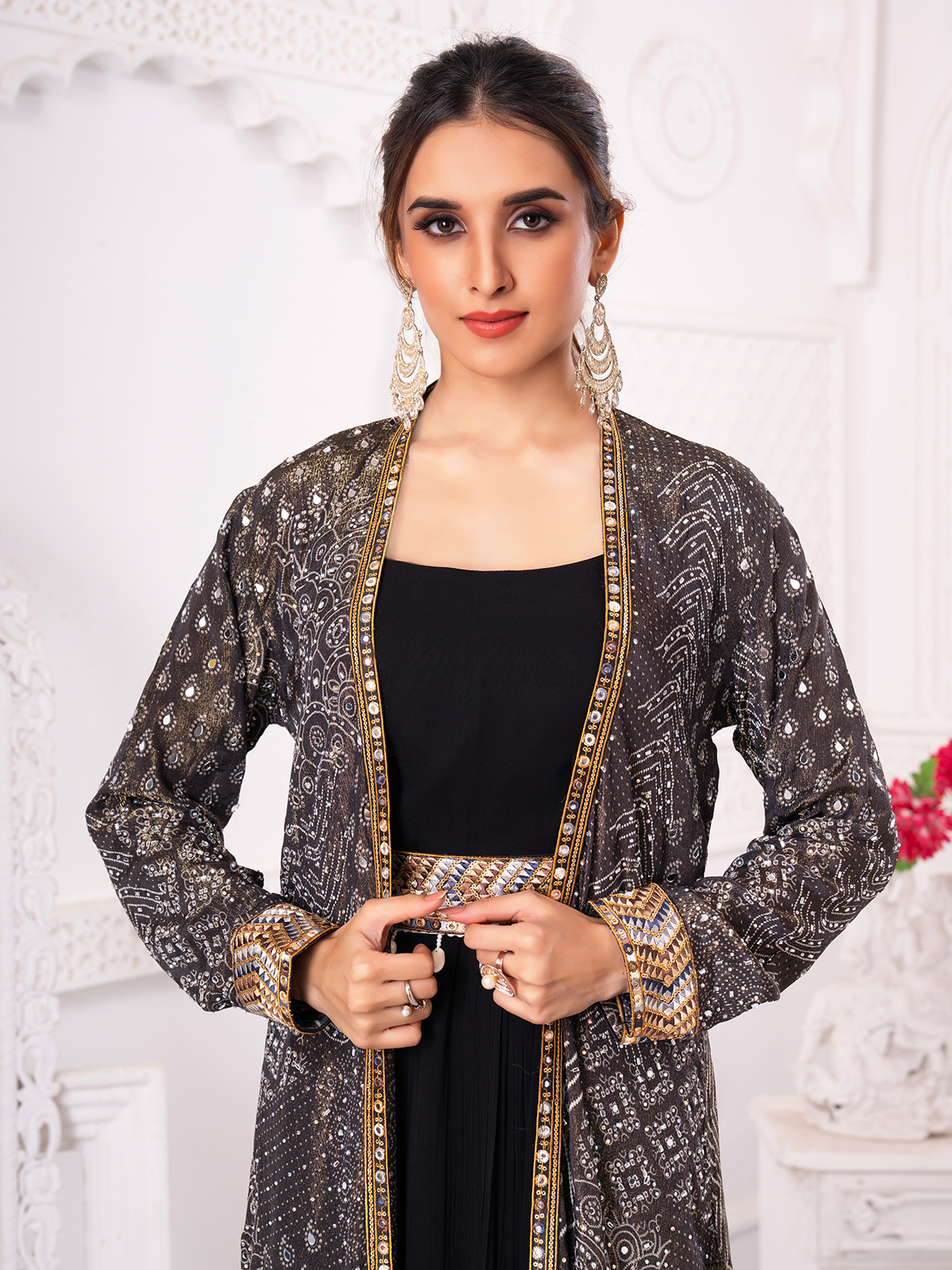 Black Silk Anarkali Jacket Style Set With Cowrie Shell Embellishments