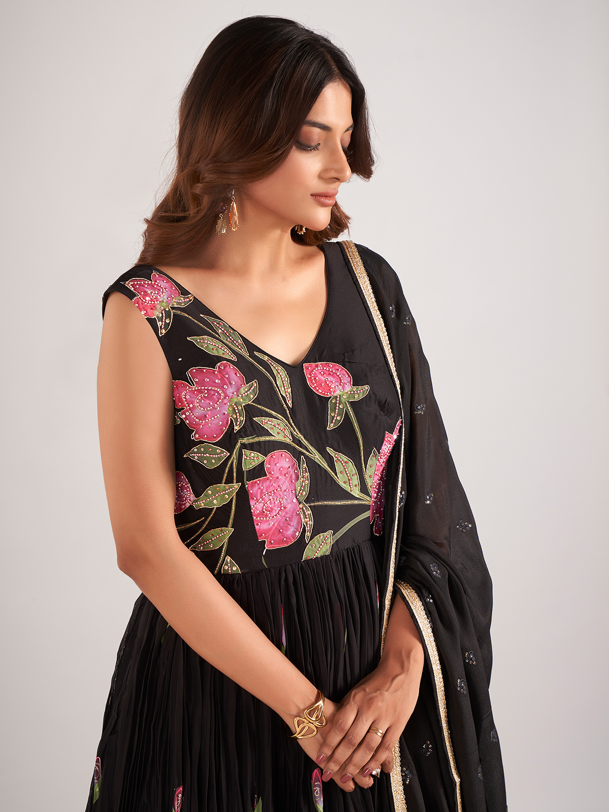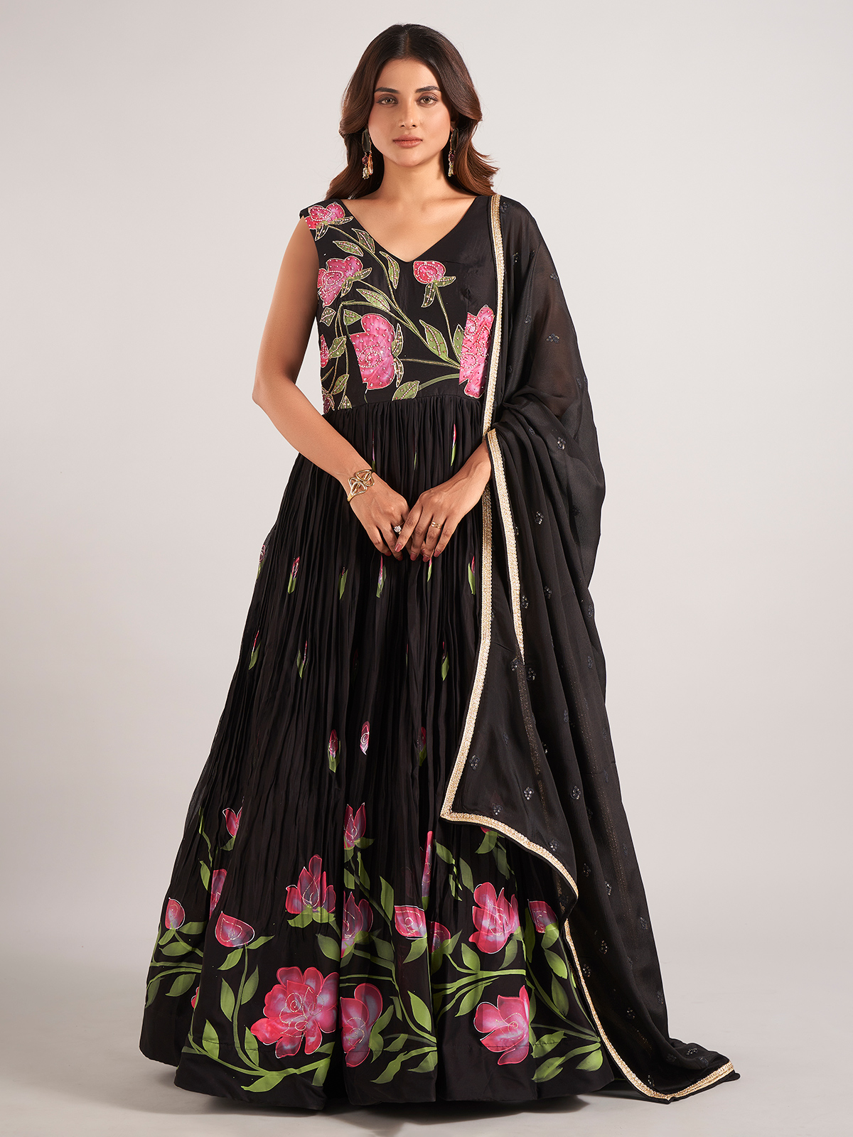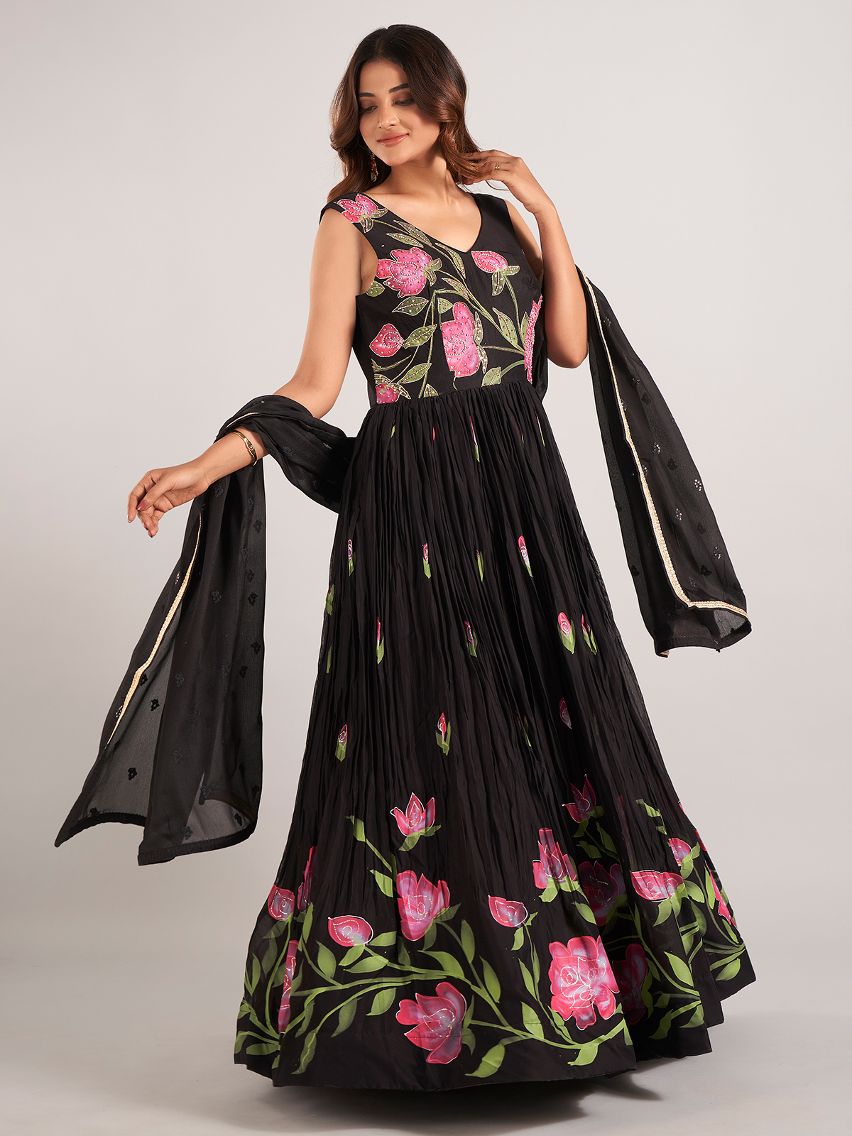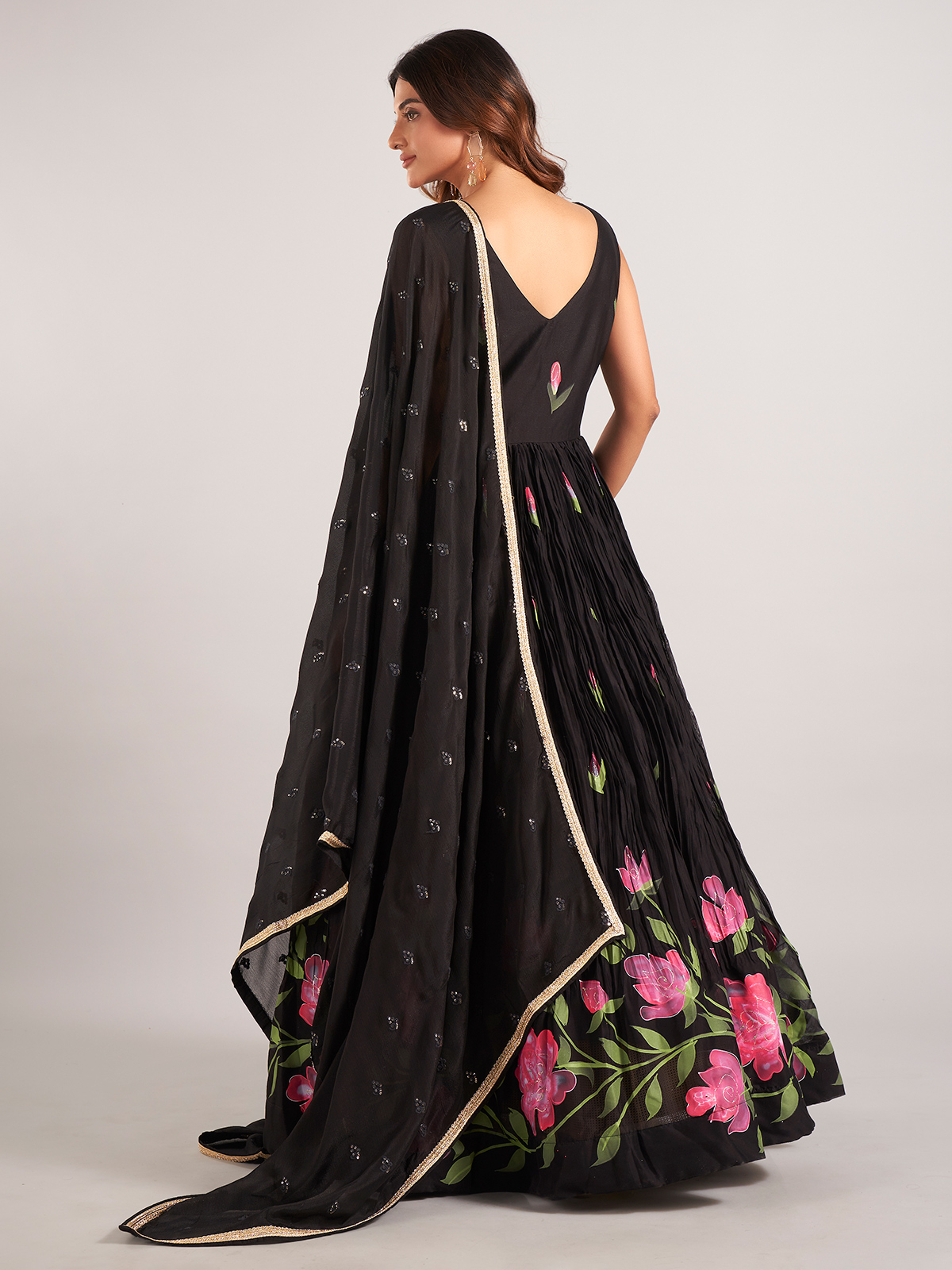 Make a bold impression with this stunning black silk printed Anarkali suit, exquisitely adorned with cutdana, beads, sequins, and zardosi work. Designed with a flattering V-neckline and a sleeveless silhouette, this ensemble offers a perfect blend of traditional artistry and contemporary elegance. Paired with a graceful dupatta, it’s an ideal choice for festive occasions, evening events, and wedding celebrations.