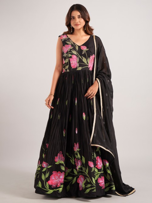 Black Silk Anarkali Printed Suit With Dupatta