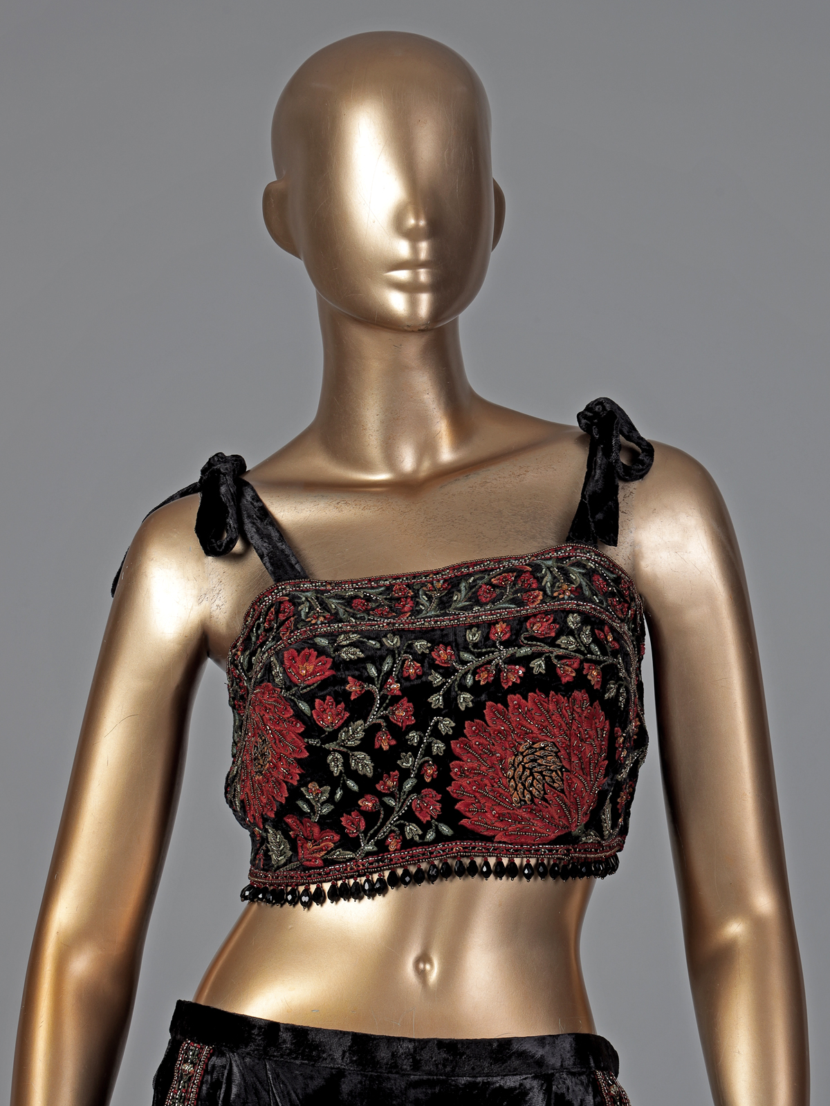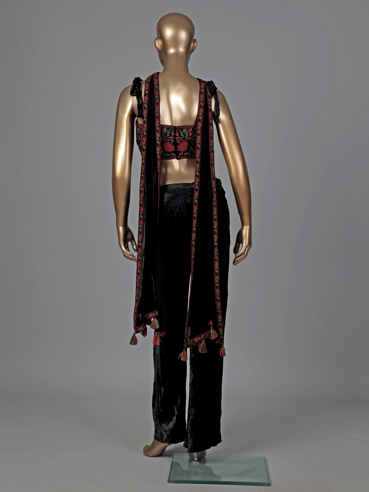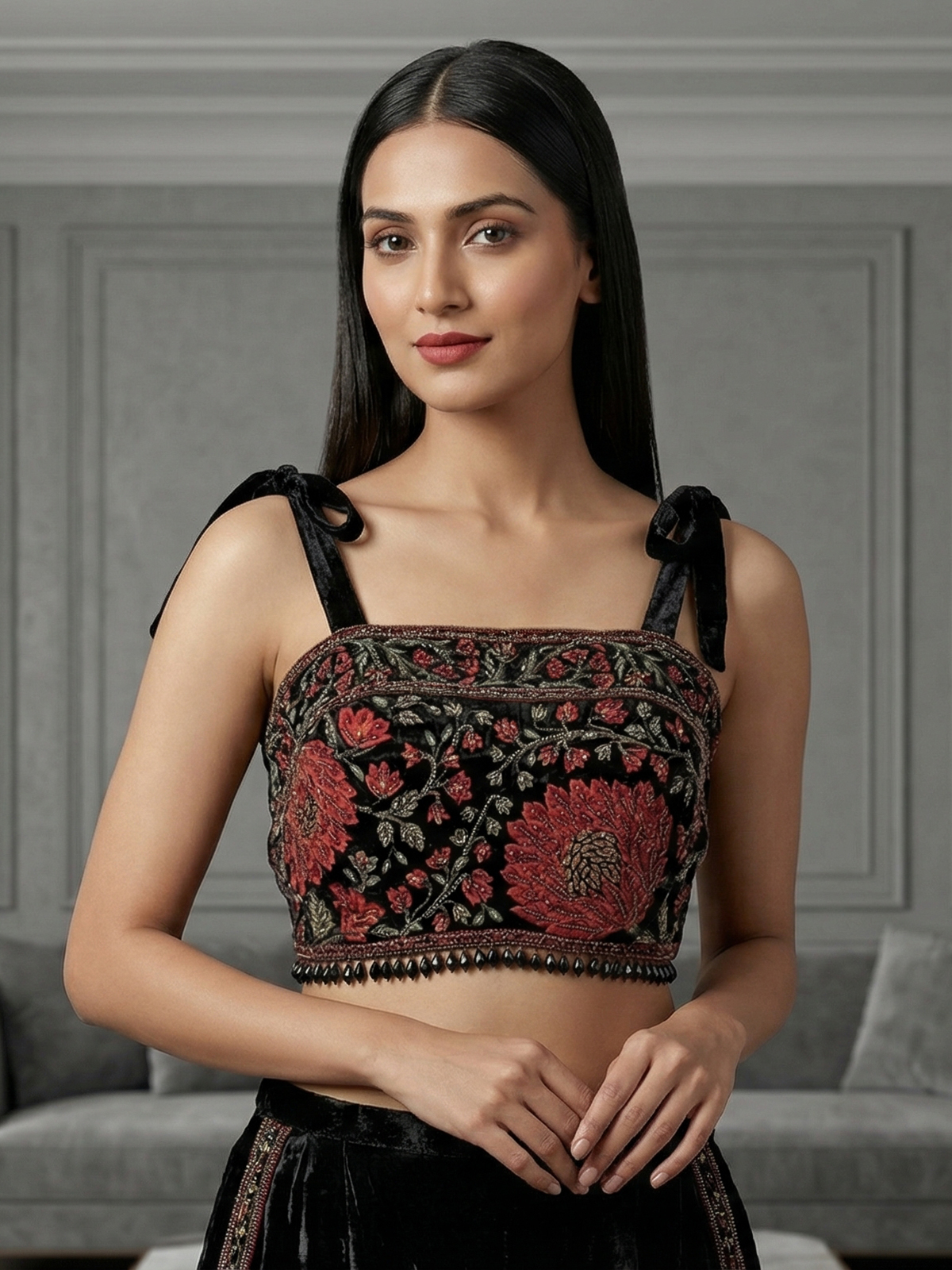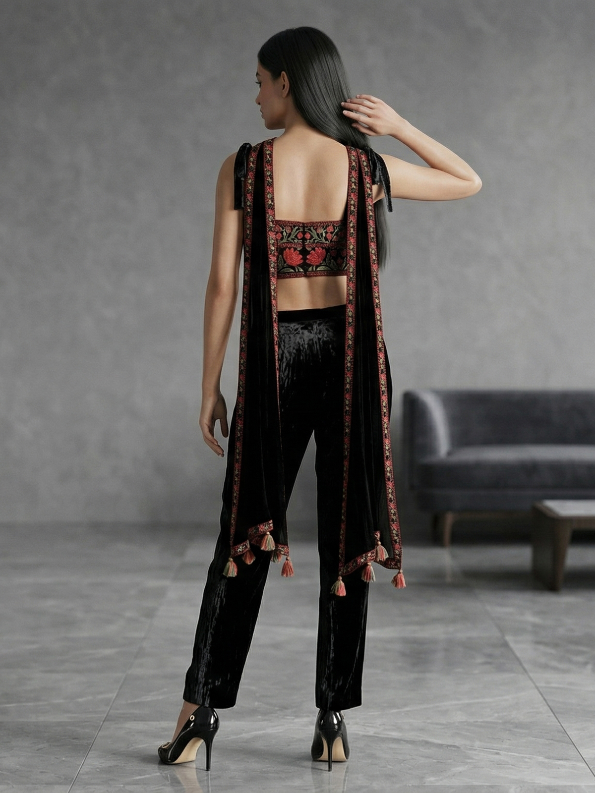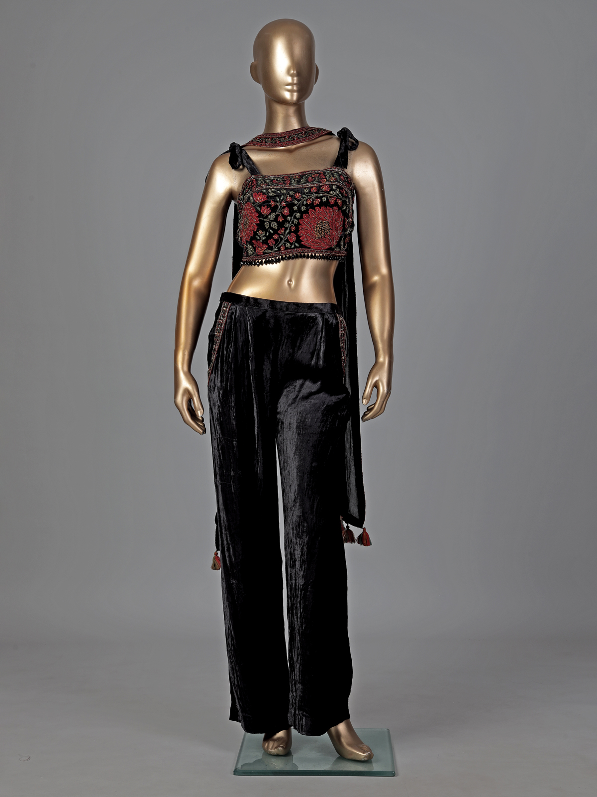 Striking black silk palazzo suit is adorned with cutdana, sequins, beads, stone, thread and zardosi work. The square neckline and sleeveless silhouette enhance its bold festive appeal. Perfect for receptions and parties.