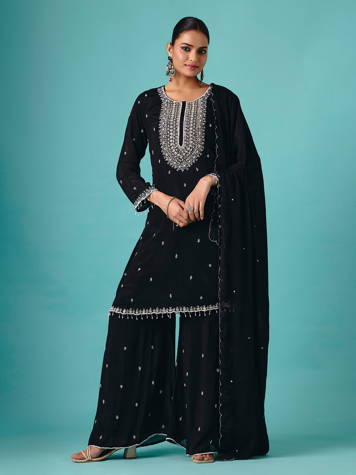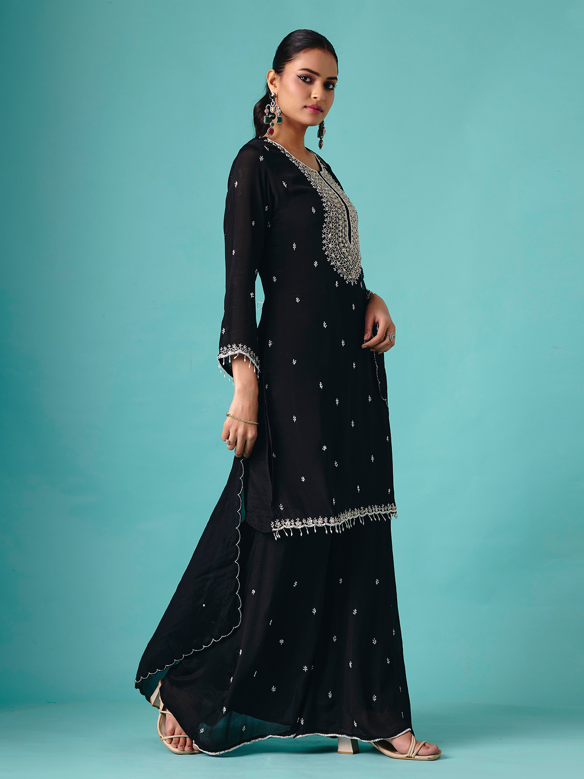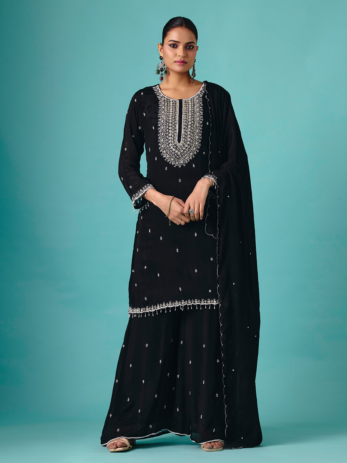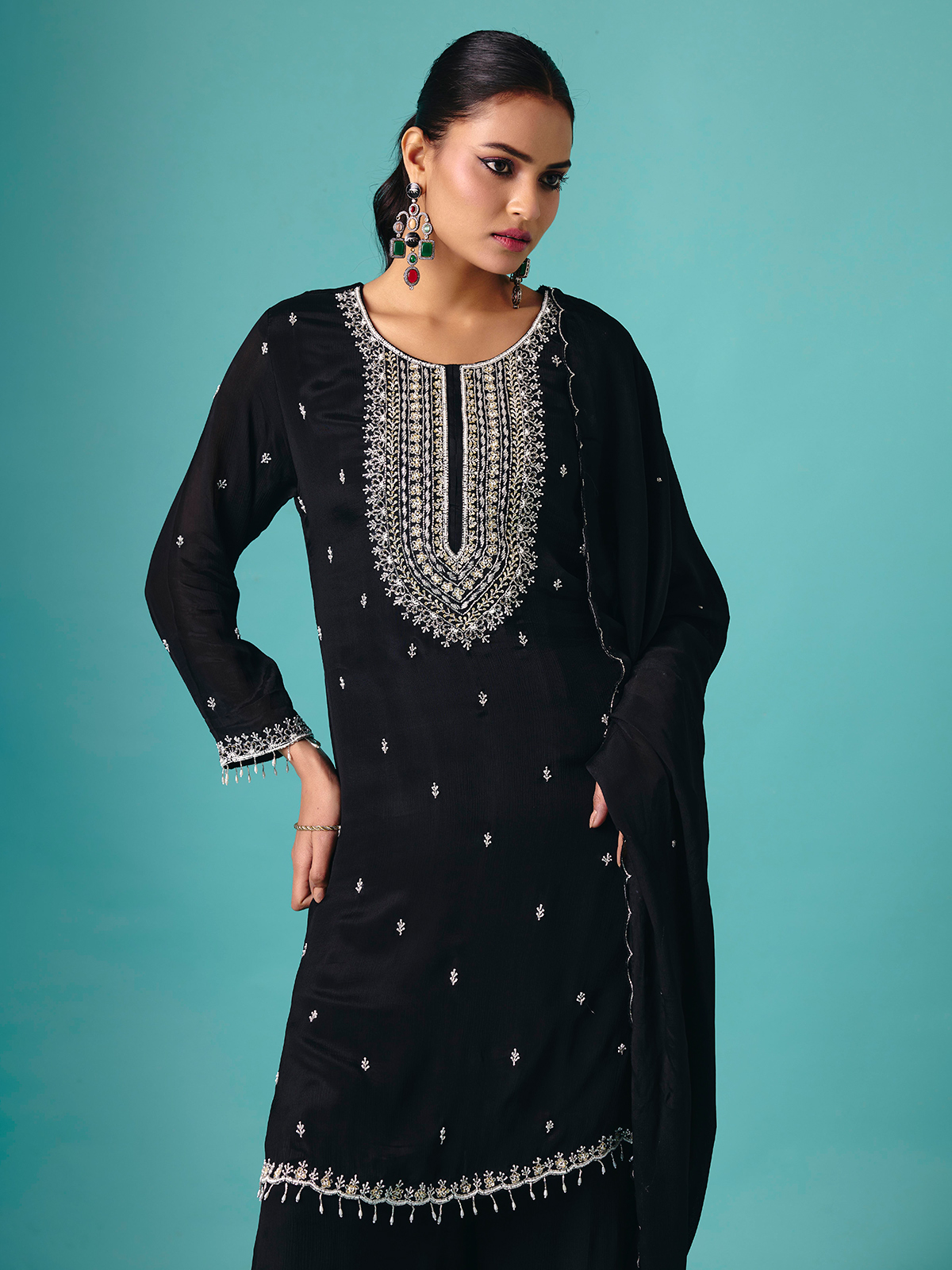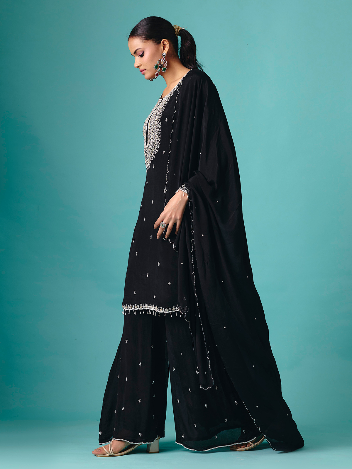 This black silk georgette palazzo suit sparkles with cutdana, beads, sequins, and embroidery detailing. Round neckline and full sleeves provide classic structure, while the palazzo bottoms flow elegantly. Paired with a matching dupatta, it’s ideal for wedding, reception, and sangeet celebrations, radiating timeless charm, refined artistry, and subtle shimmer in every movement.