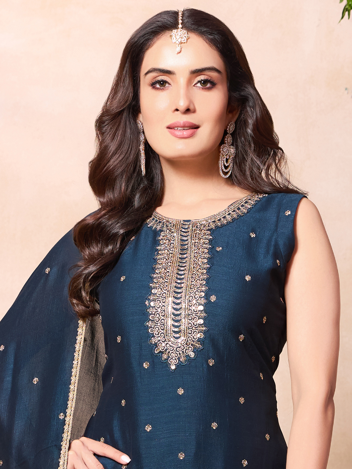 Show off classic sophistication in this navy silk straight-cut salwar suit, finely embellished with resham and sequins. A round neckline with sleeveless design pairs perfectly with pants and a dupatta, ideal for festive occasions.
