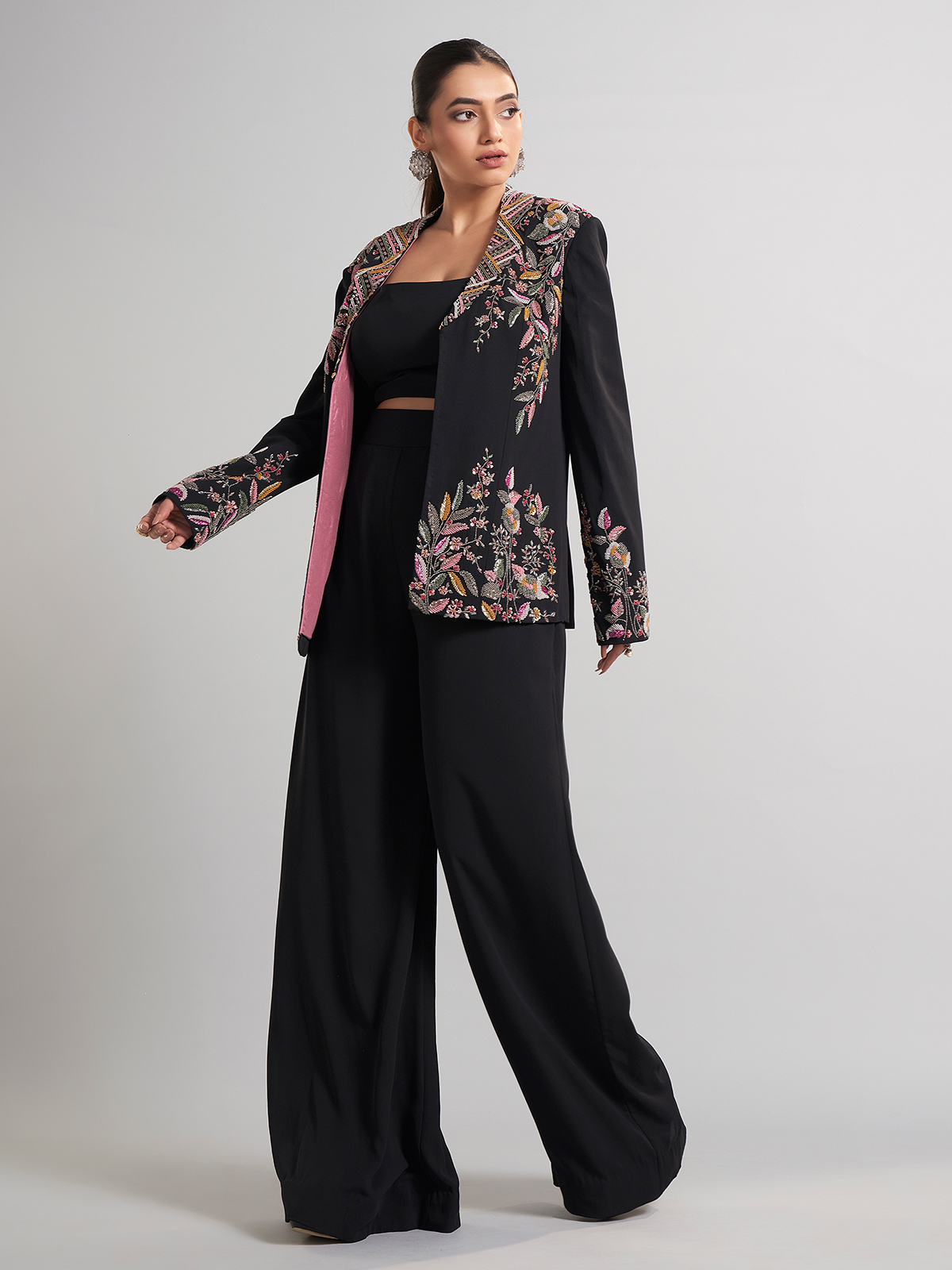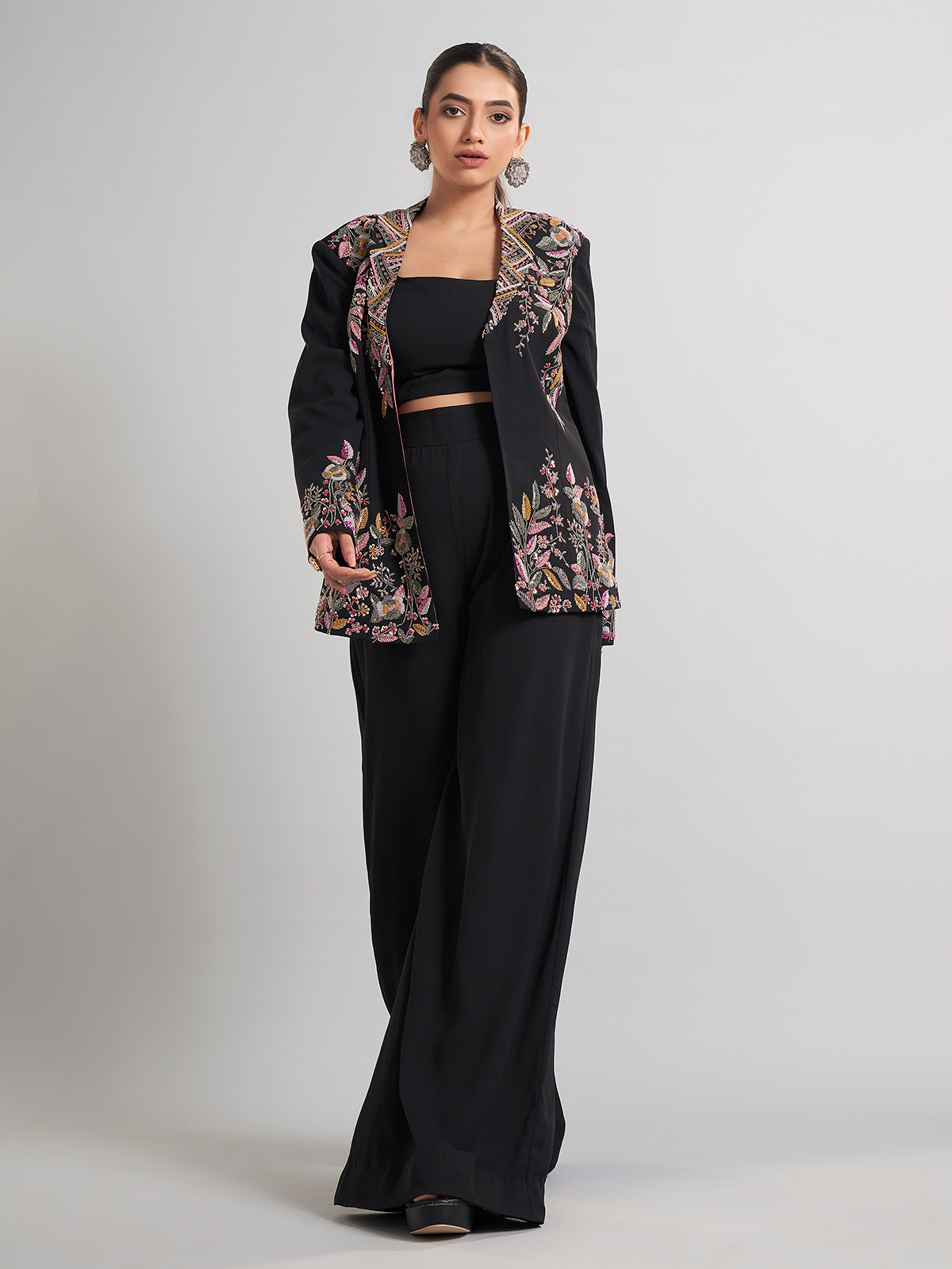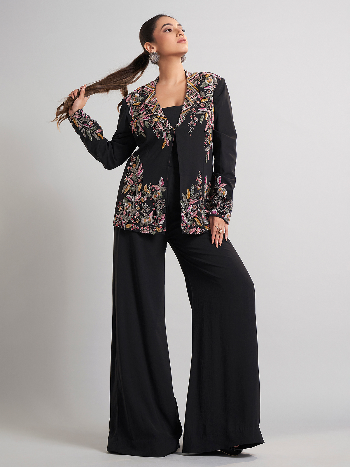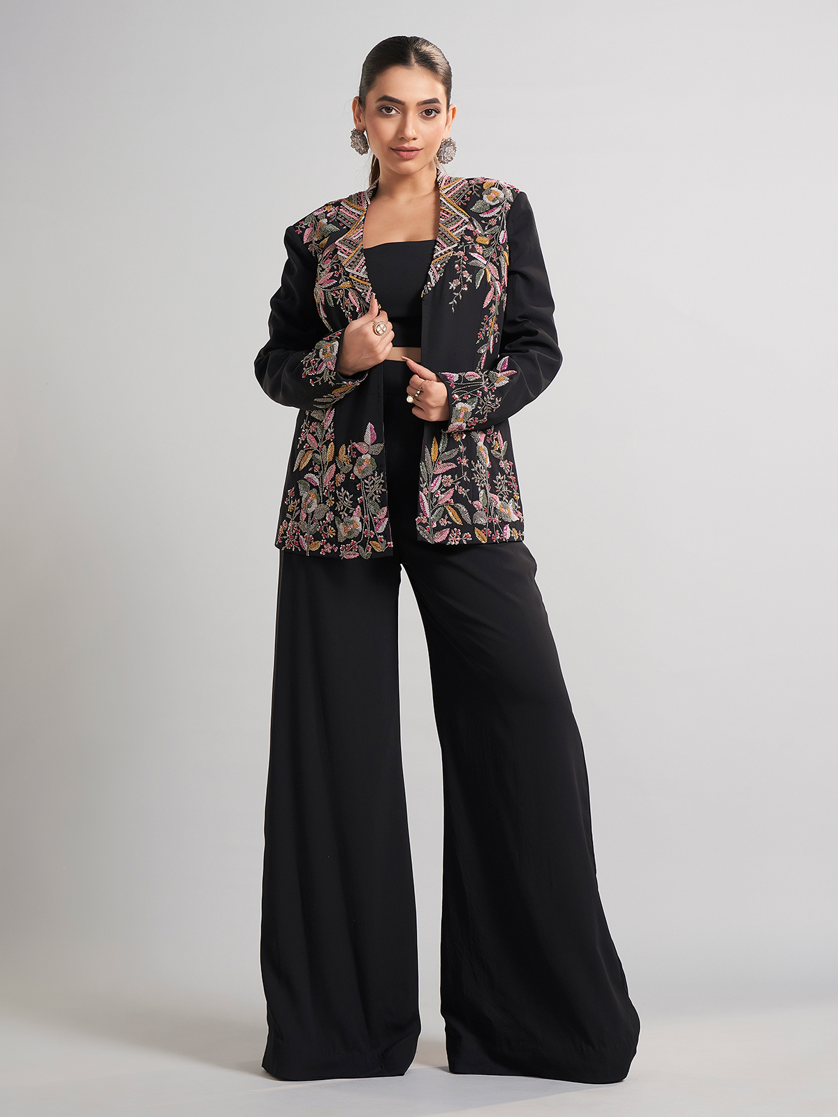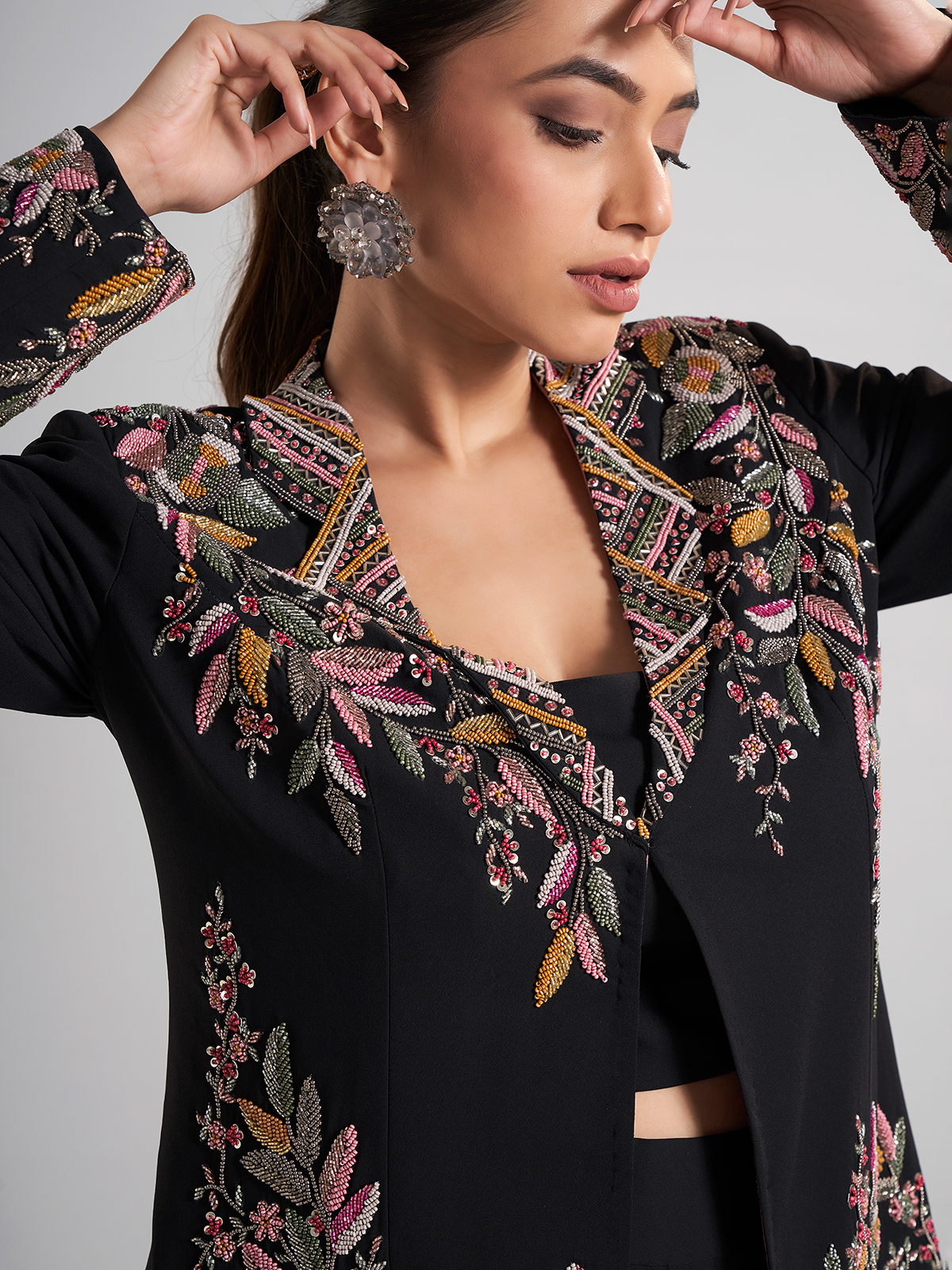 This black terry rayon palazzo suit in jacket style sparkles with sequins, beads, and cutdana. Sleek yet festive, it’s the perfect choice for parties and receptions, blending comfort with sophistication.