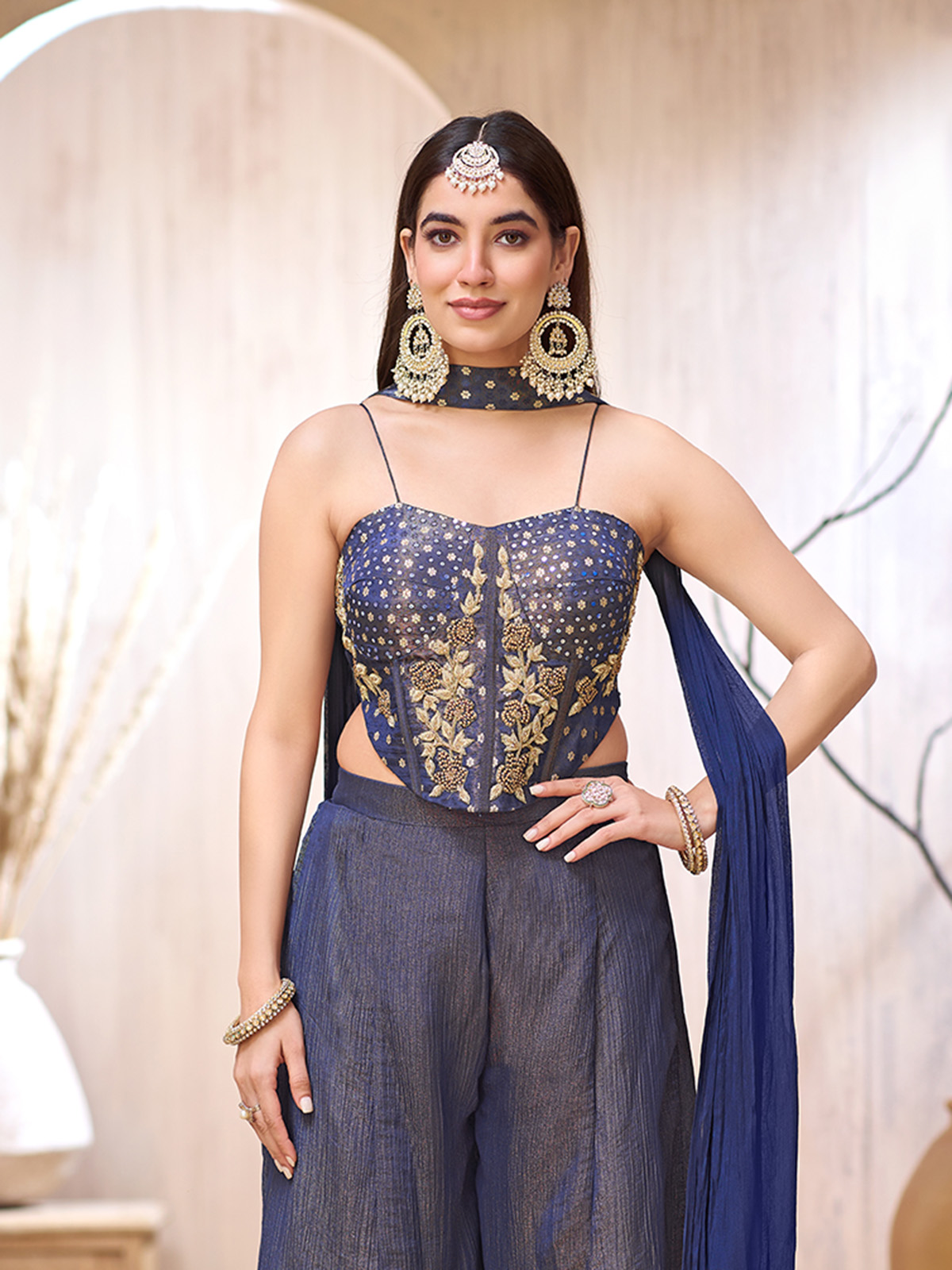 Radiant elegance shines through this blue chiffon designer palazzo suit crafted for glamorous occasions. The sleeveless kurti with a sweetheart neckline is richly adorned with cutdana, pearls, beads, sequins, zari and zardosi embellishments. Paired with flowing palazzo pants and a graceful dupatta, the ensemble creates a luxurious silhouette perfect for weddings and festive celebrations.