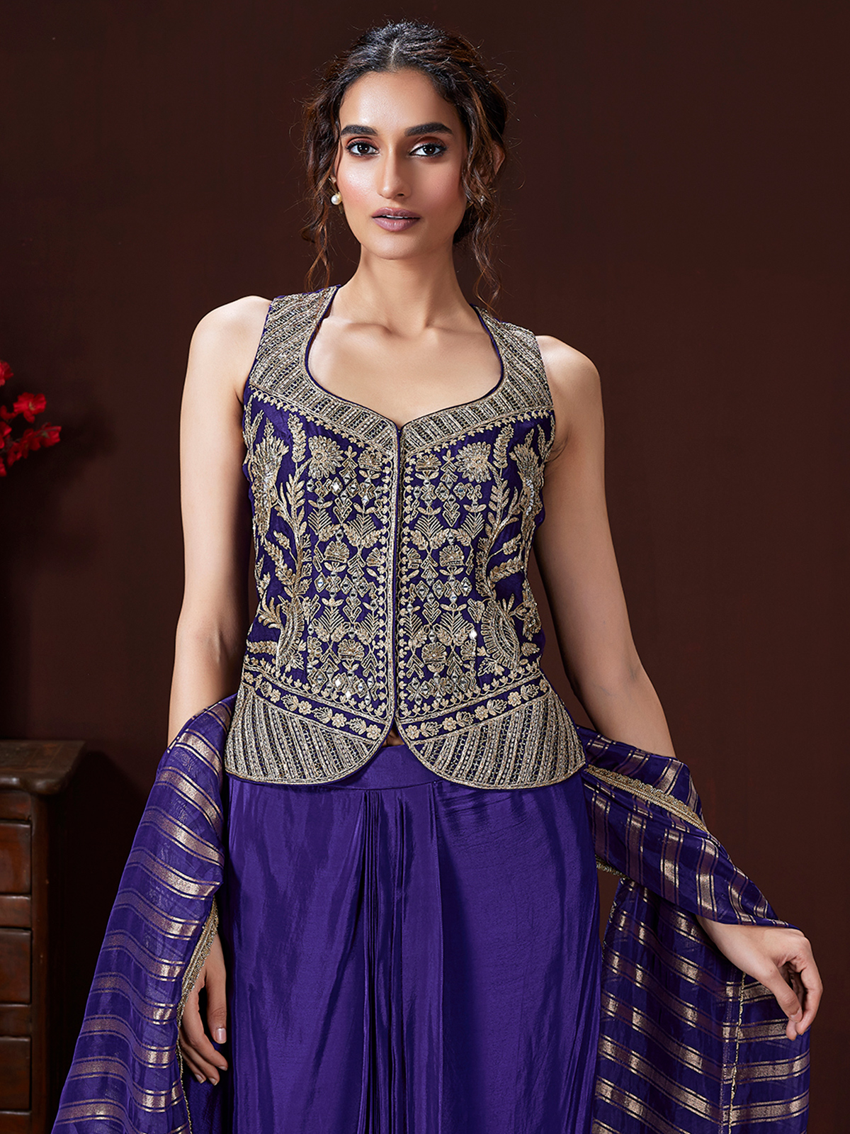 Let playful elegance accompany you in blue crepe, shimmering naturally under ambient light. Sequins, beads, and cutdana enrich the sweetheart-neck sleeveless top with artistic sparkle. Airy palazzo pants glide with ease, while the dupatta falls effortlessly, balancing tradition with modern charm.