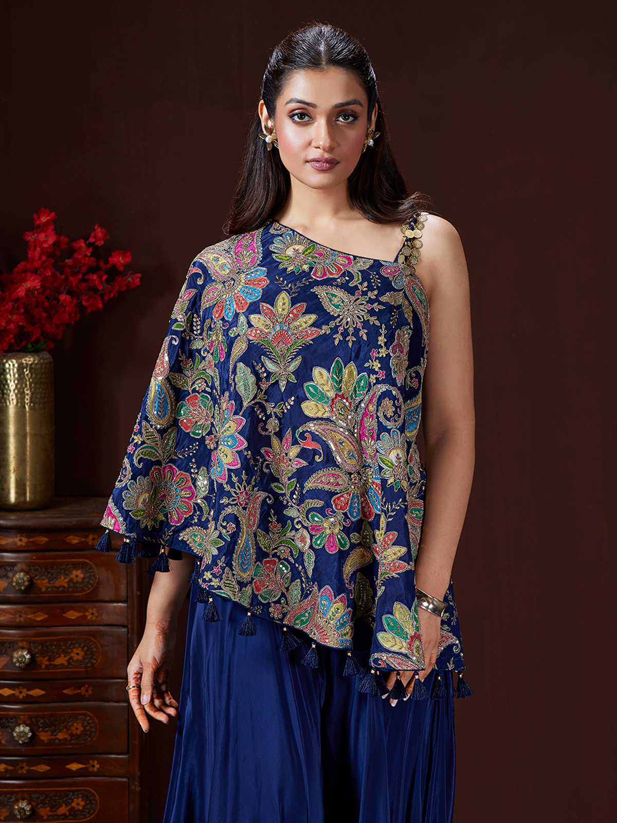 Glow with lively elegance in this blue satin silk ensemble. Sequins, resham, cutdana, and beads sprinkle delicate artistry across the top, shimmering as you move. Palazzo pants create fluid waves beneath, adding a soft, modern poetry to this luminous festive attire.