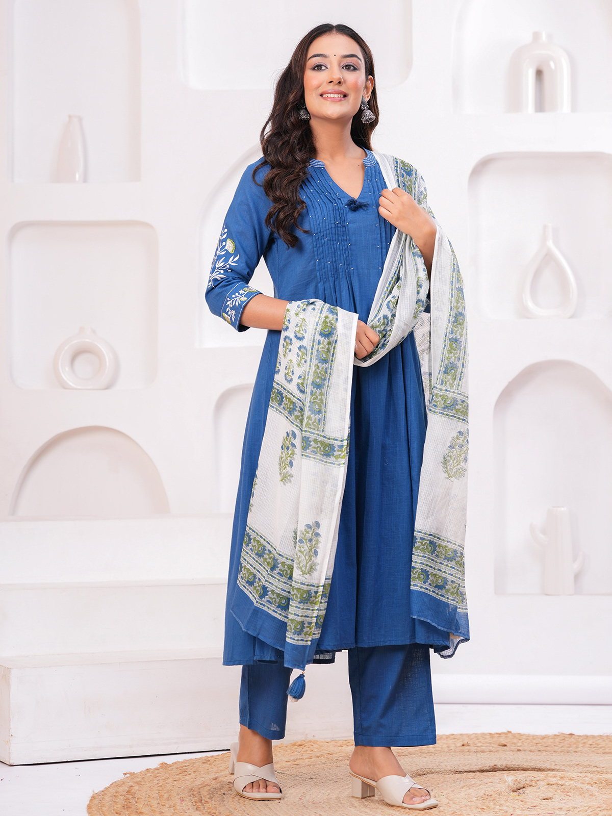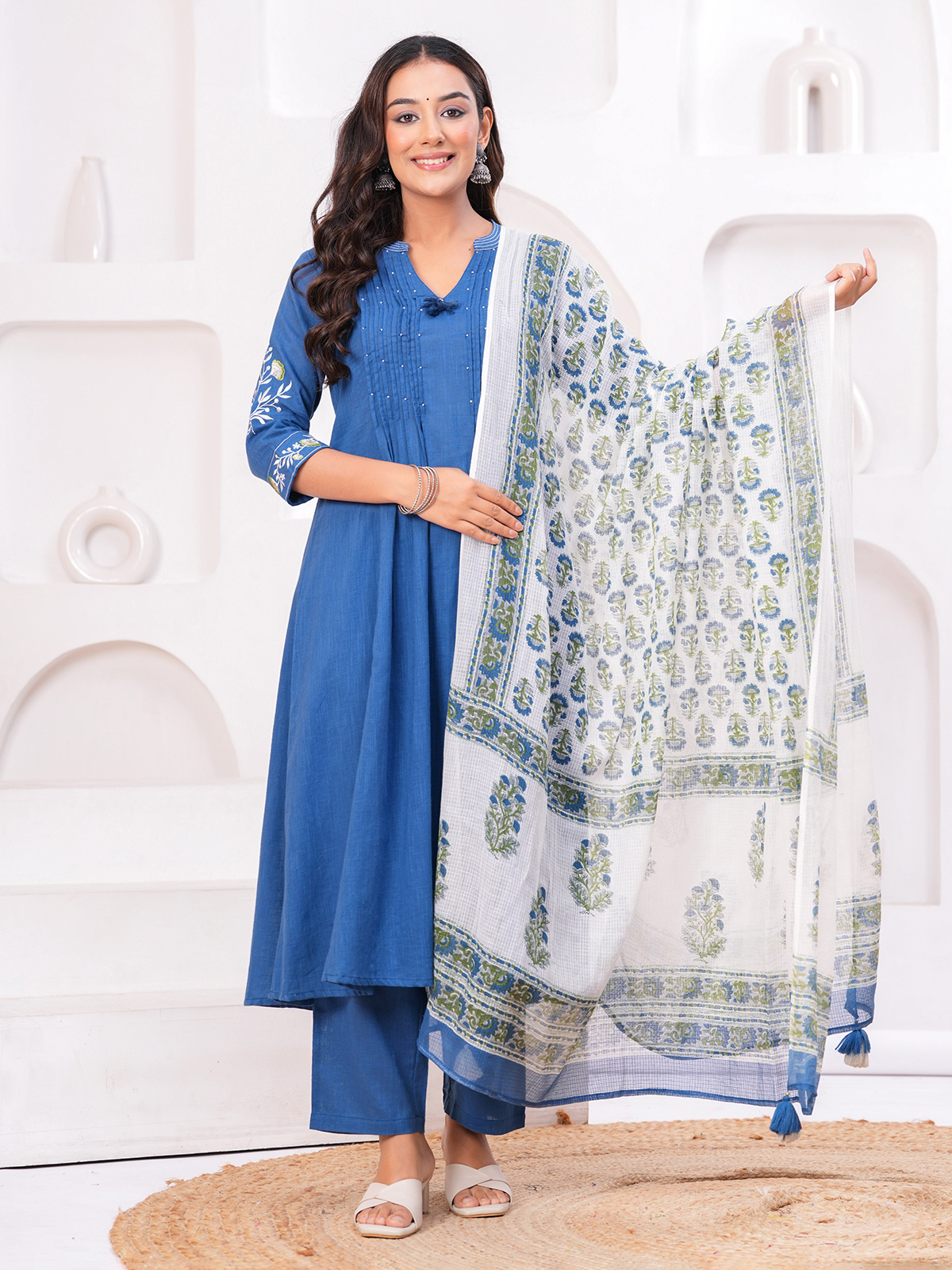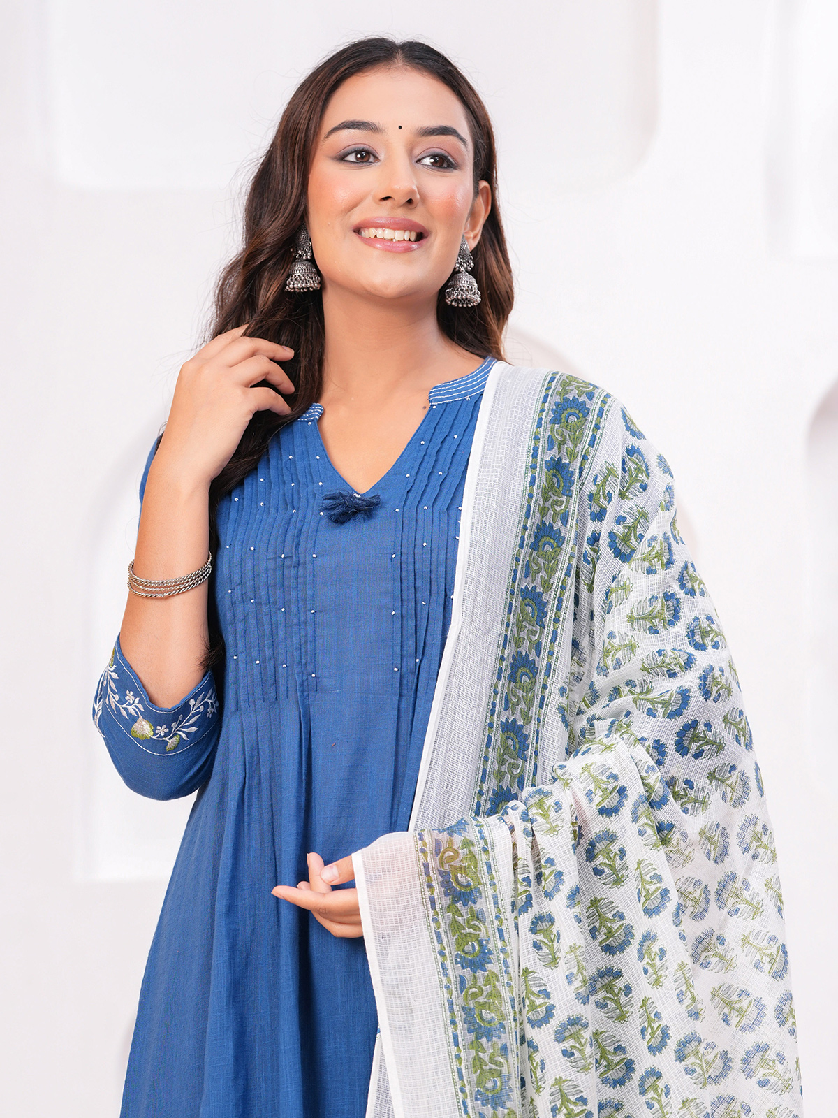 Blue Linen Embroidered Beaded Suit With Palazzo And Dupatta