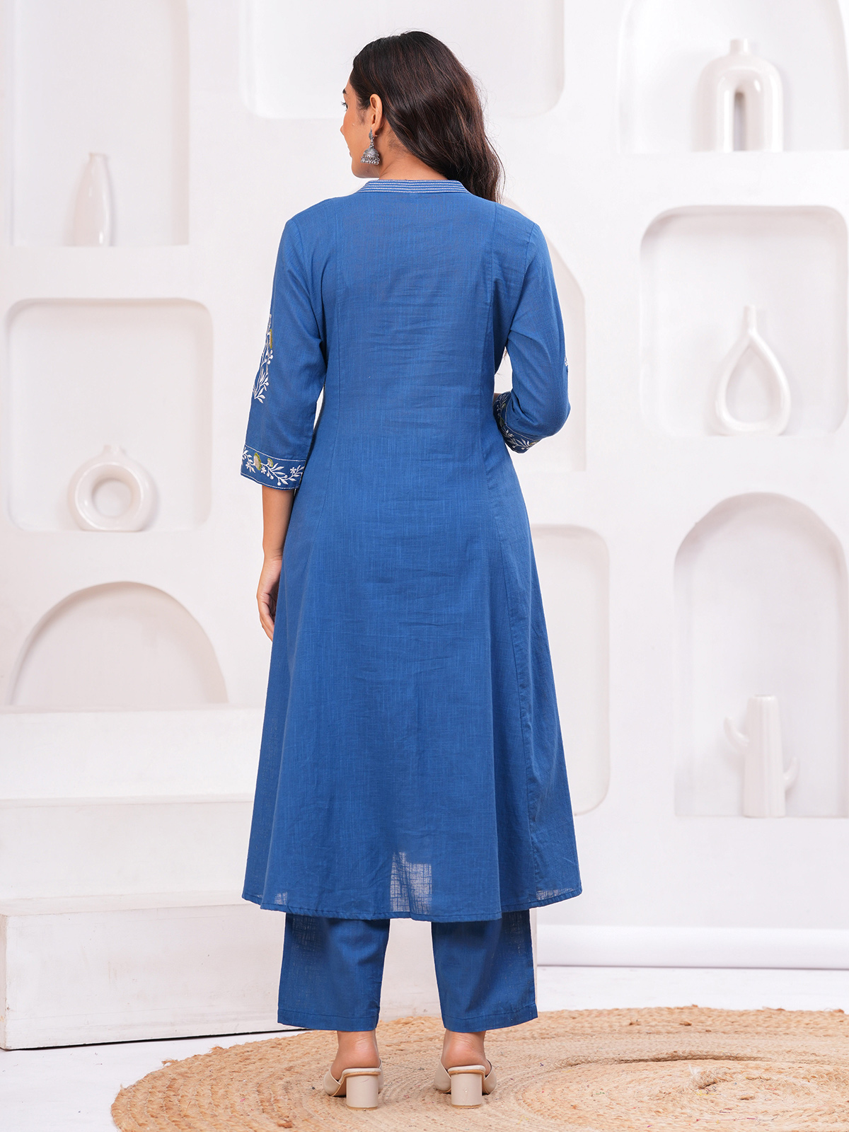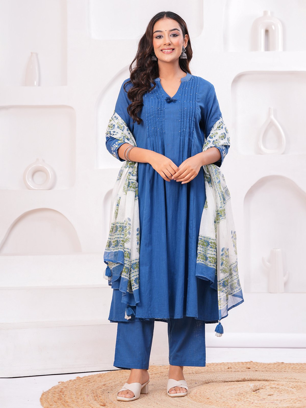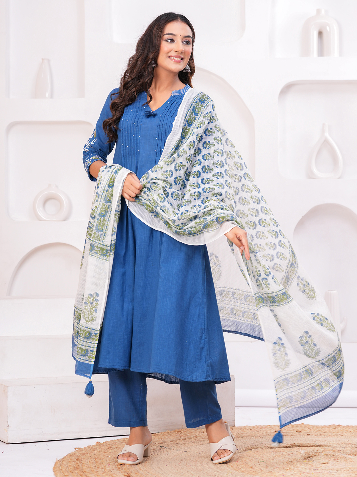 Blue Linen Embroidered Beaded Suit With Palazzo And Dupatta