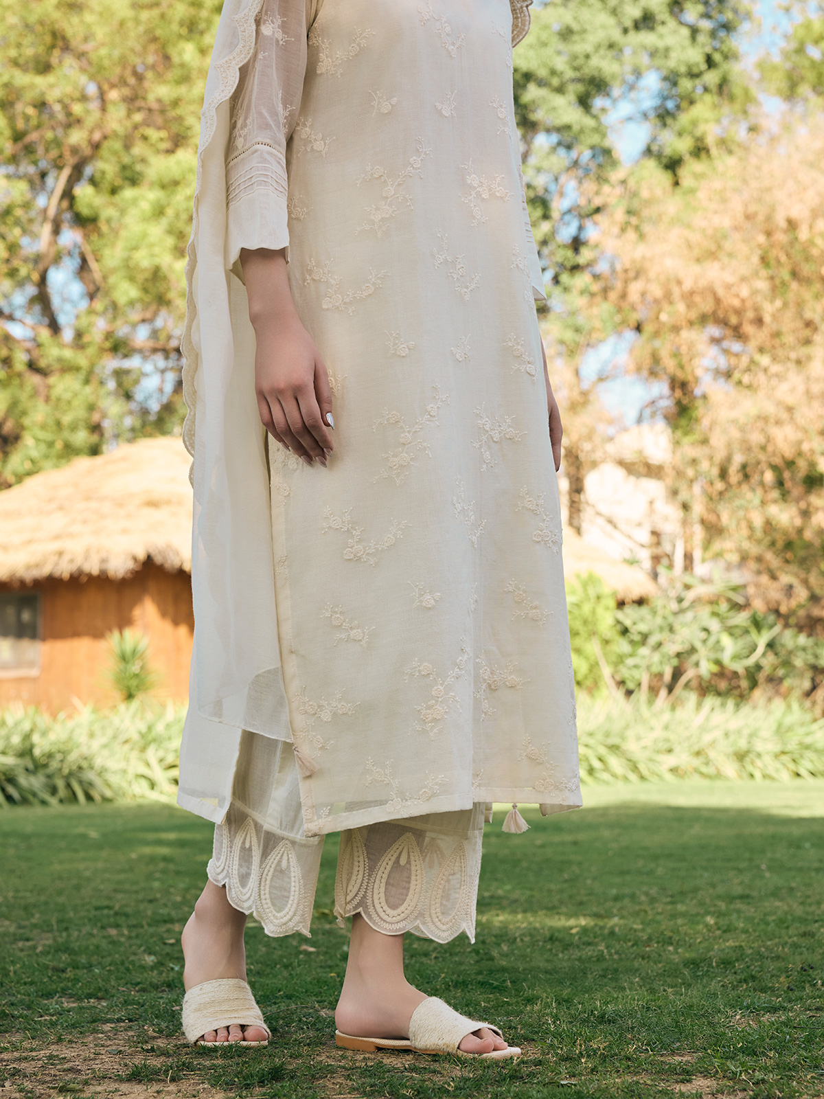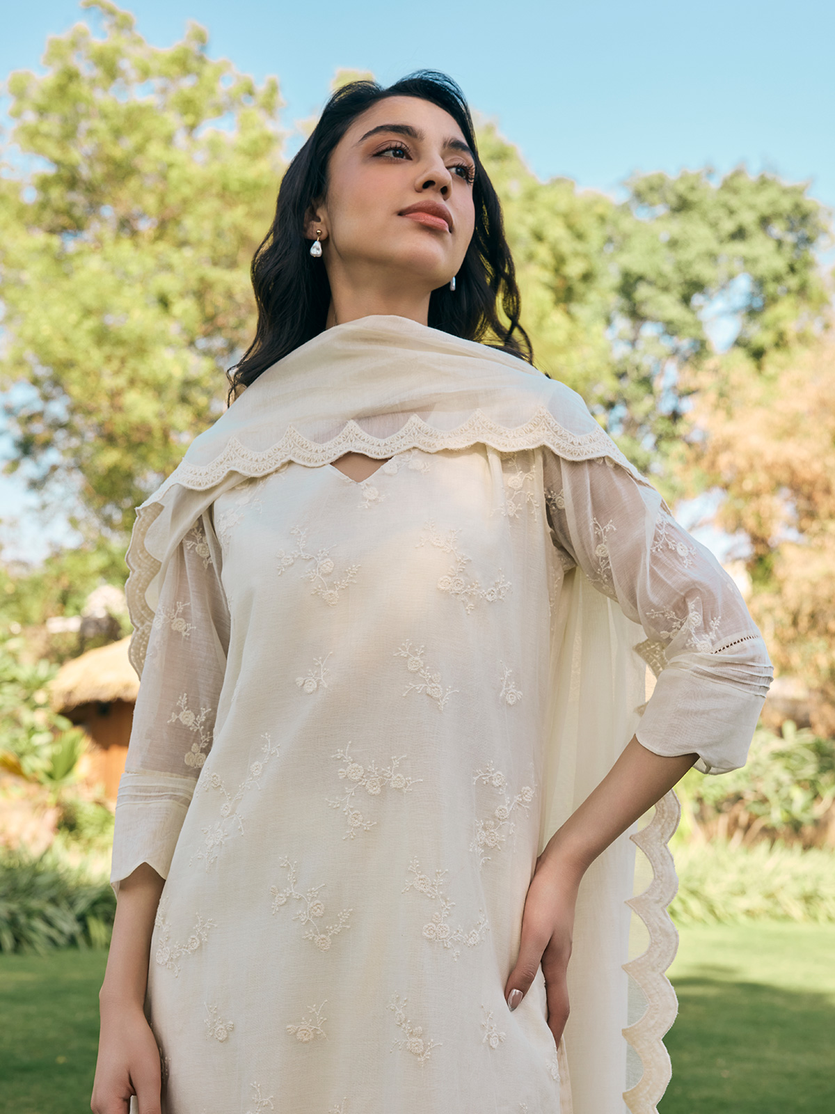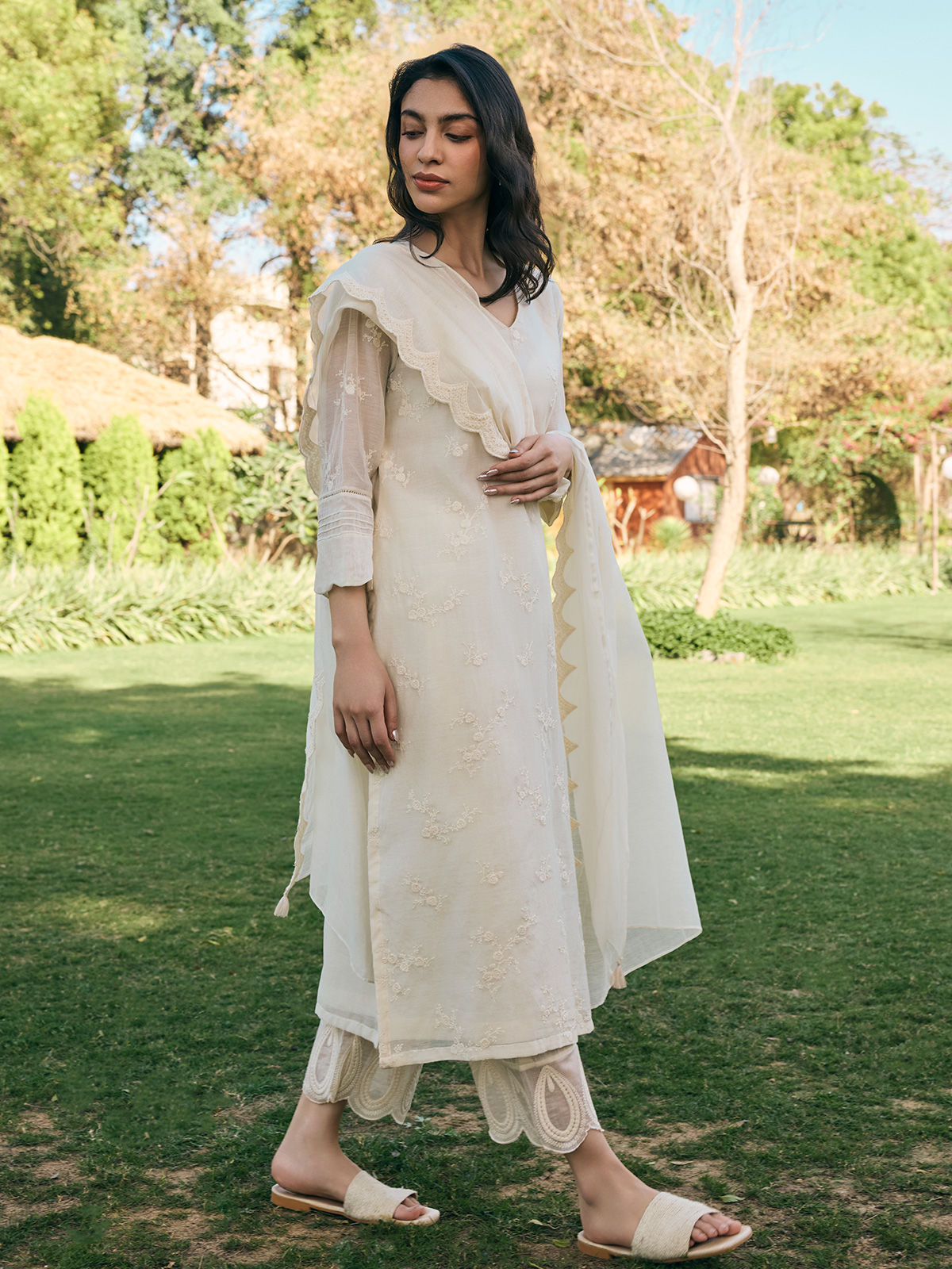 Exude grace in our elegant beige muslin cotton salwar suit, exquisitely embroidered to perfection. Paired with a matching dupatta, it is your go to choice for refined celebrations.