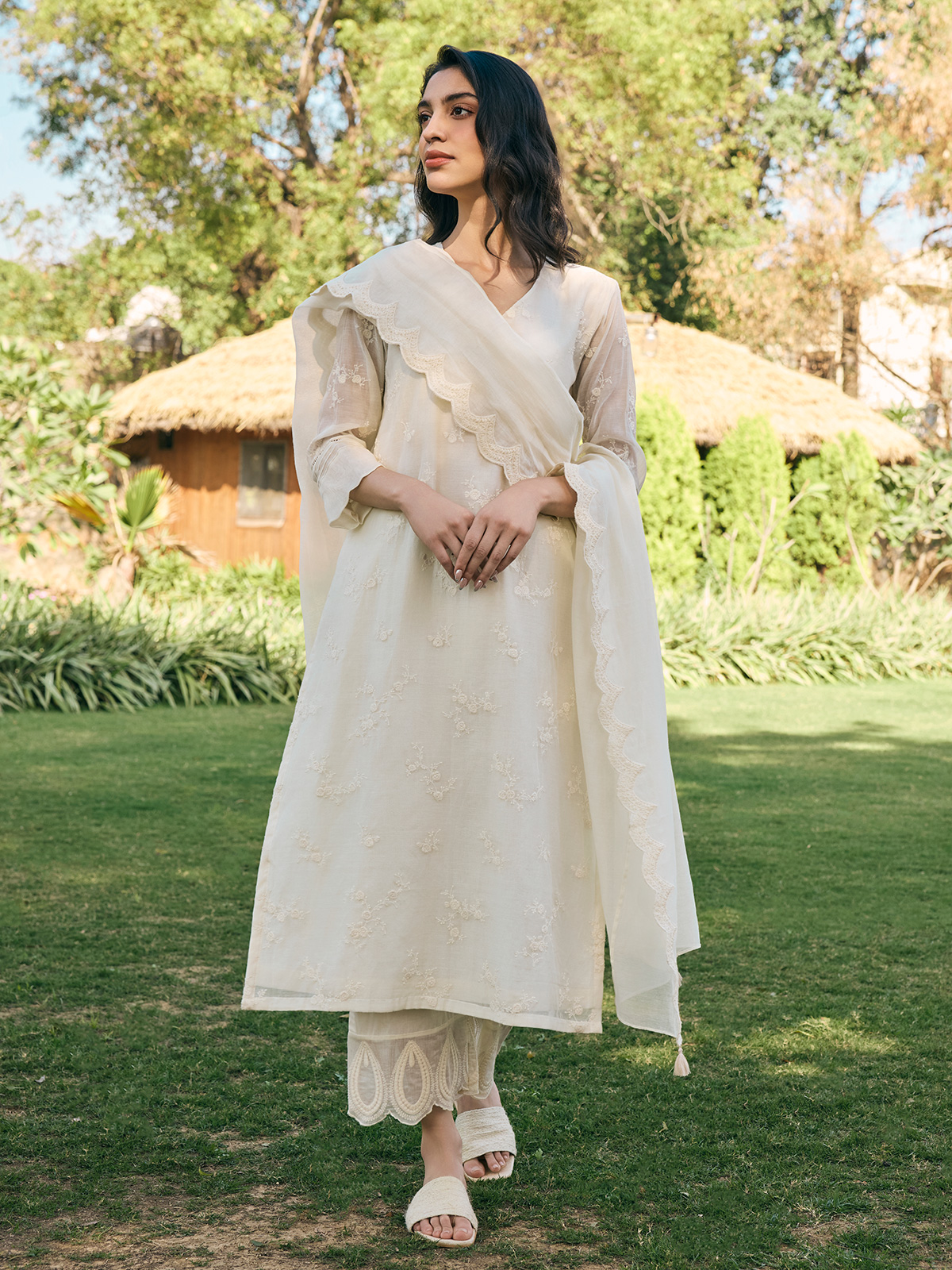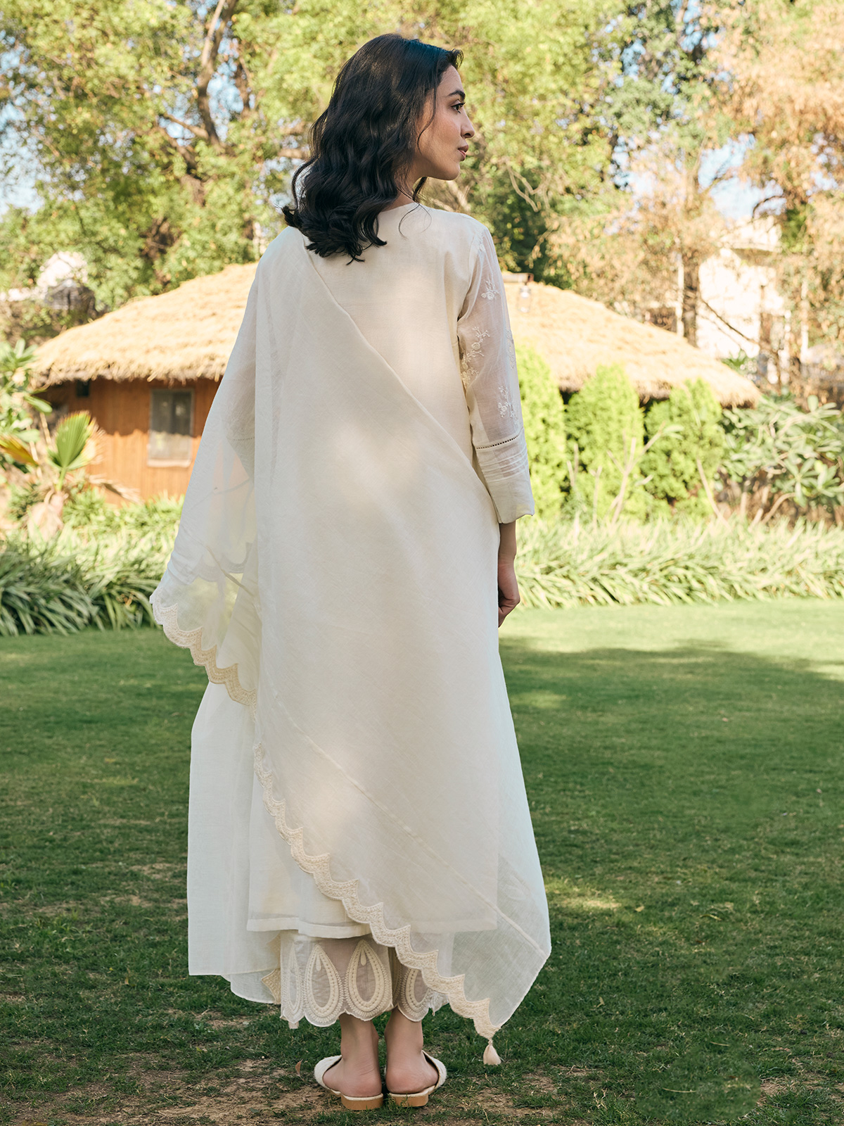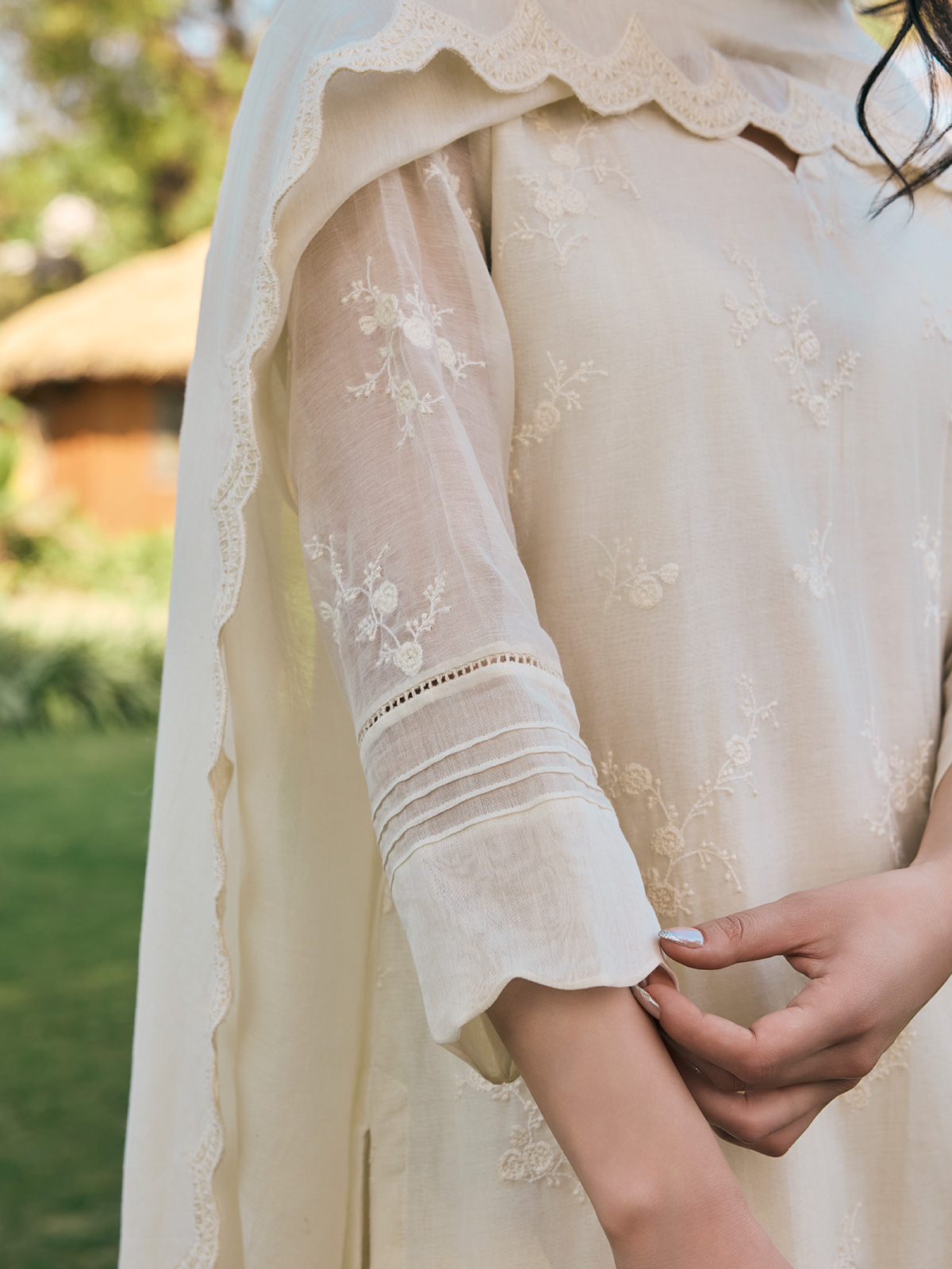 Exude grace in our elegant beige muslin cotton salwar suit, exquisitely embroidered to perfection. Paired with a matching dupatta, it is your go to choice for refined celebrations.