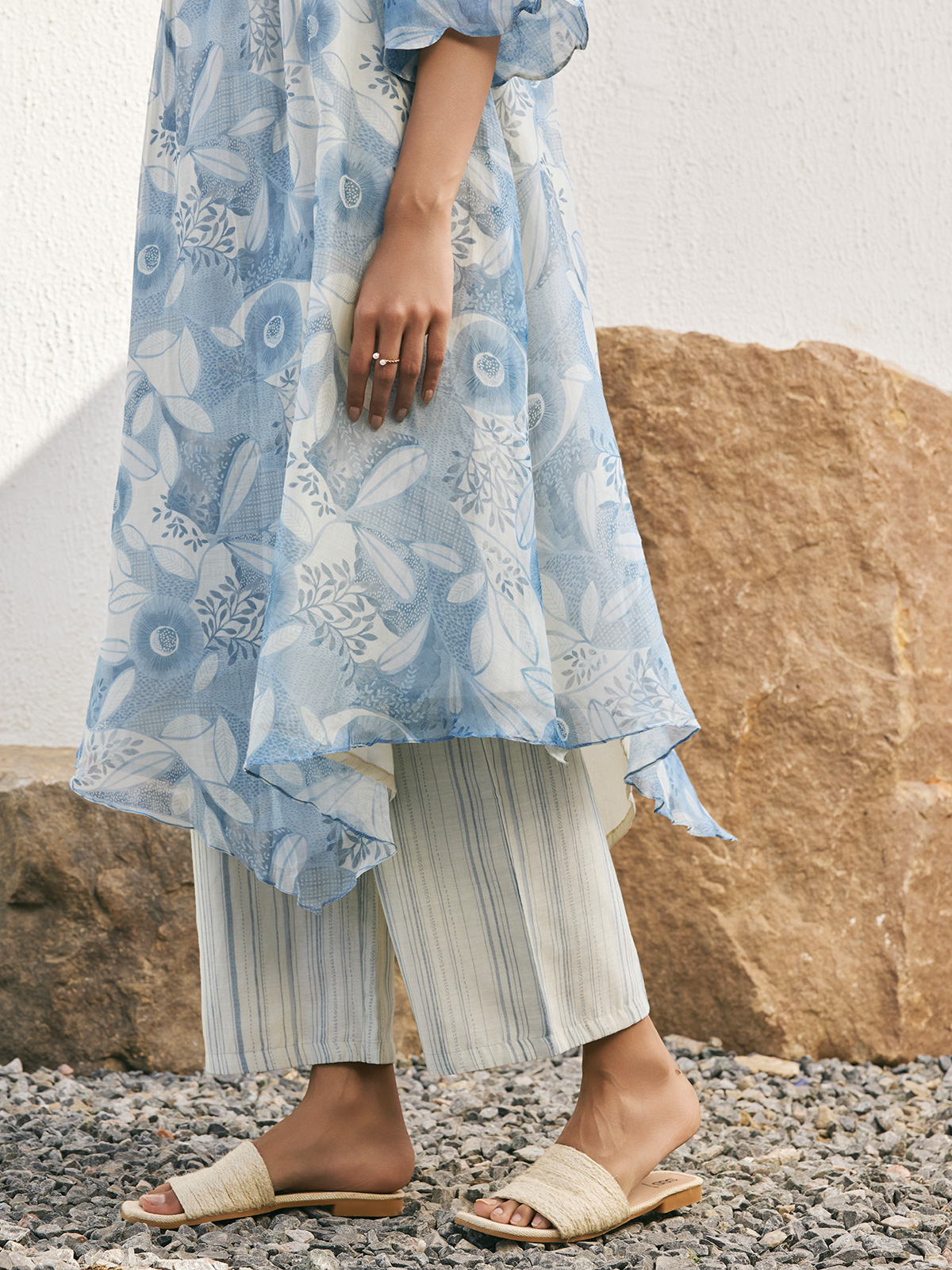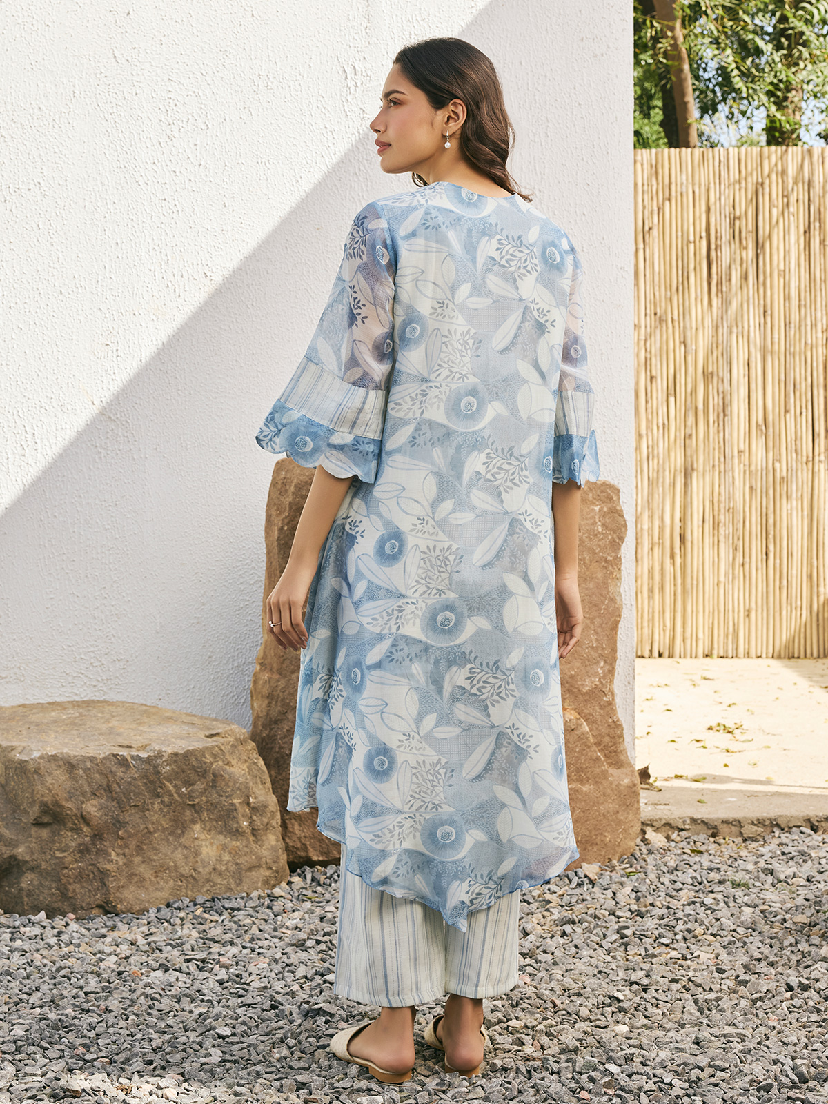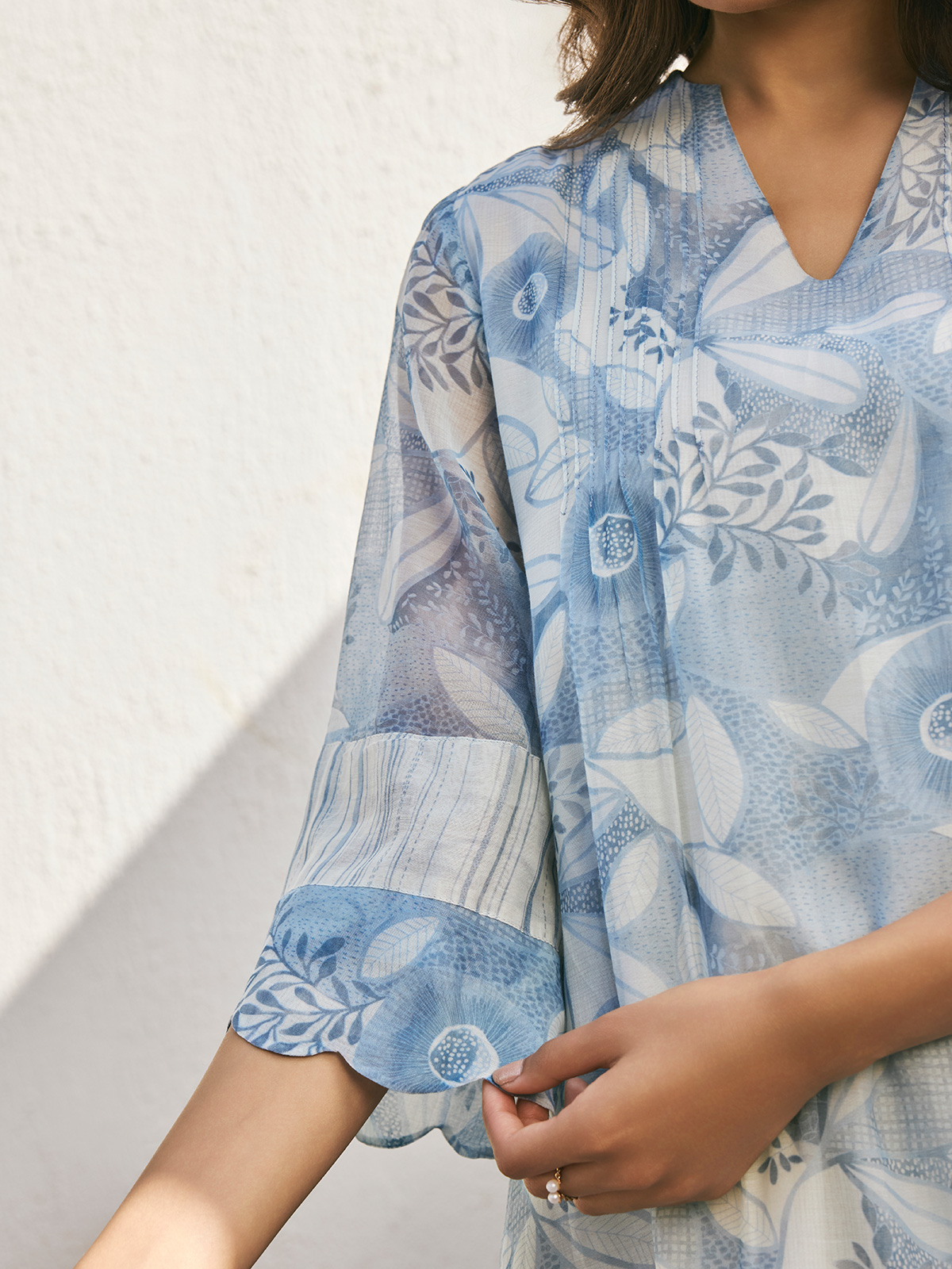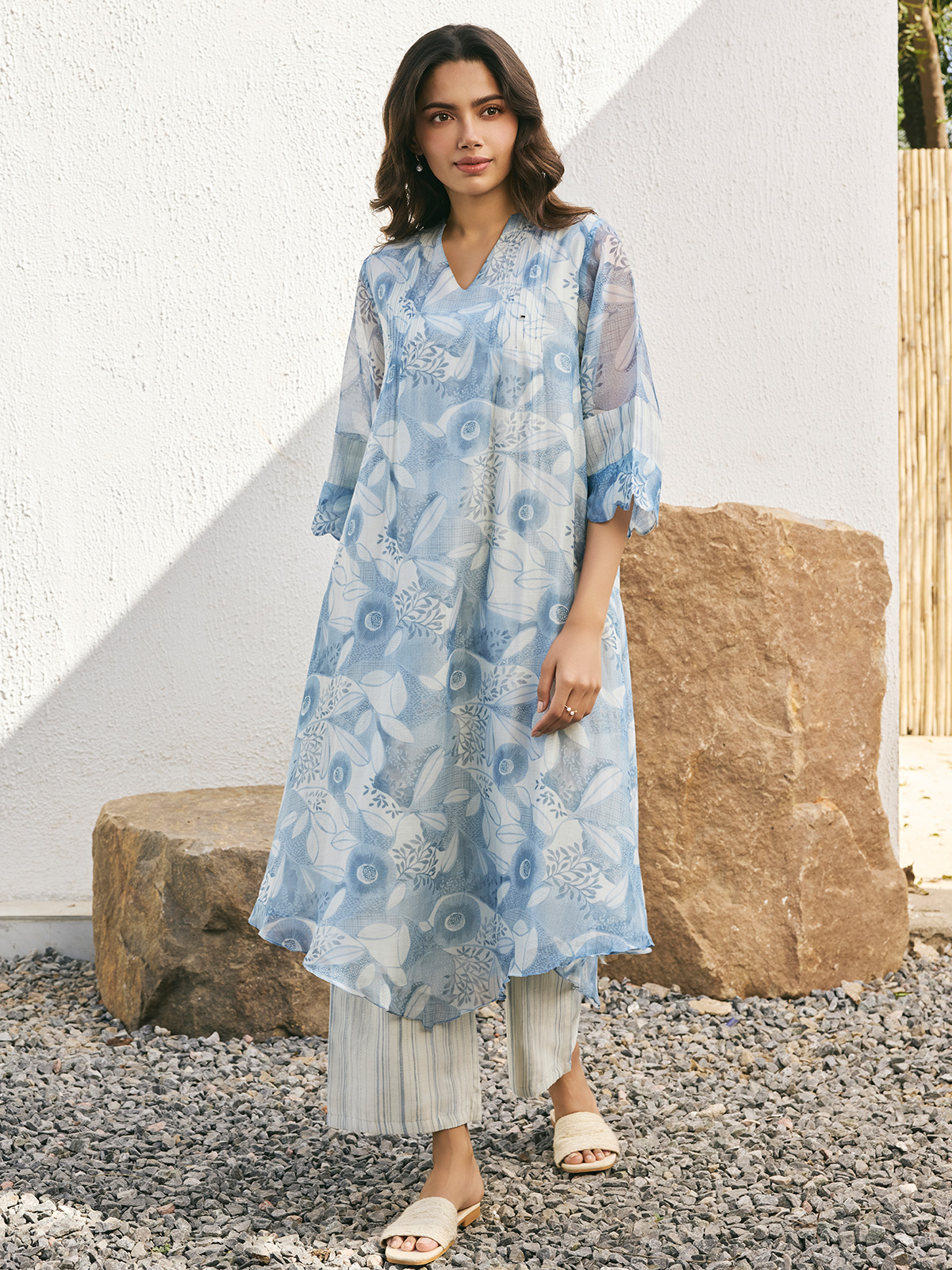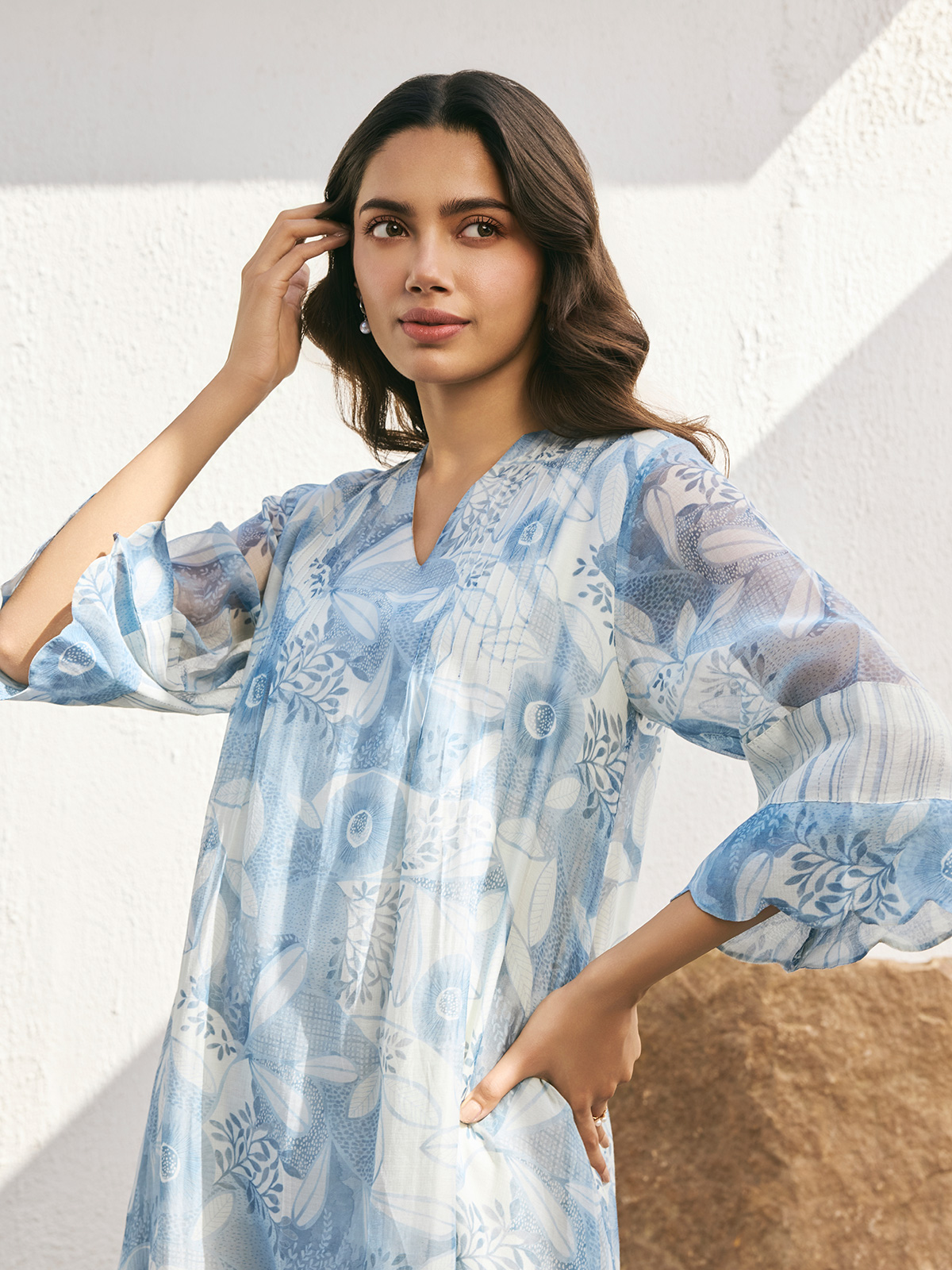 Celebrate in style with our stunning blue muslin cotton printed salwar suit, featuring a flattering V neck and quarter sleeves for a touch of refined elegance.