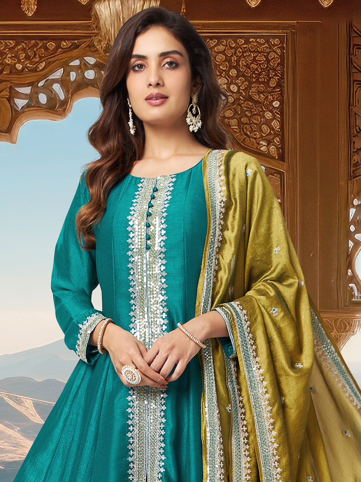 For any traditional event, this vibrant blue silk salwar suit with a chic dupatta is a fantastic option. Embellished with thread work, resham, and sequins.