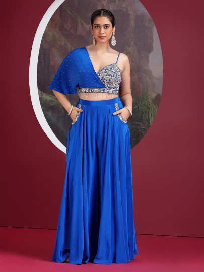 Crafted in rich blue satin silk, this salwar suit stands out with intricate cutdana, sequin, pearl, and bead embellishments. Designed with a sweetheart neckline and paired with a flowing palazzo, it delivers a glamorous festive look perfect for weddings, party wear events, and receptions.