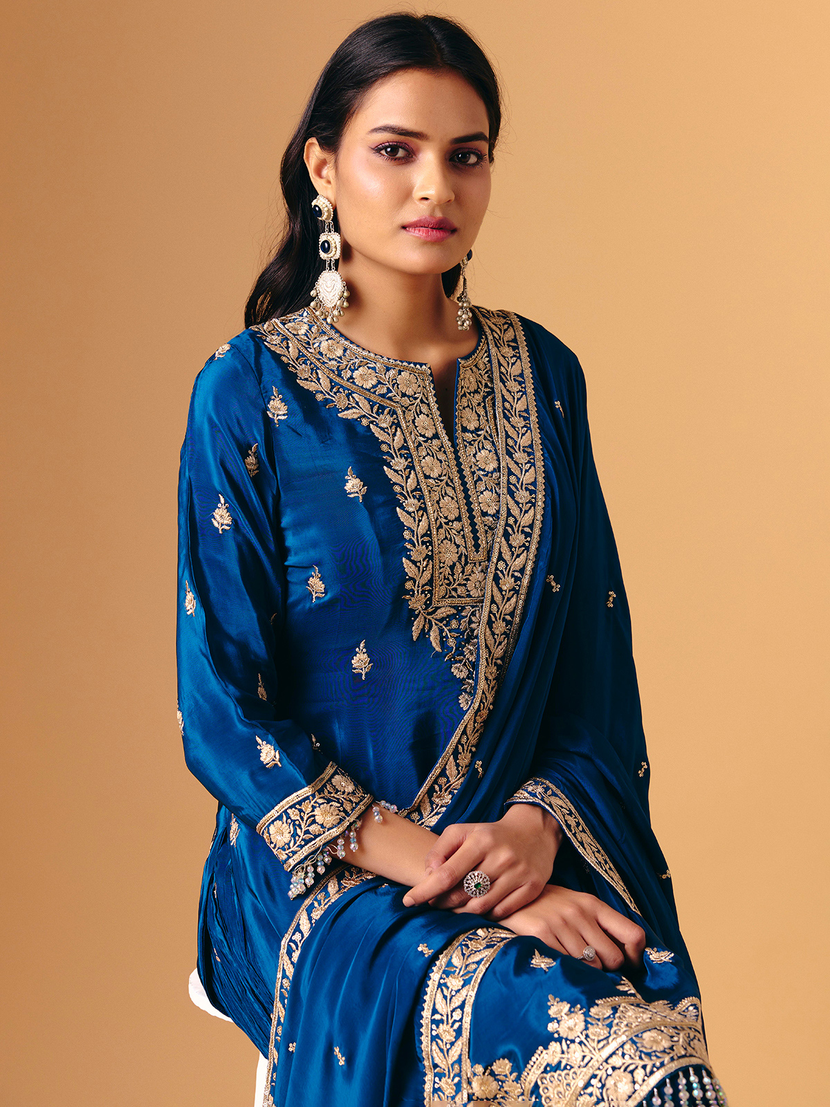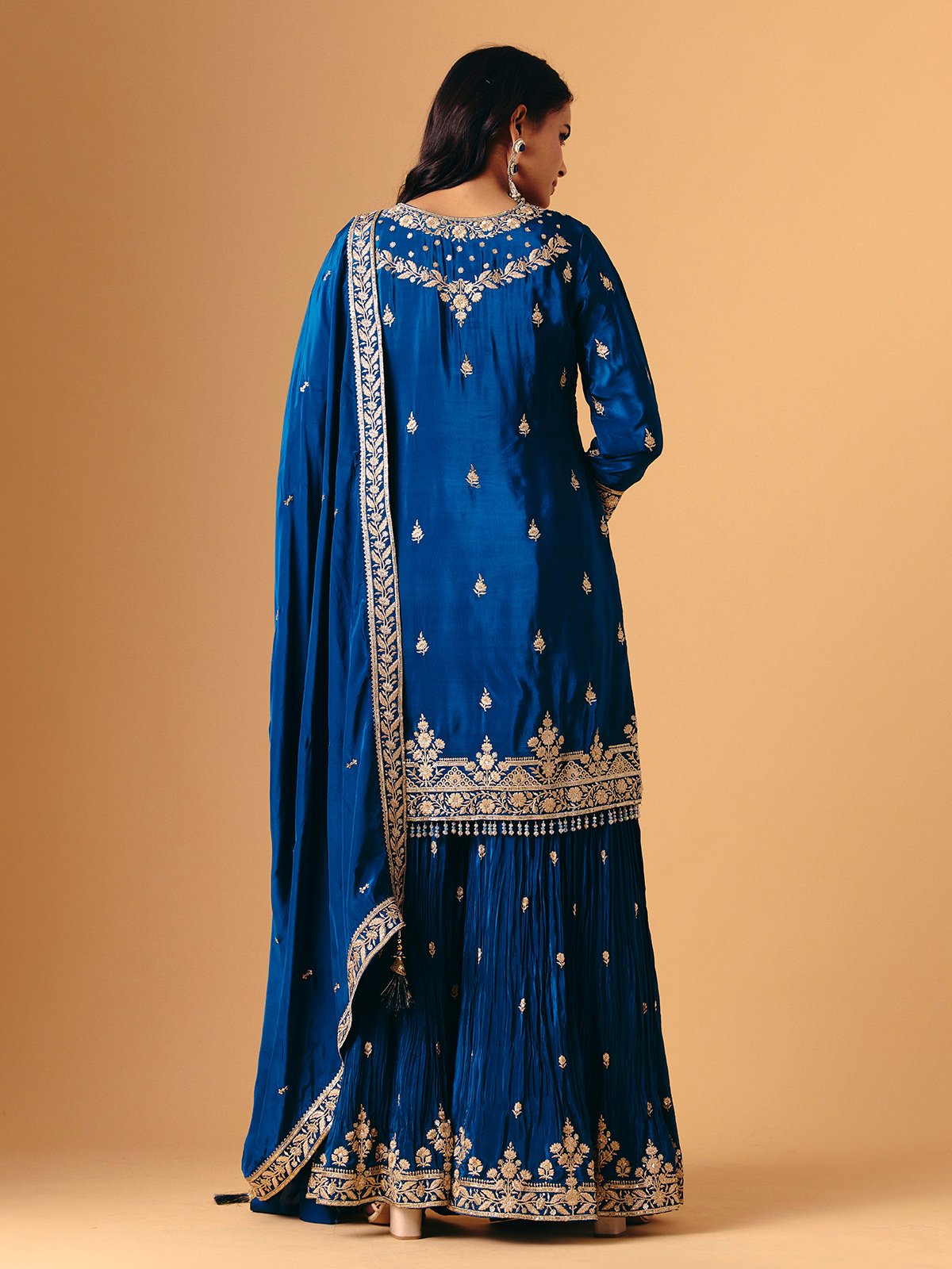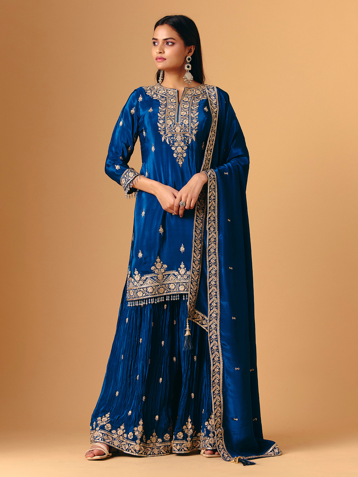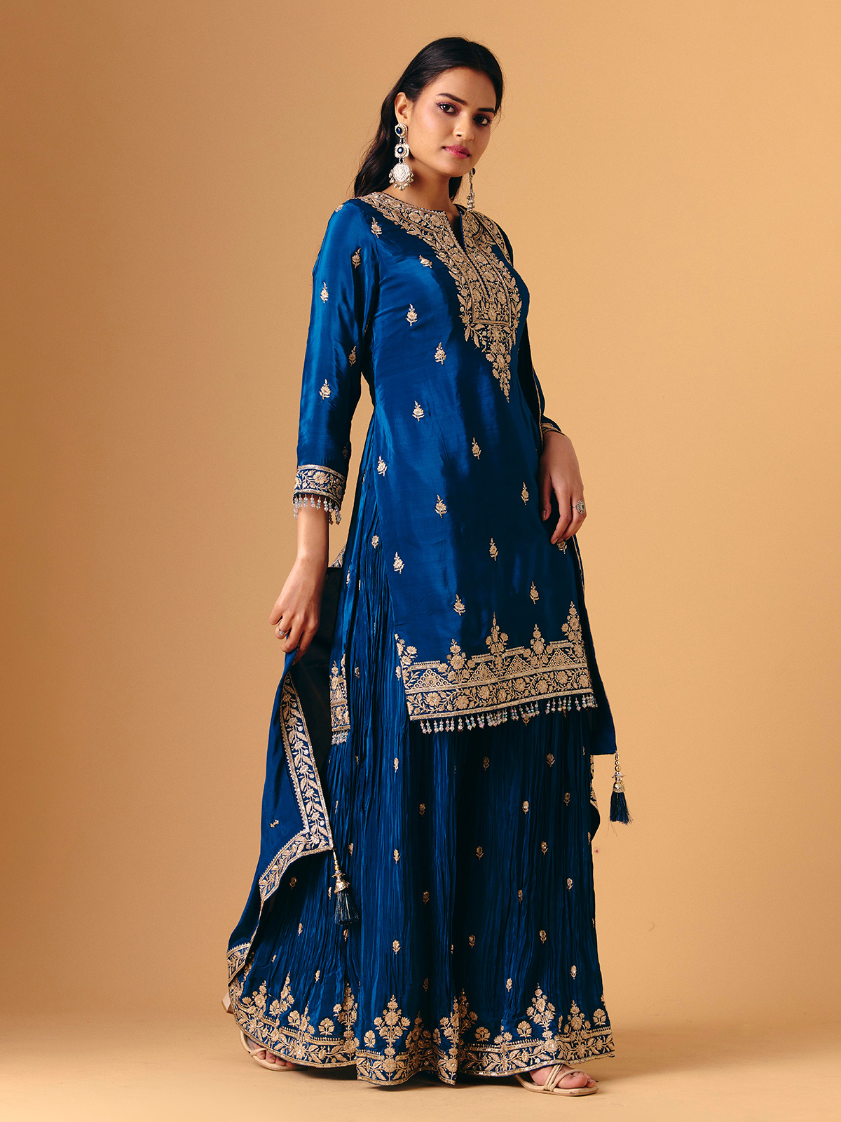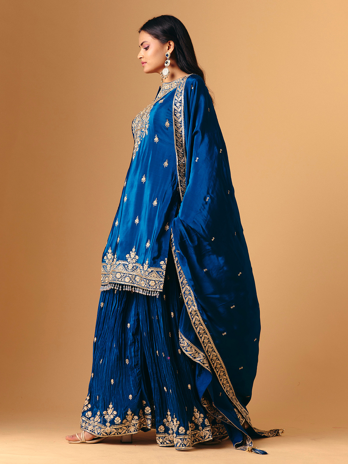 This blue silk palazzo design features luxurious beadwork, cutdana, sequins, zari and stone accents. Quarter sleeves keep the look balanced, while the palazzo drapes smoothly for comfort. A matching dupatta completes the ensemble, creating a rich ethnic style with luminous depth and refined detailing.
