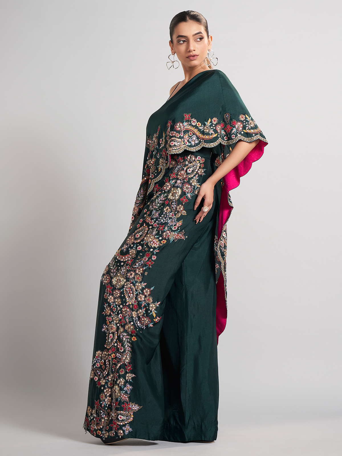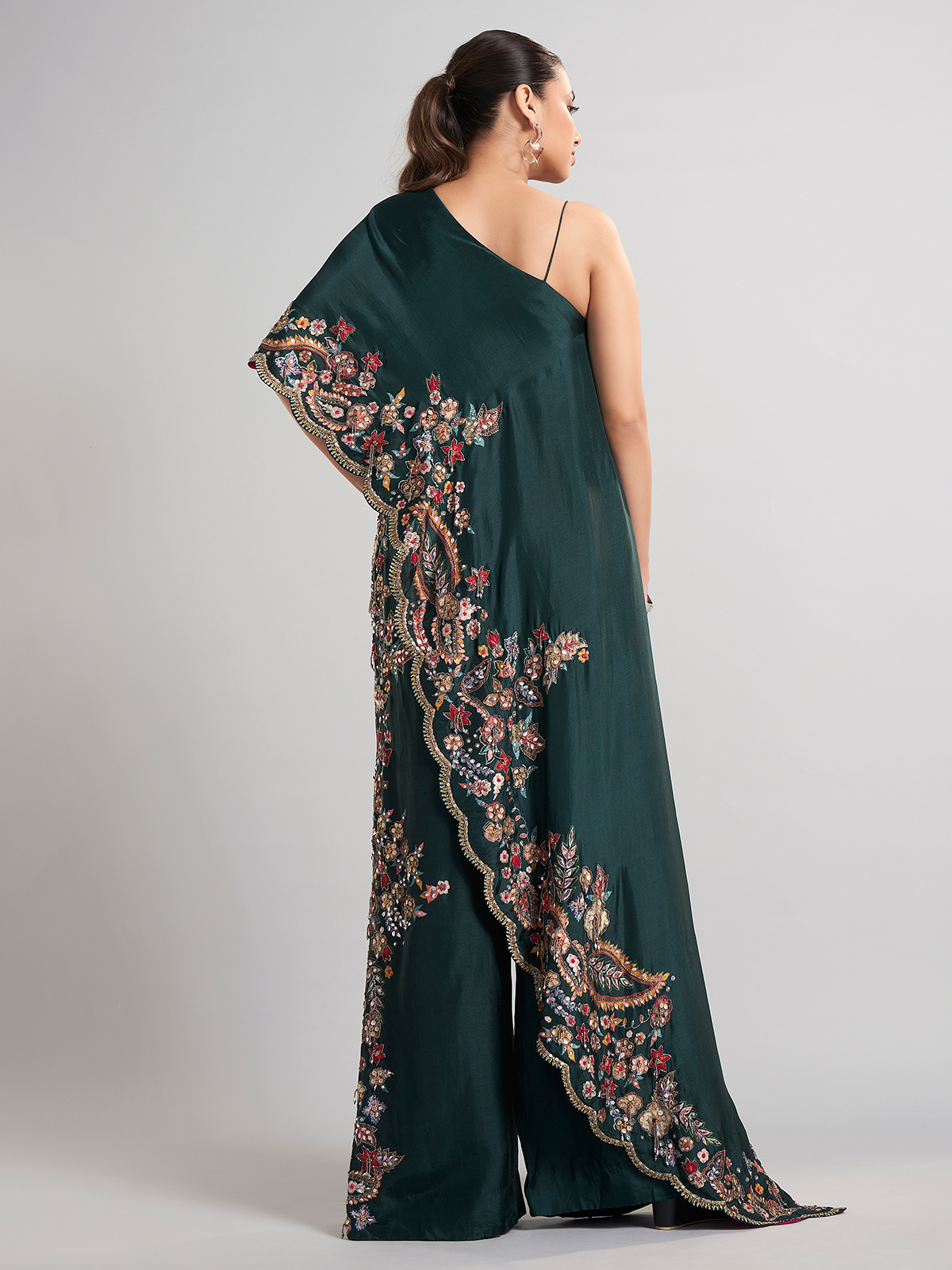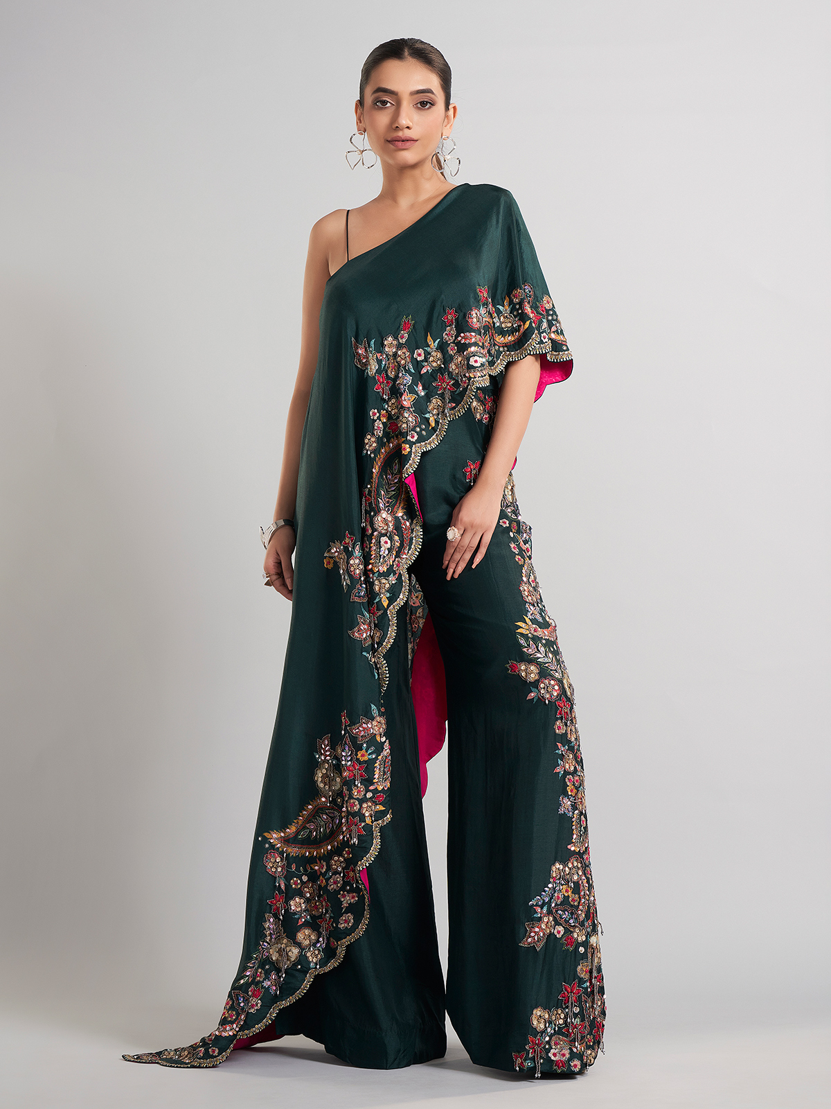 A striking bottle green silk palazzo suit featuring sequins, beads, cutdana, thread, and stones. This elegant attire is perfect for receptions, weddings, and festive parties.