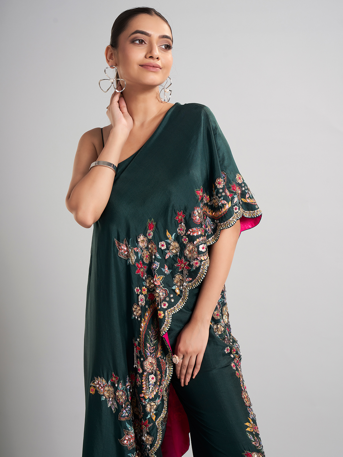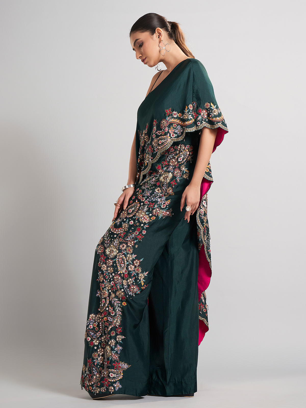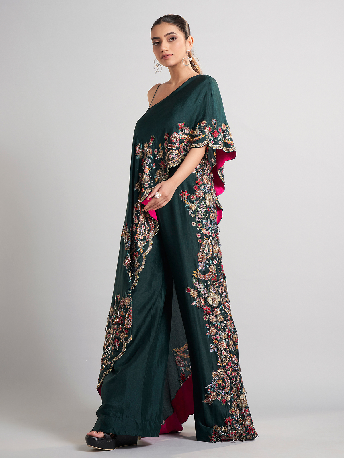 A striking bottle green silk palazzo suit featuring sequins, beads, cutdana, thread, and stones. This elegant attire is perfect for receptions, weddings, and festive parties.