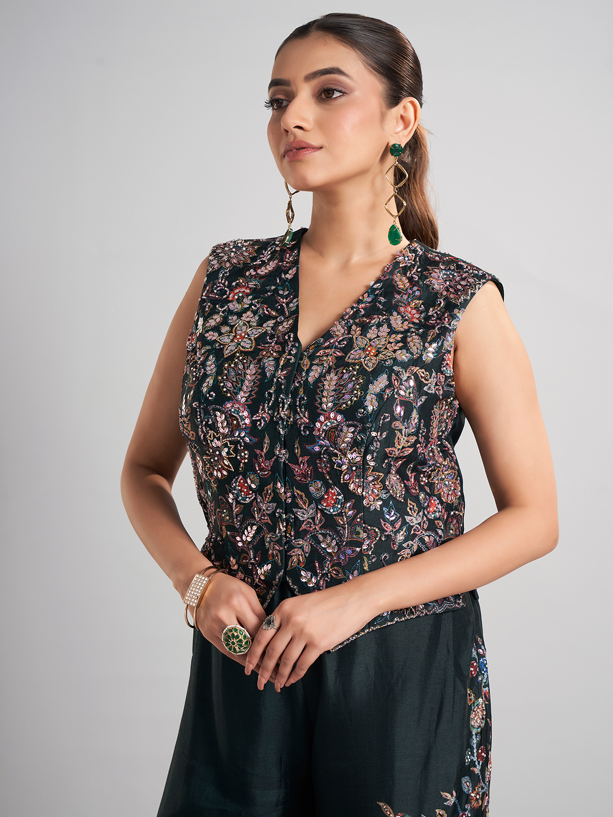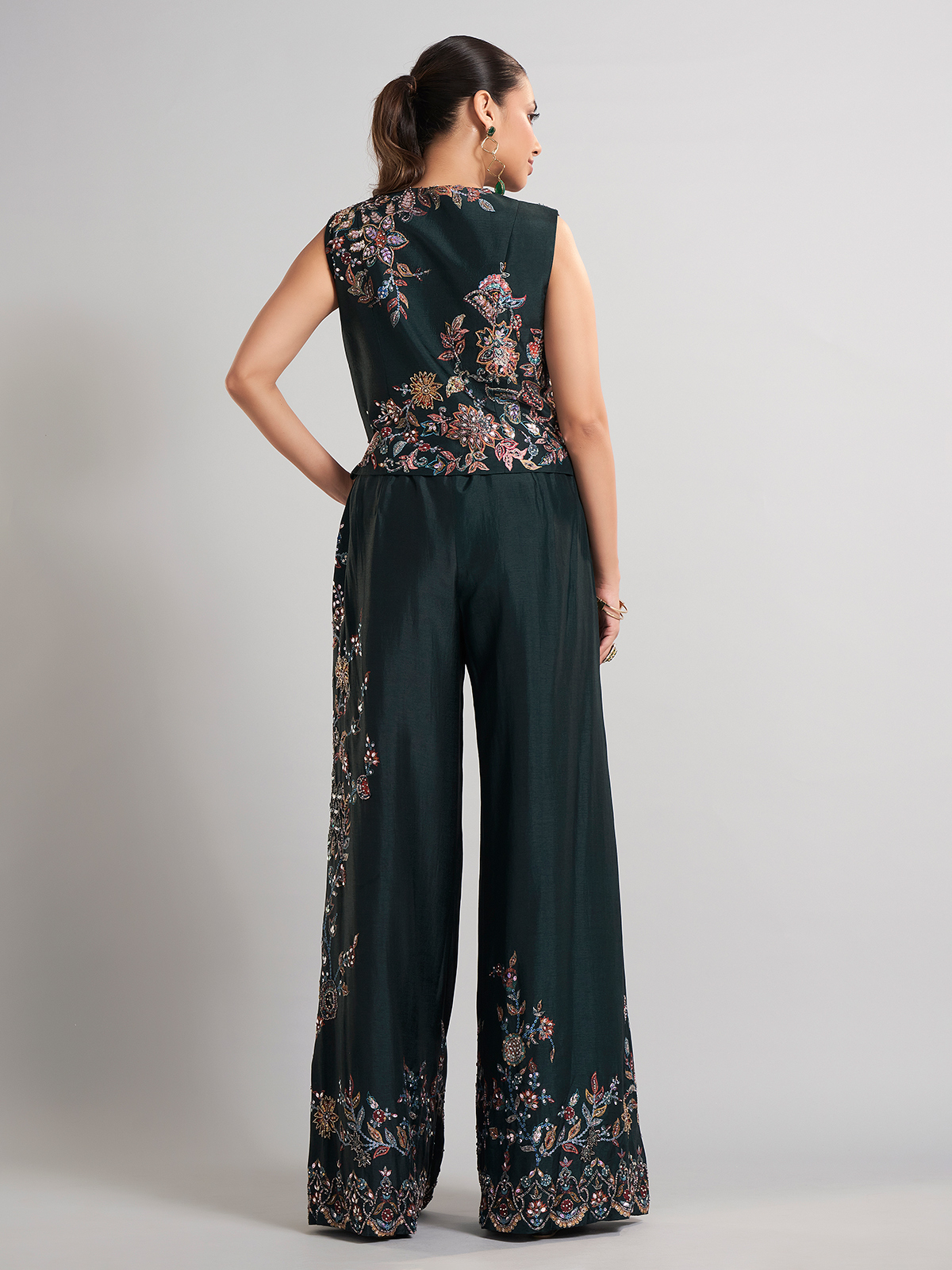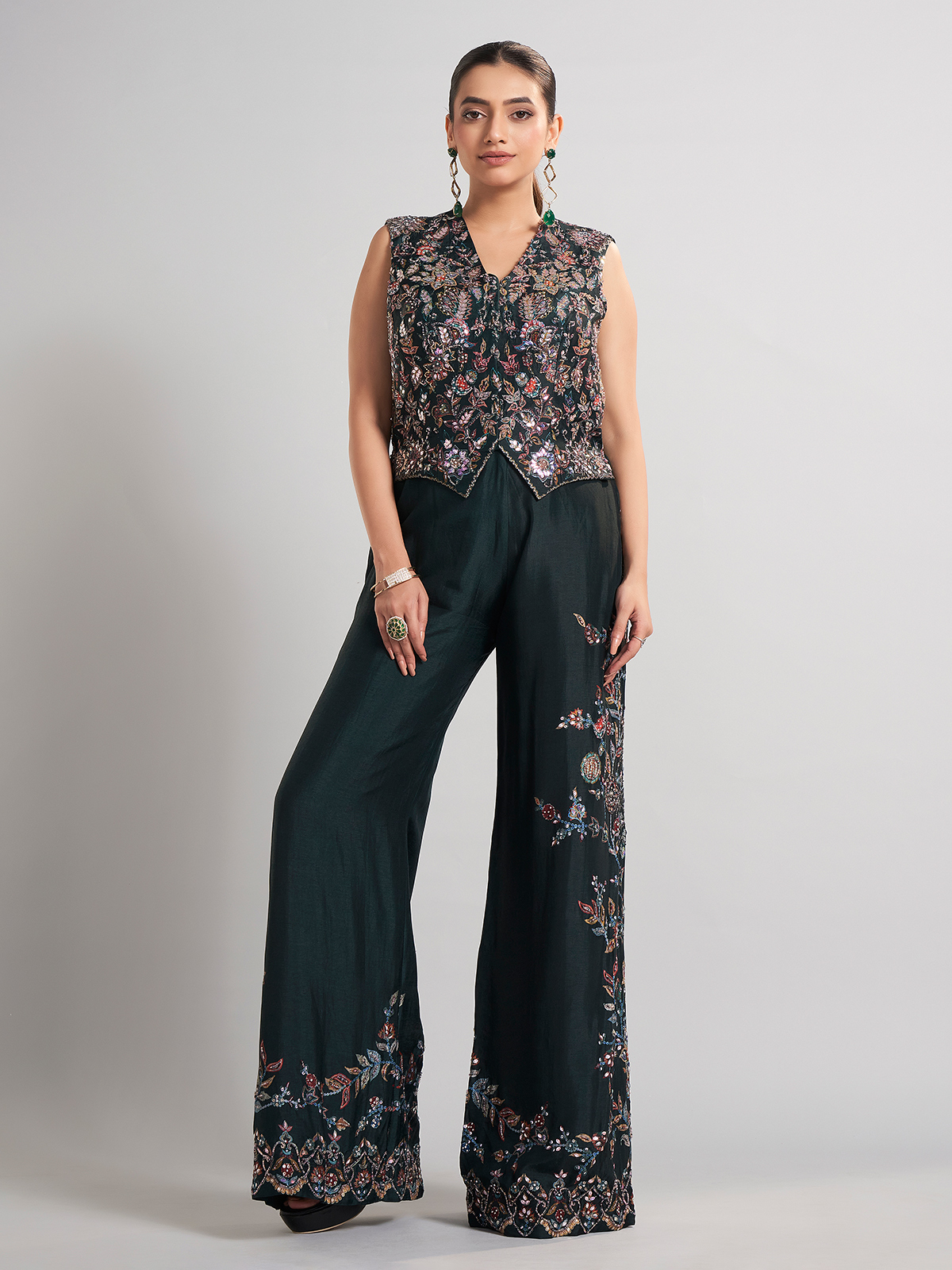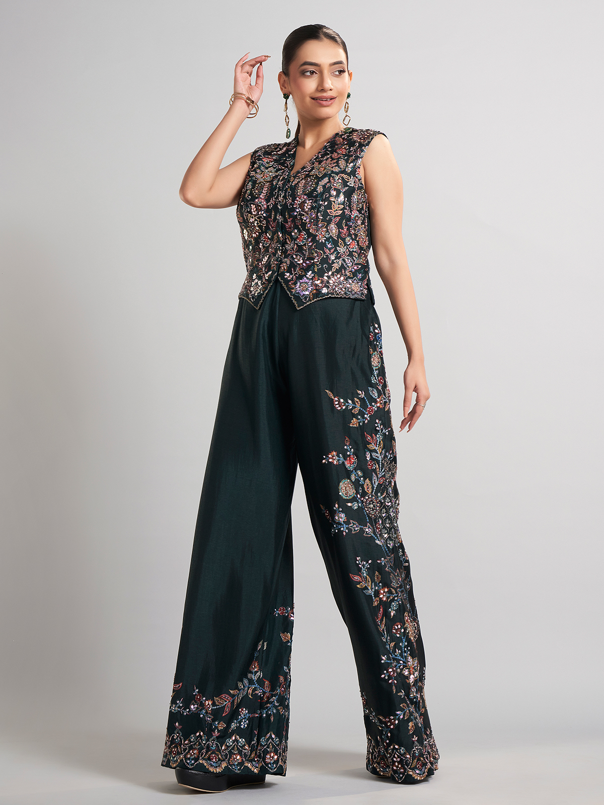 Dazzling in bottle green silk, this sleeveless palazzo suit with V-neckline is adorned with sequins, pearls, beads, and cutdana. A sophisticated pick for weddings, receptions, and sangeet evenings.
