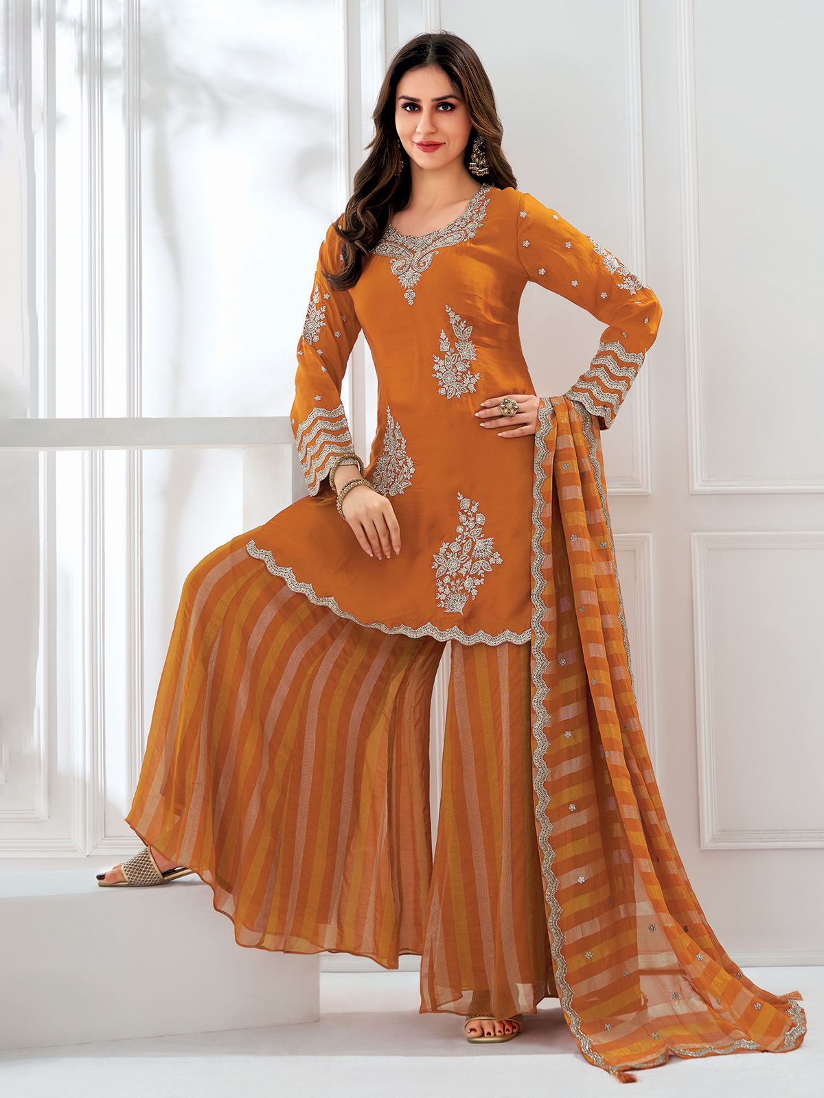 Bright And Elegant Orange Satin Palazzo Suit For Festive Days