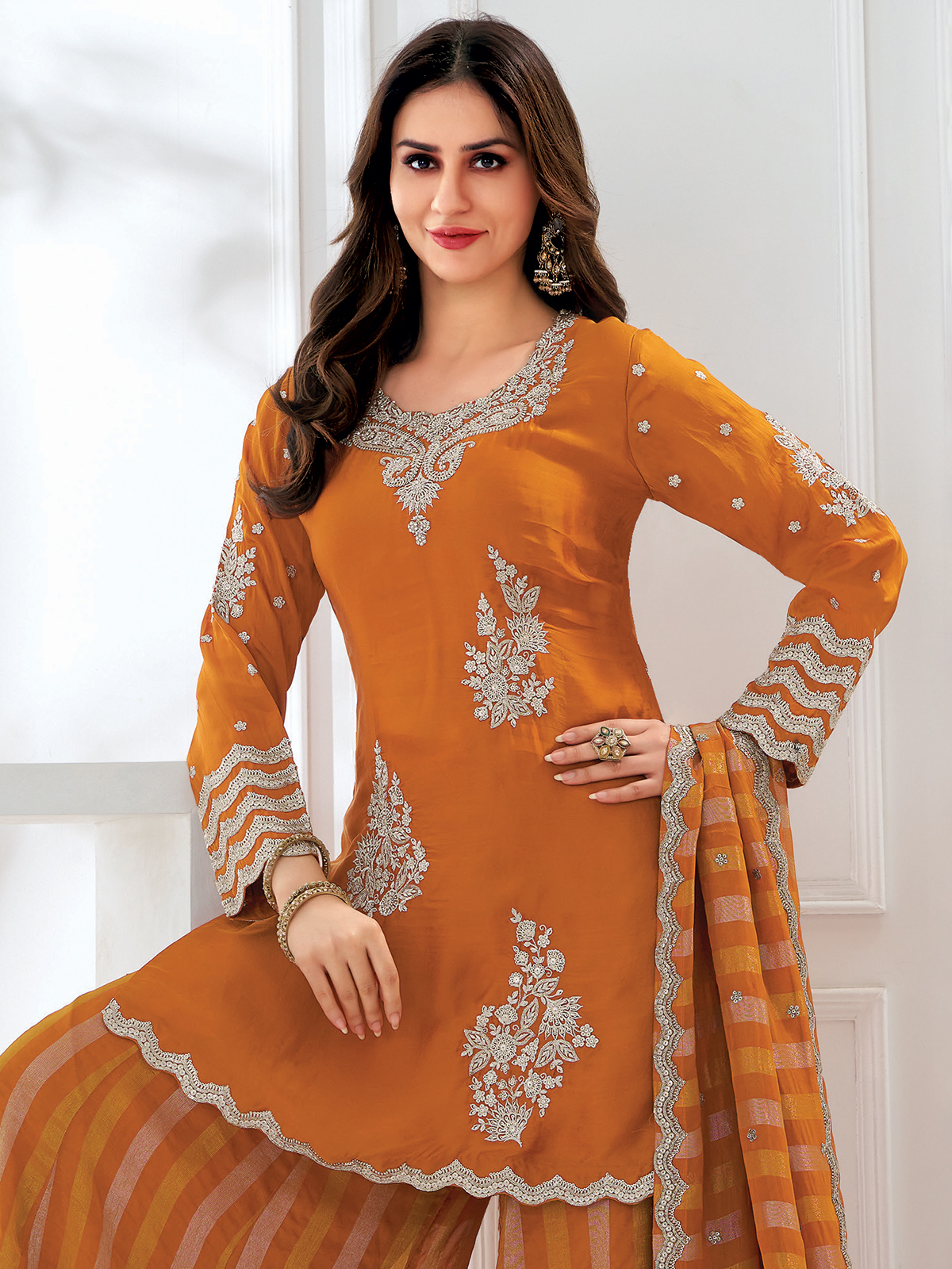Designed for festive finesse, this orange satin palazzo suit shines with sequins and resham work. A round neck and full sleeves ensure both style and comfort, while the palazzo and dupatta create a coordinated outfit.