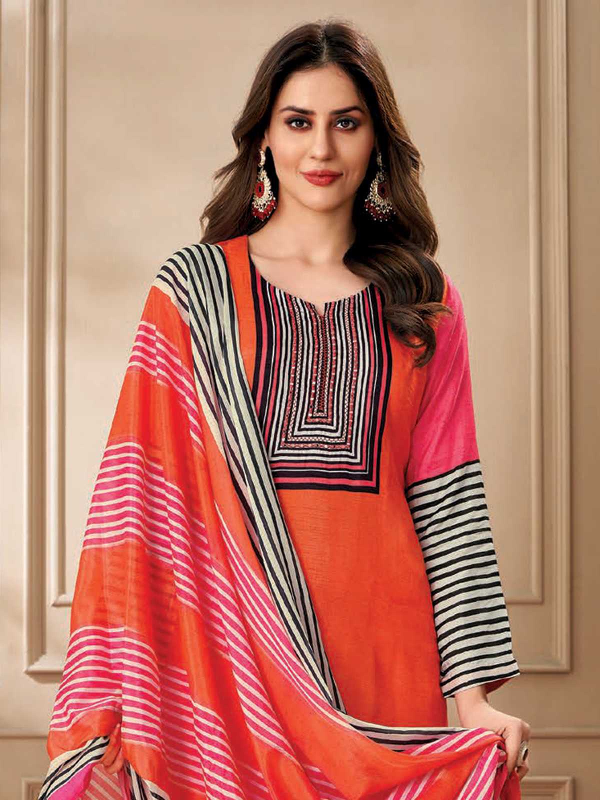 Traditional with a modern twist, this orange salwar suit stands out with its intricate floral prints. The classic round neck and quarter sleeves keep the look timeless, complemented by the matching pant and dupatta.