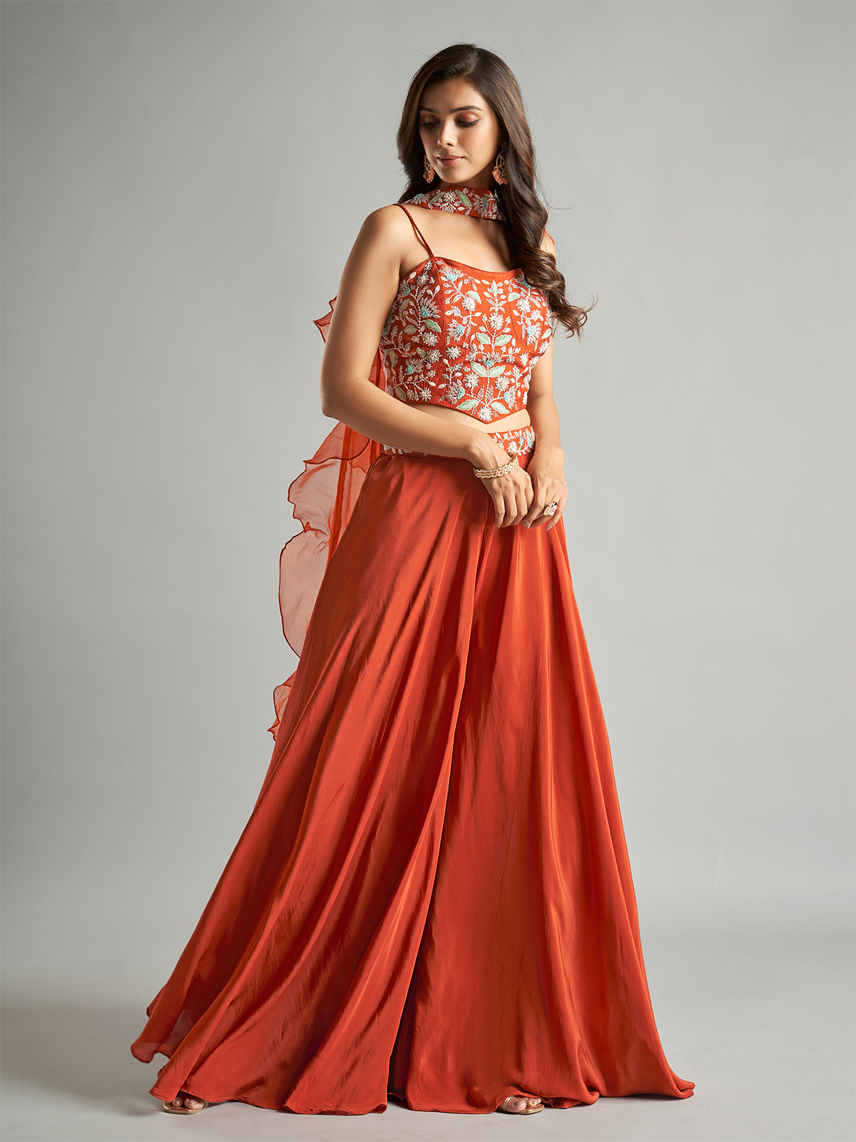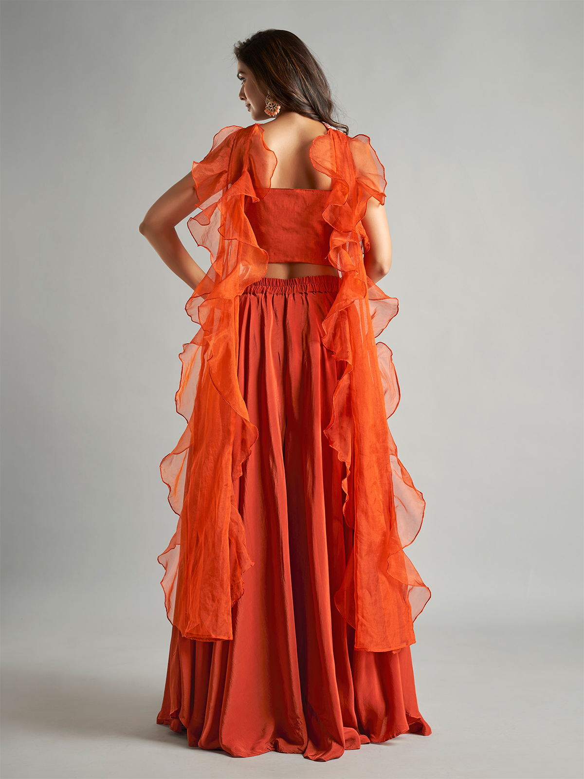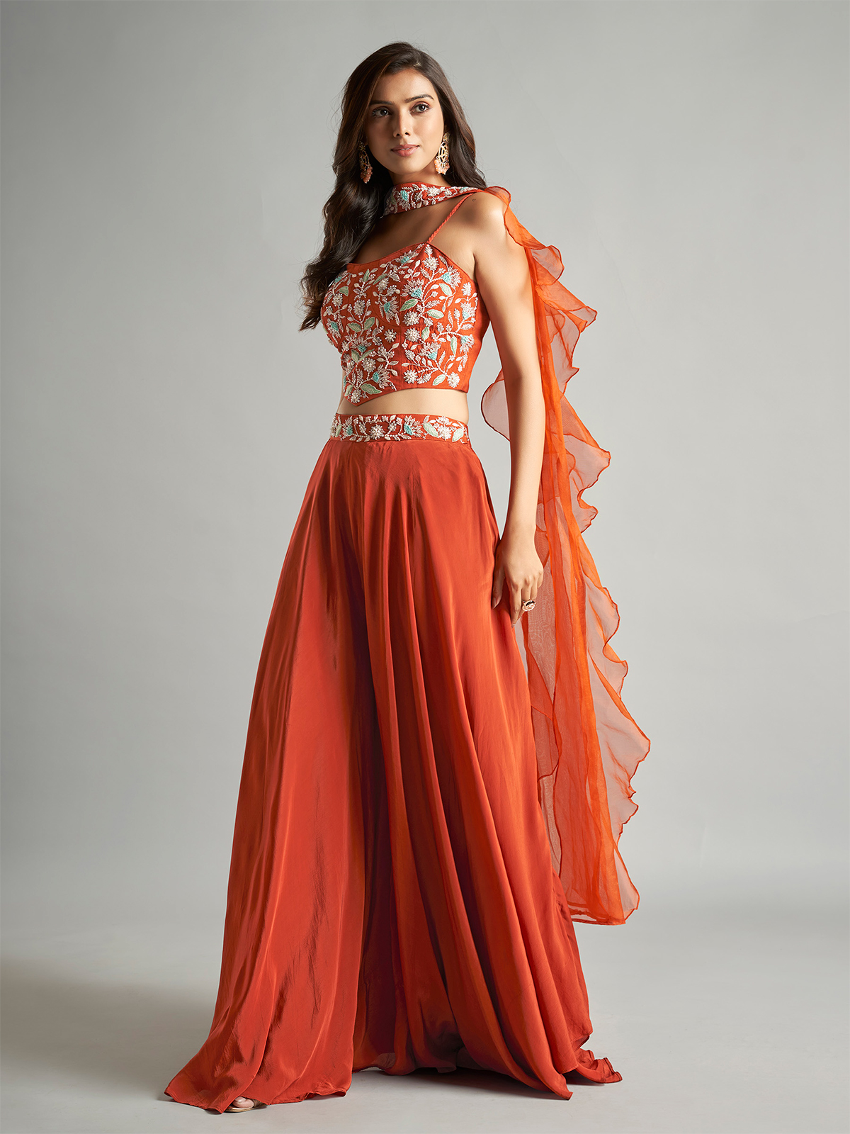 Enhance your ethnic wardrobe with this stunning brown silk palazzo suit. Featuring embroidery, beads, and zardosi work, it comes with a choker ruffle dupatta, making it a perfect seasonal choice.