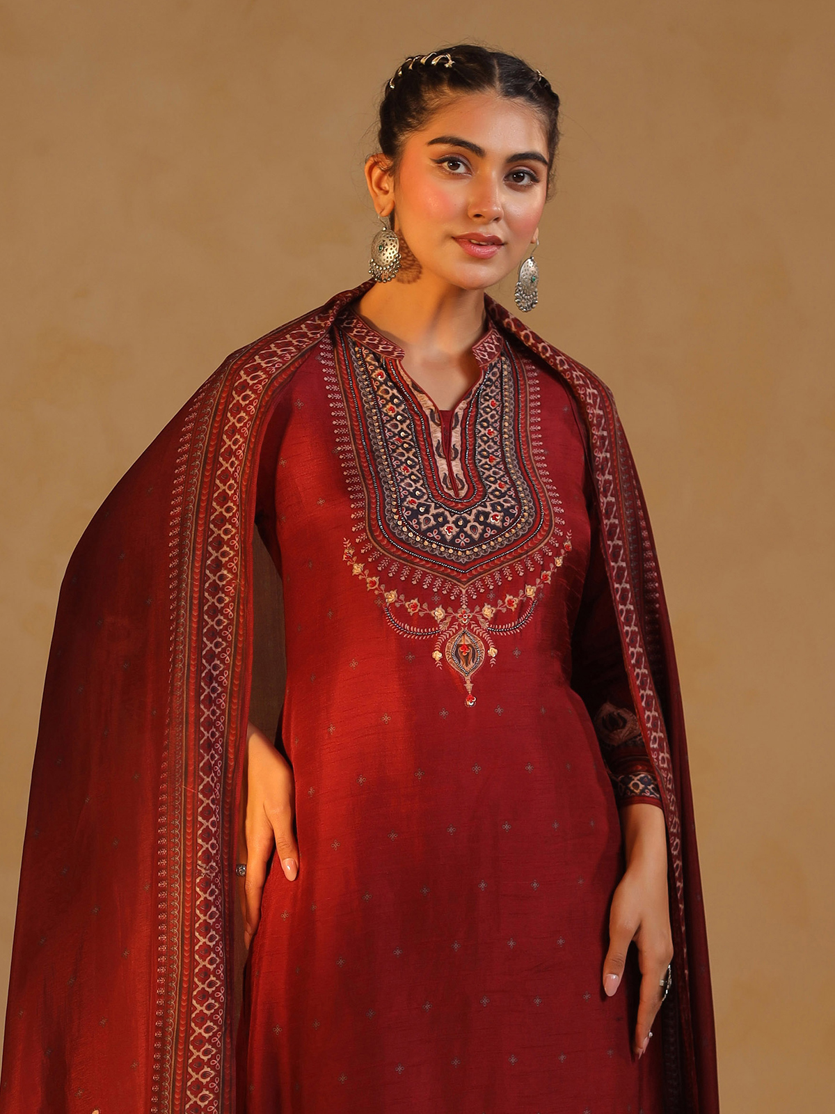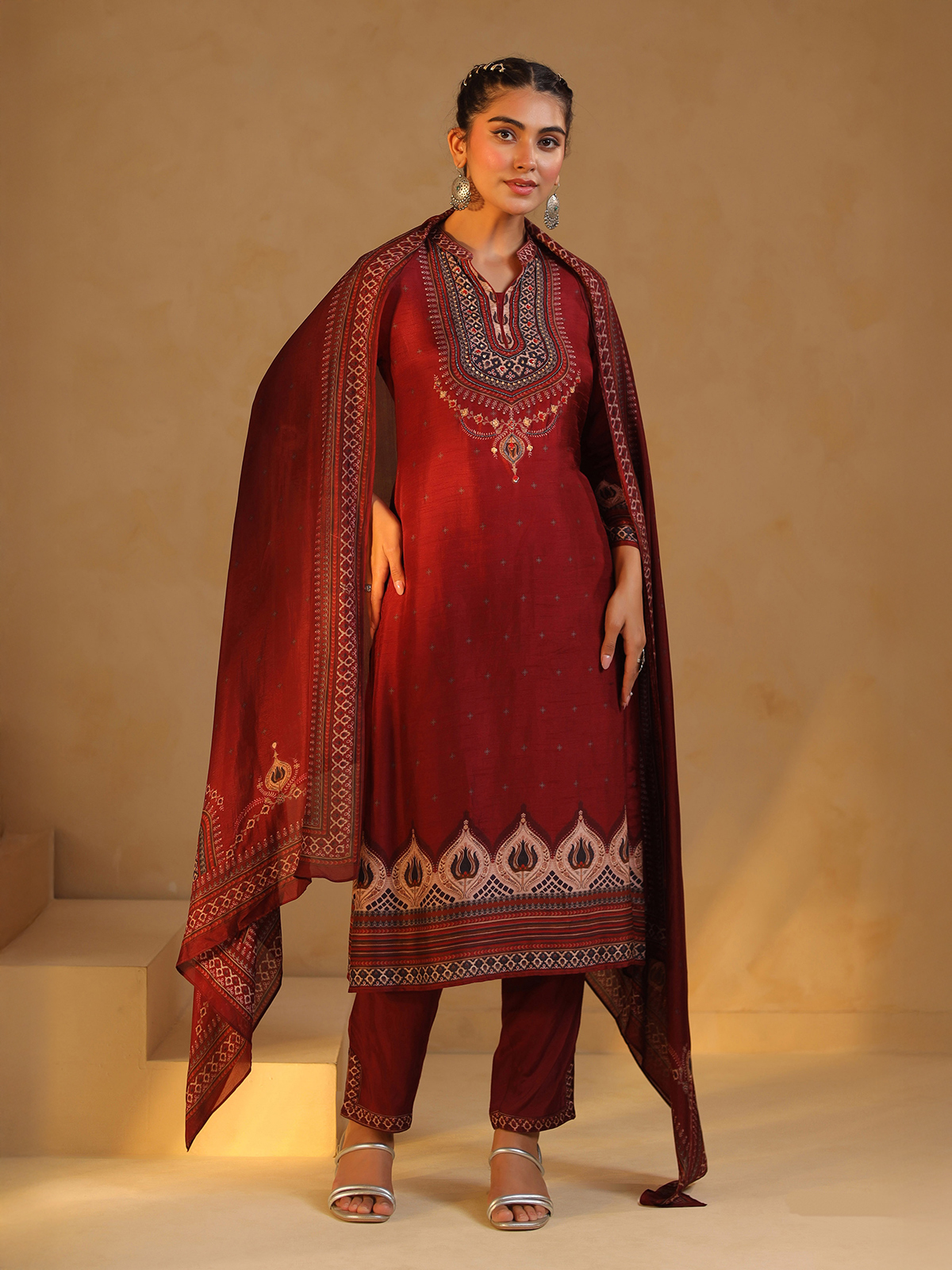 A brown silk printed salwar suit highlighted with sequins, thread, and bead accents. Styled with a stand neckline and quarter sleeves, it comes with pant and dupatta. A refined festive outfit exuding earthy warmth and traditional charm.