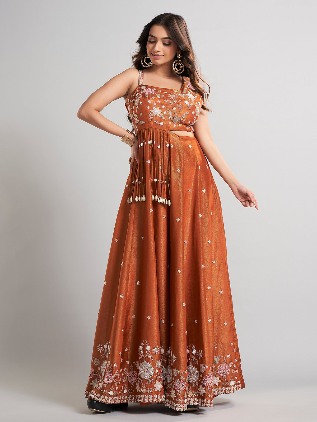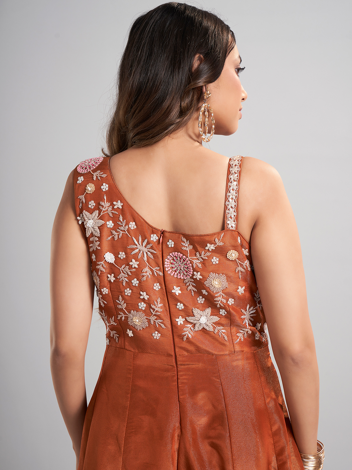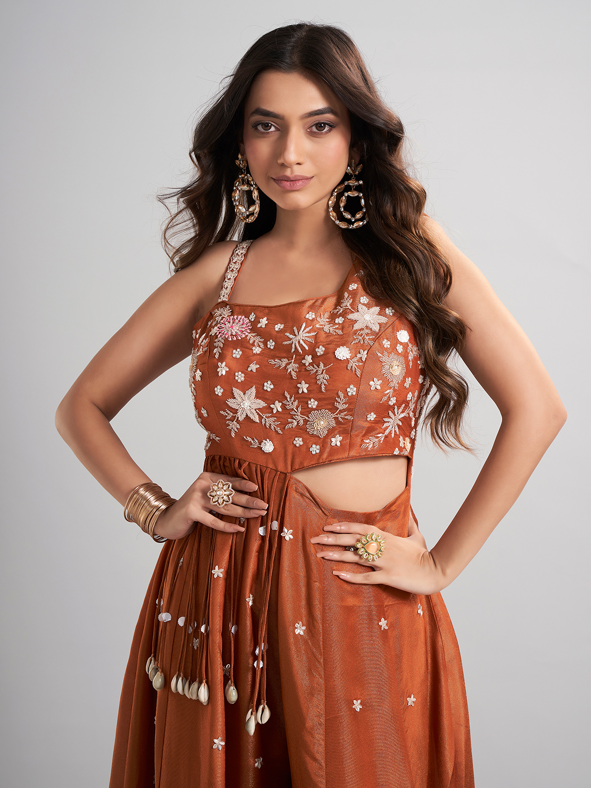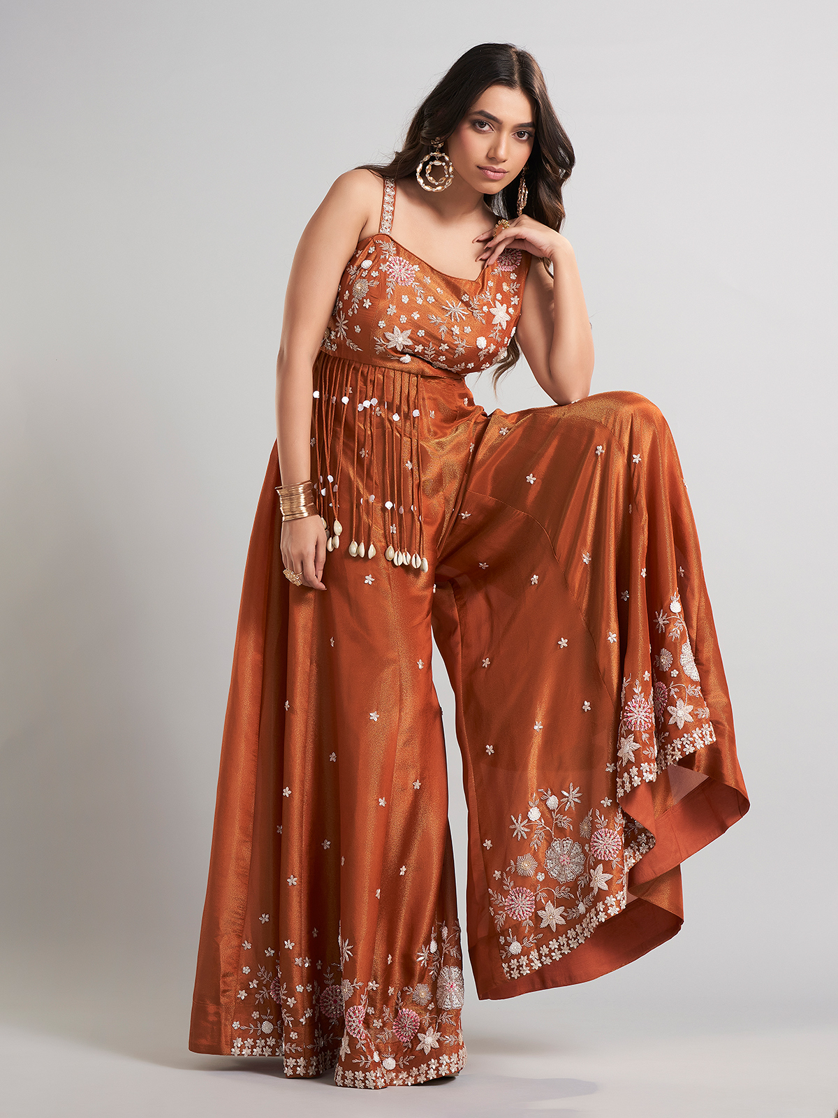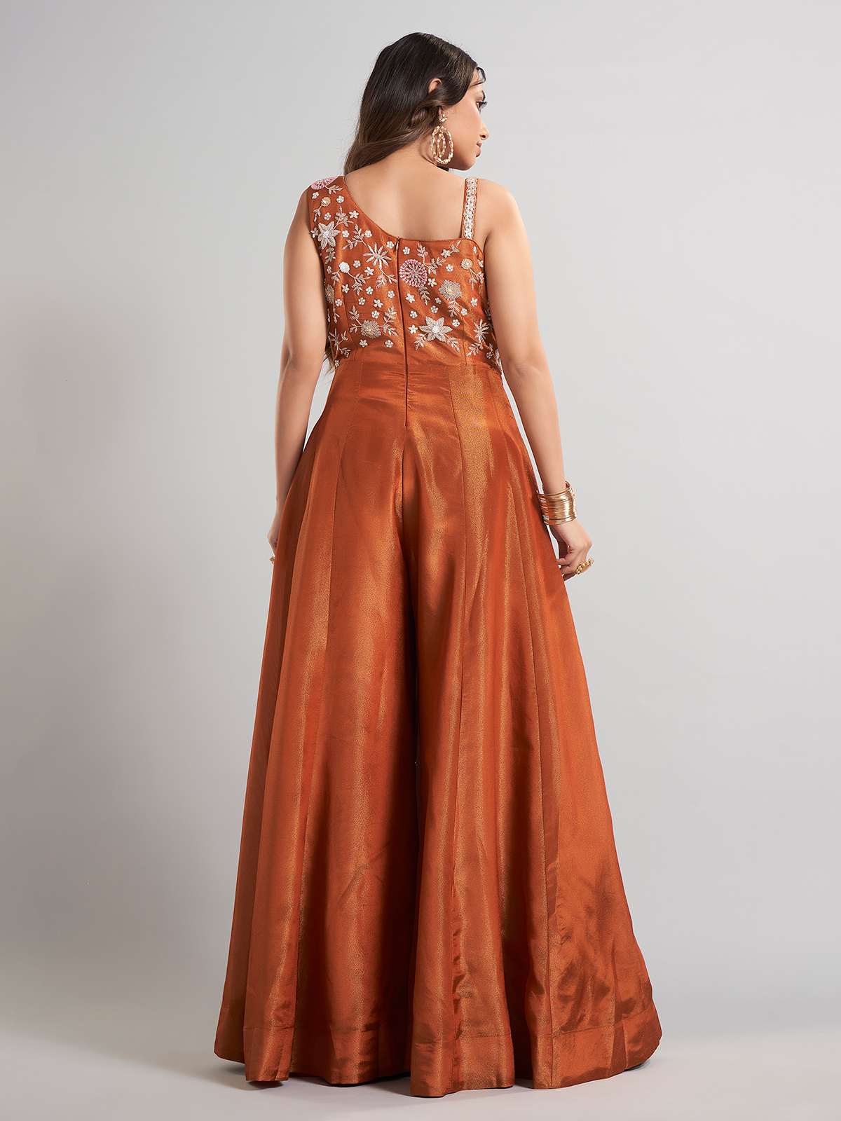 This brown silk jumpsuit dazzles with embellishments of sequins, pearls, cutdana, beads, thread, and zardosi. Its sleeveless, sleek design makes it a refined yet glamorous choice for wedding receptions and festive evenings.