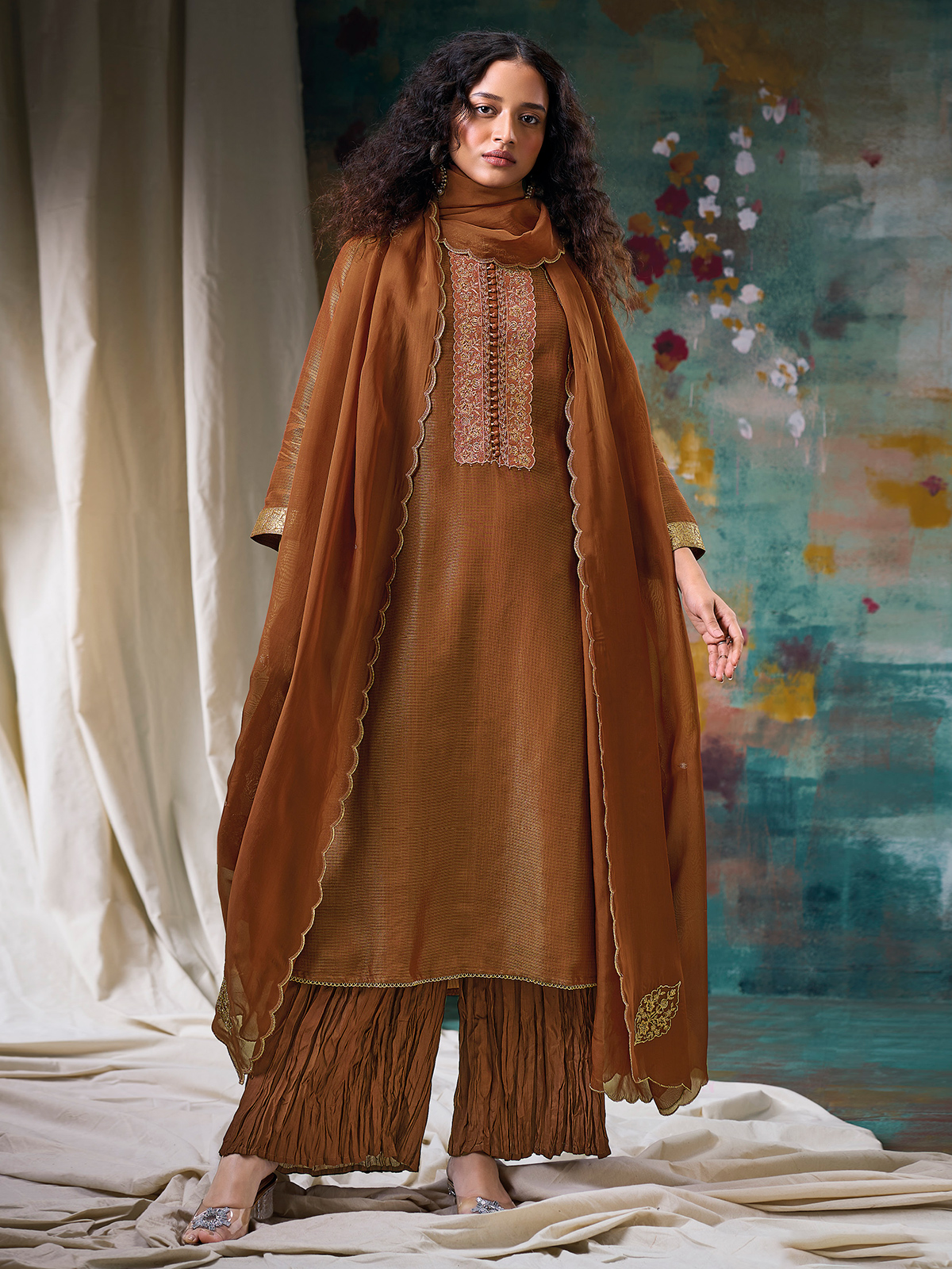 Celebrate ethnic fashion in this brown silk palazzo ensemble. Adorned with intricate resham and embroidery work, it features a round neck, quarter sleeves, and a flowing dupatta an excellent choice for family gatherings or special cultural days.