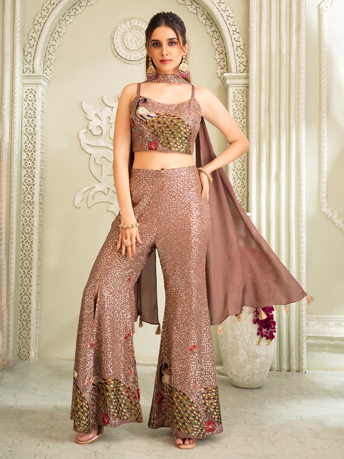 Classic and graceful, this brown silk palazzo suit highlights resham and sequin embroidery in a sleeveless style, tailored for cultural evenings and festive wear. Comes with a dupatta.