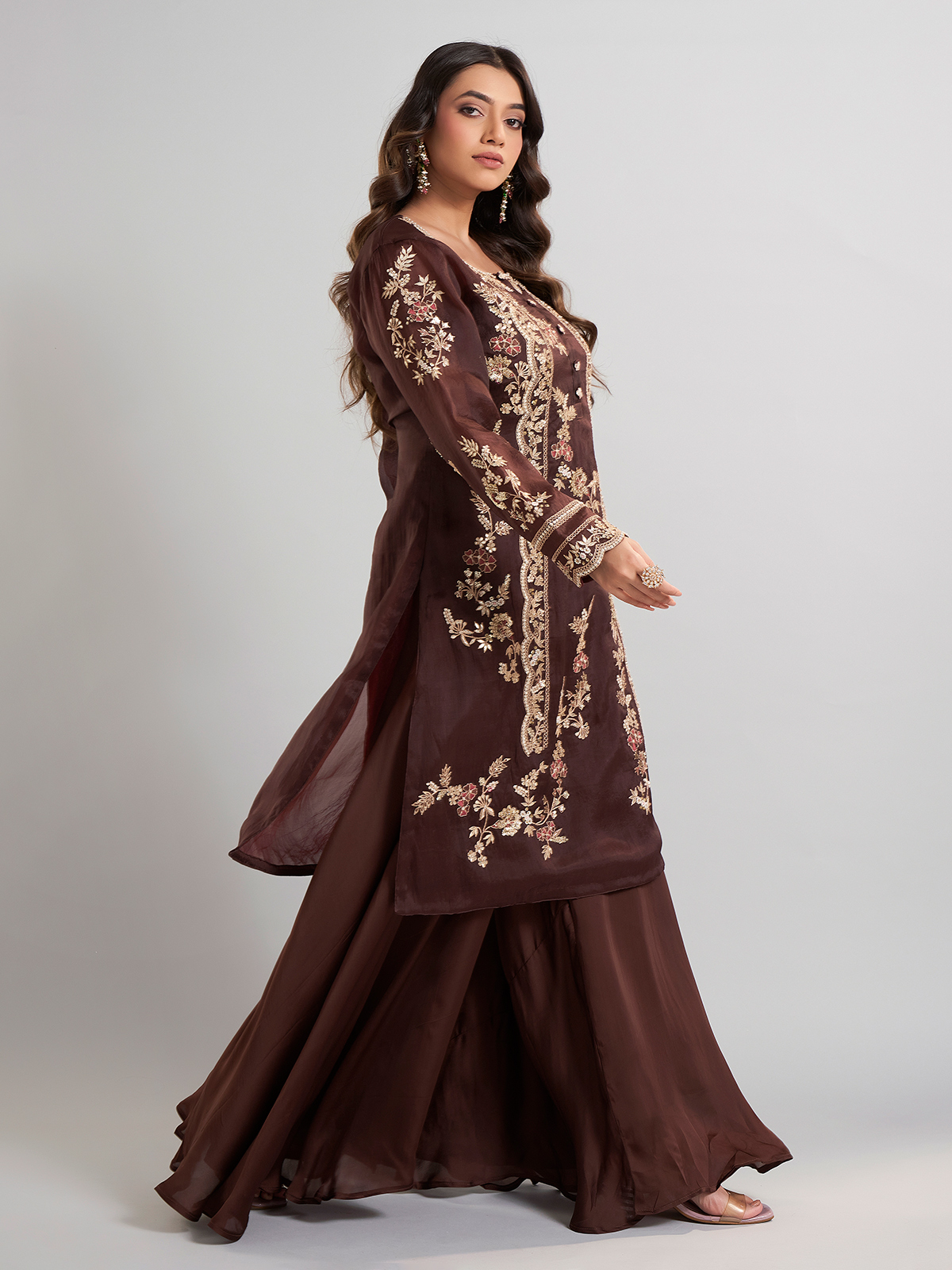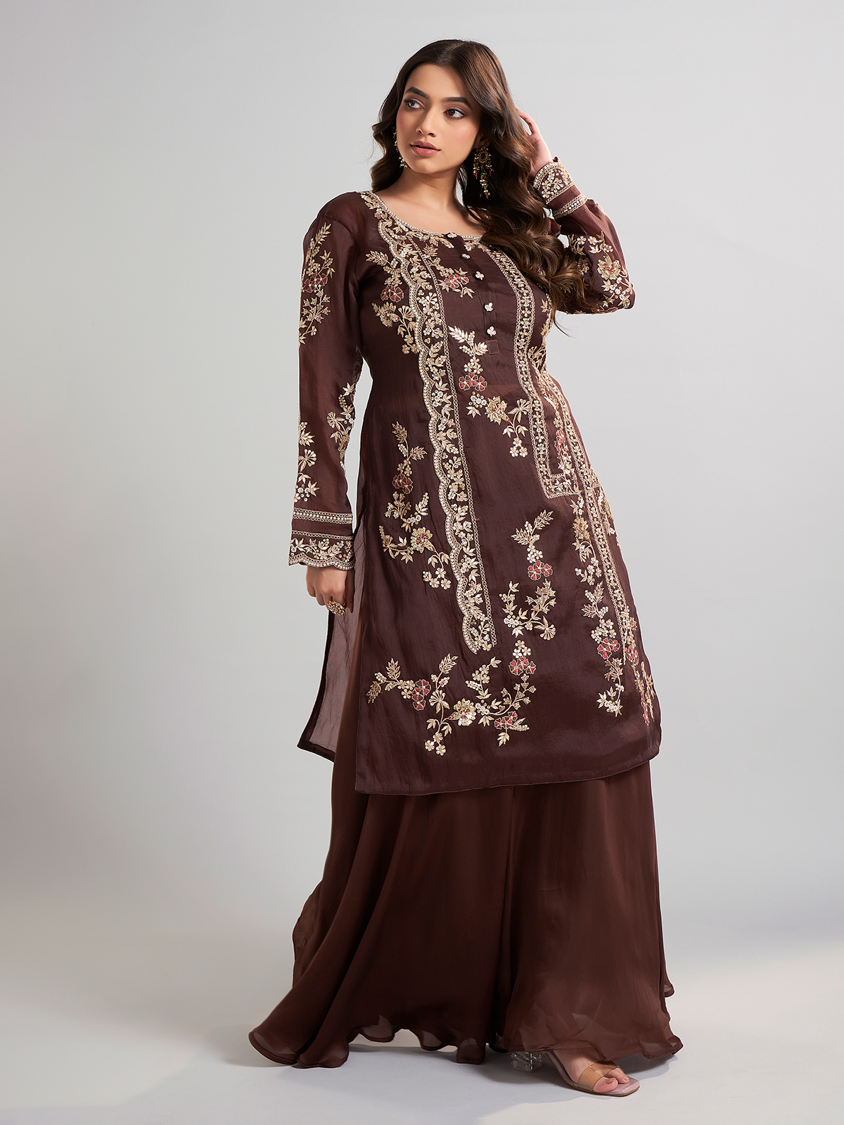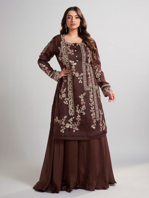 Brown Tissue And Satin Silk Pakistani Palazzo Ensemble