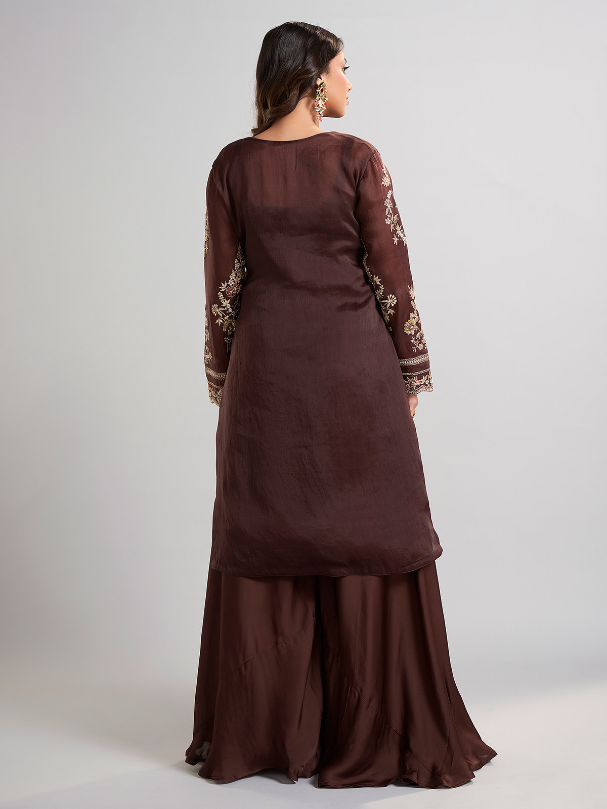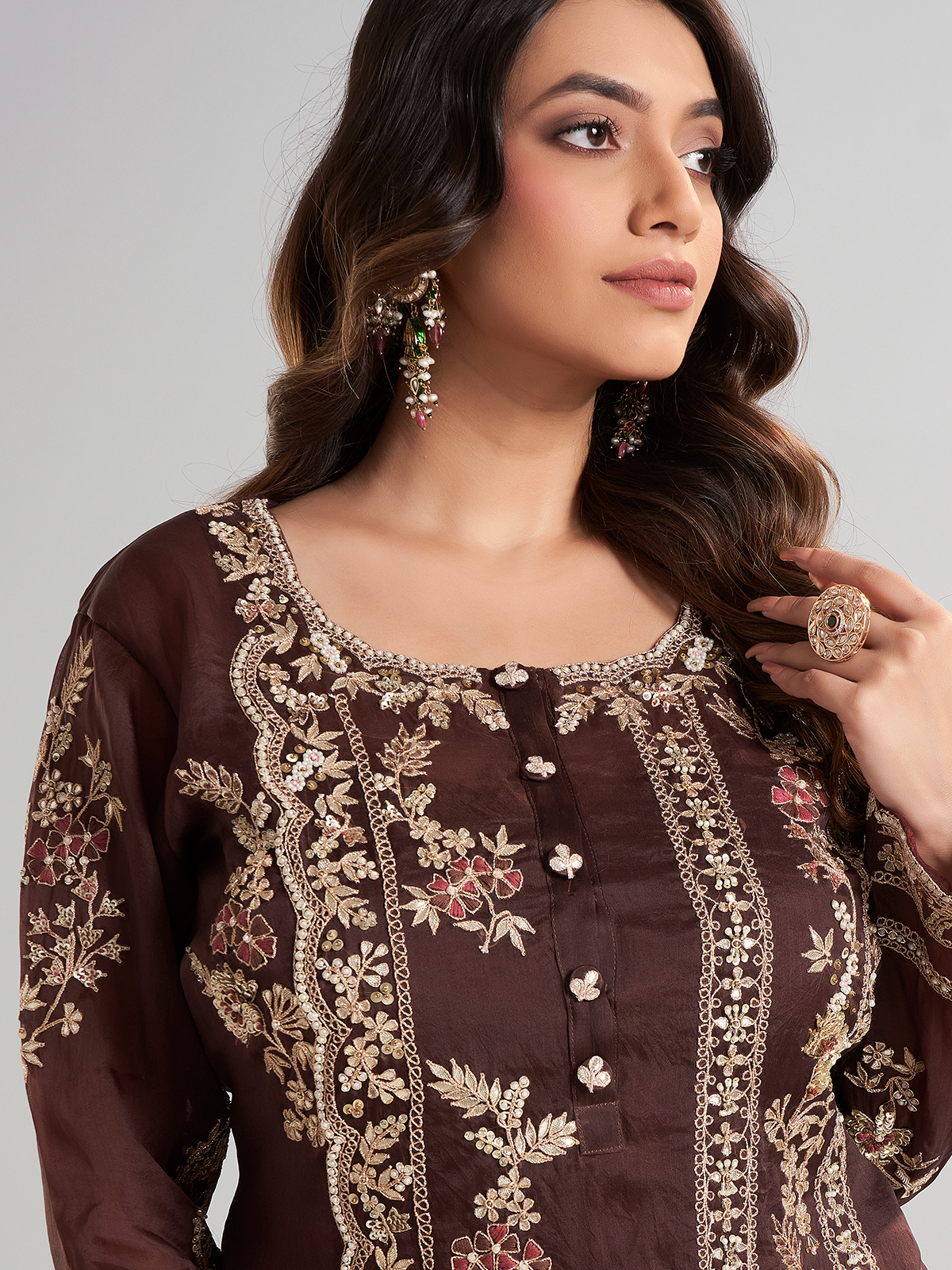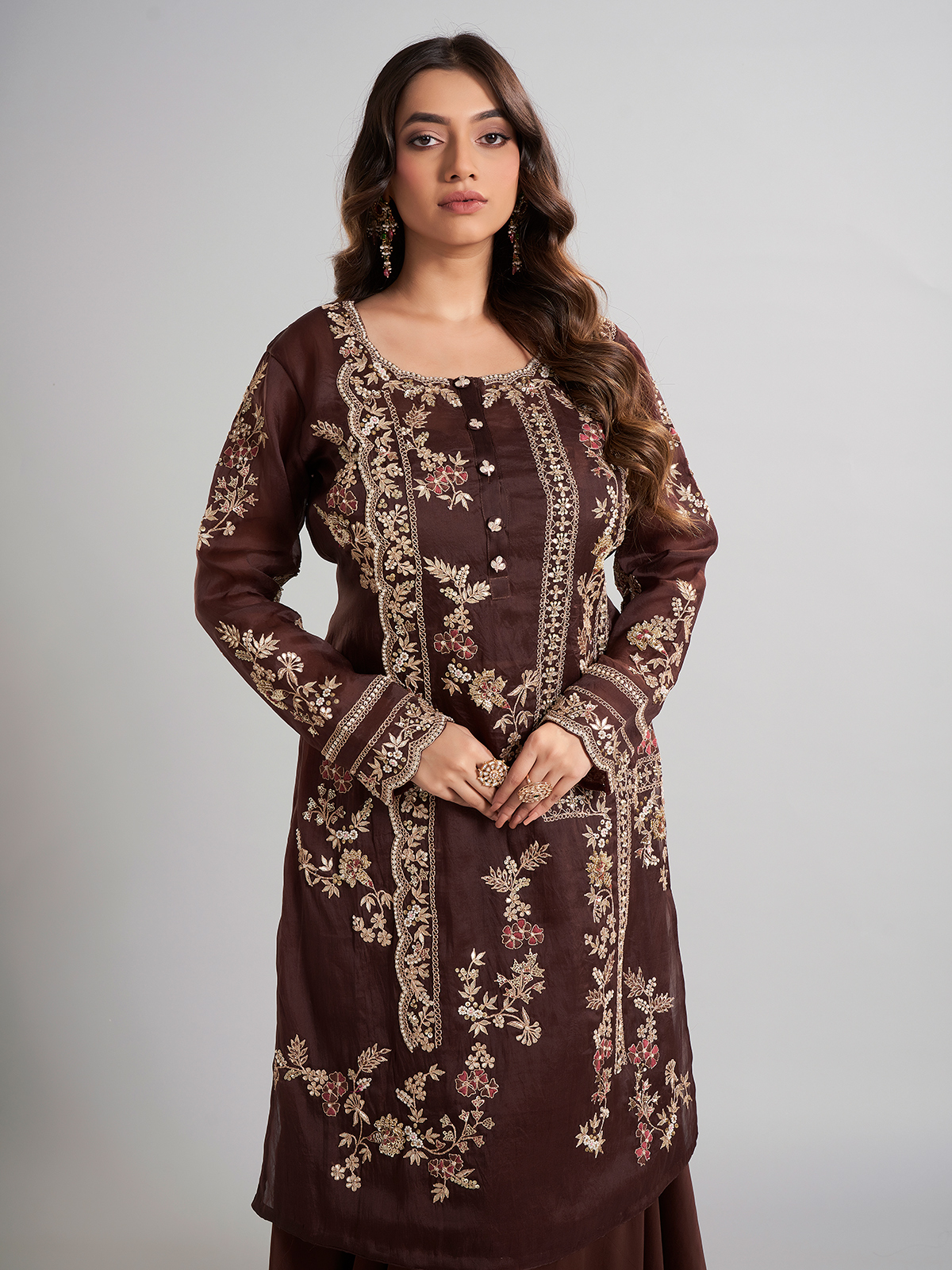 Brown Tissue And Satin Silk Pakistani Palazzo Ensemble