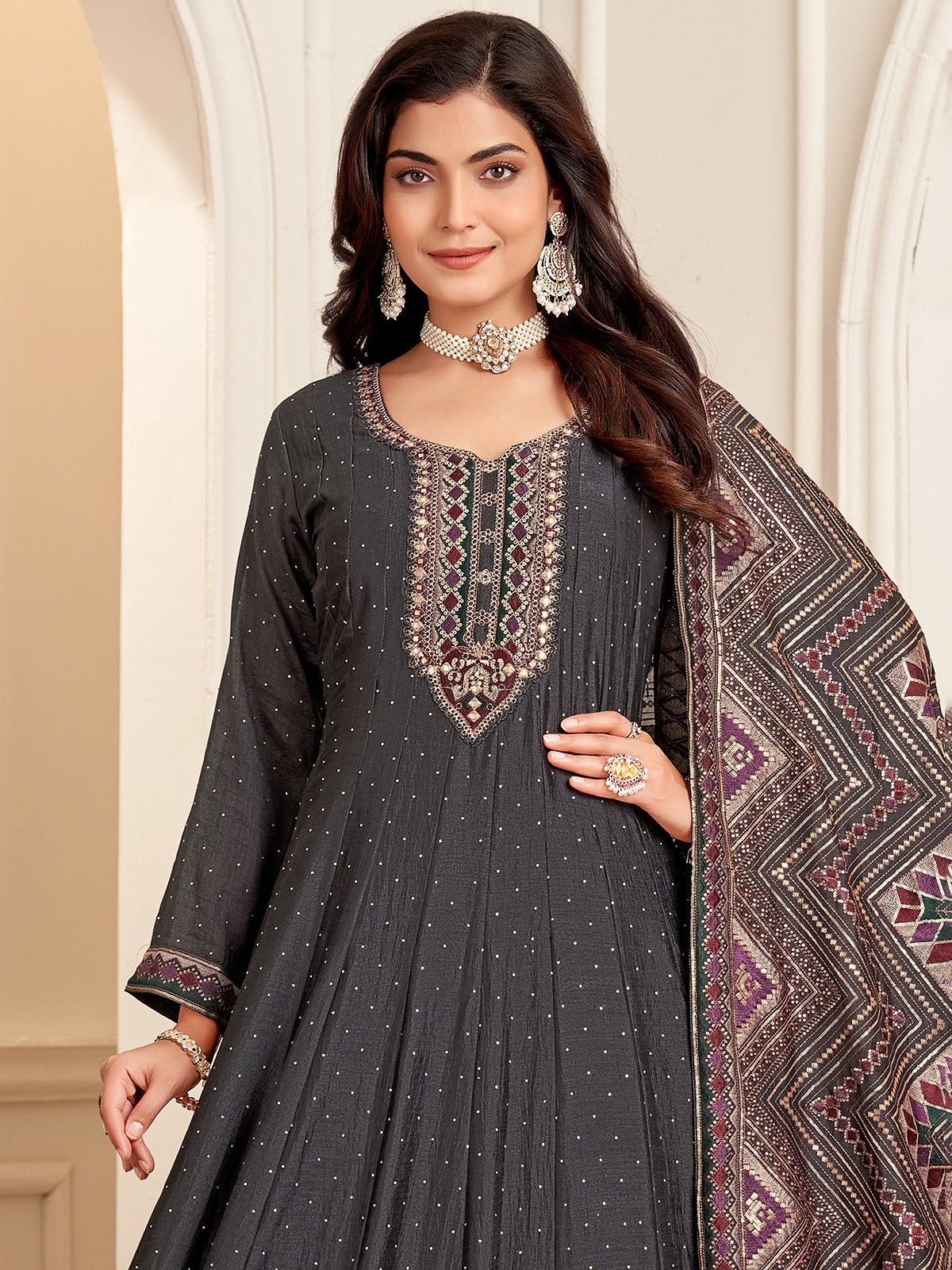 A regal charcoal black silk Anarkali graced with embroidery, sequins, aabla, and stone embellishments. Paired with a flowing dupatta, this sweetheart-neck, full-sleeved ensemble radiates timeless elegance, making it a perfect pick for weddings and festive occasions.